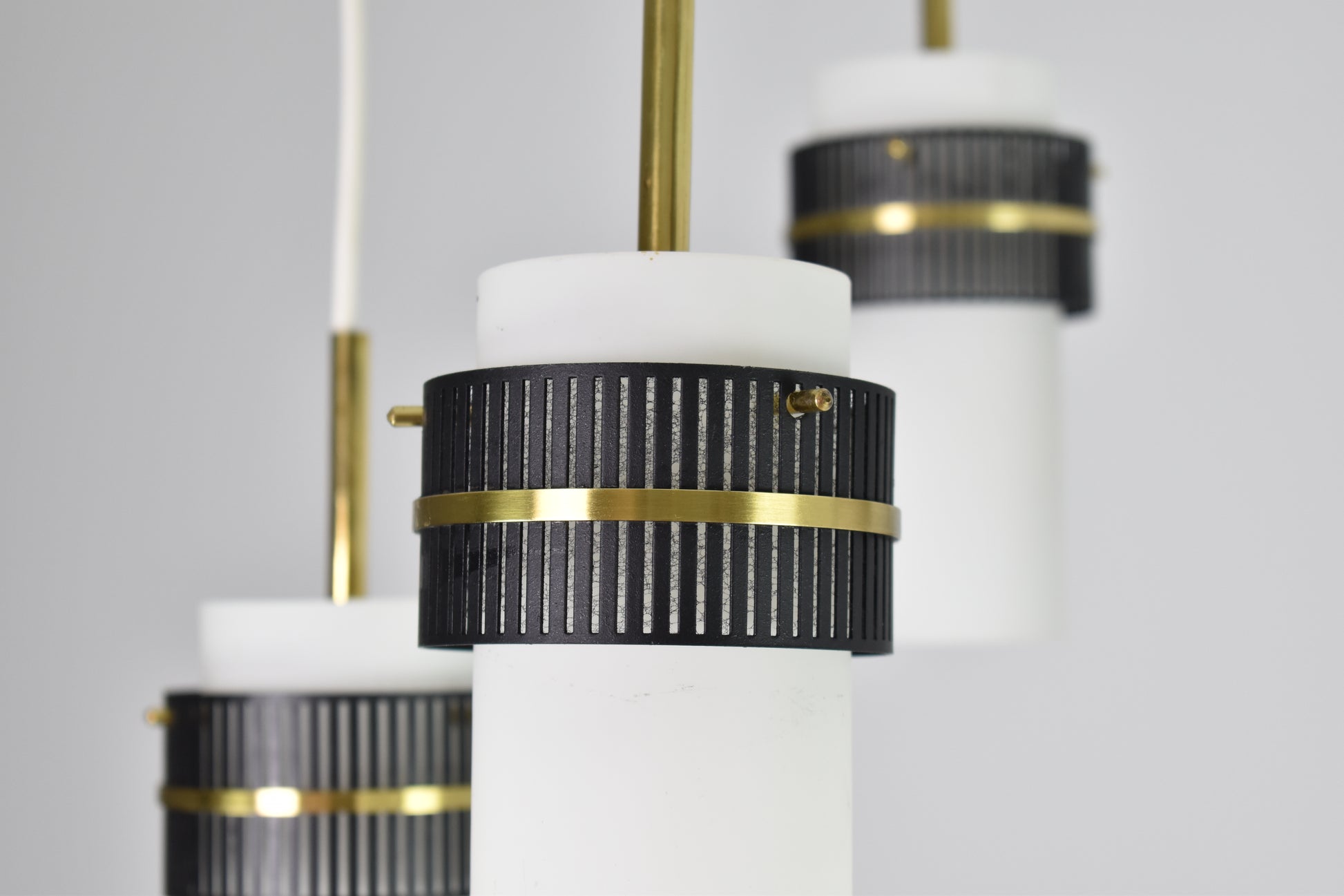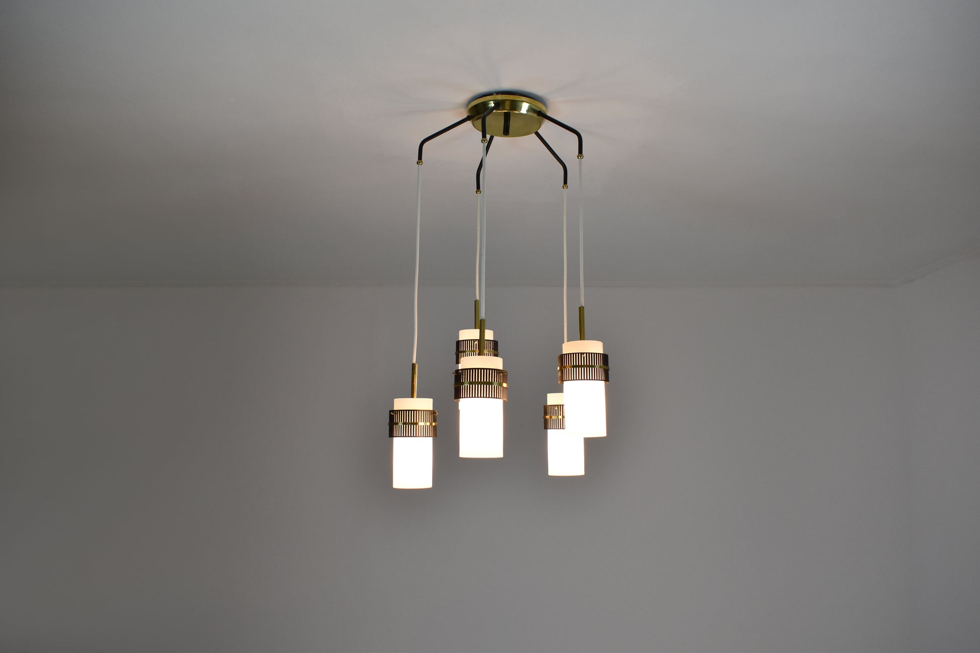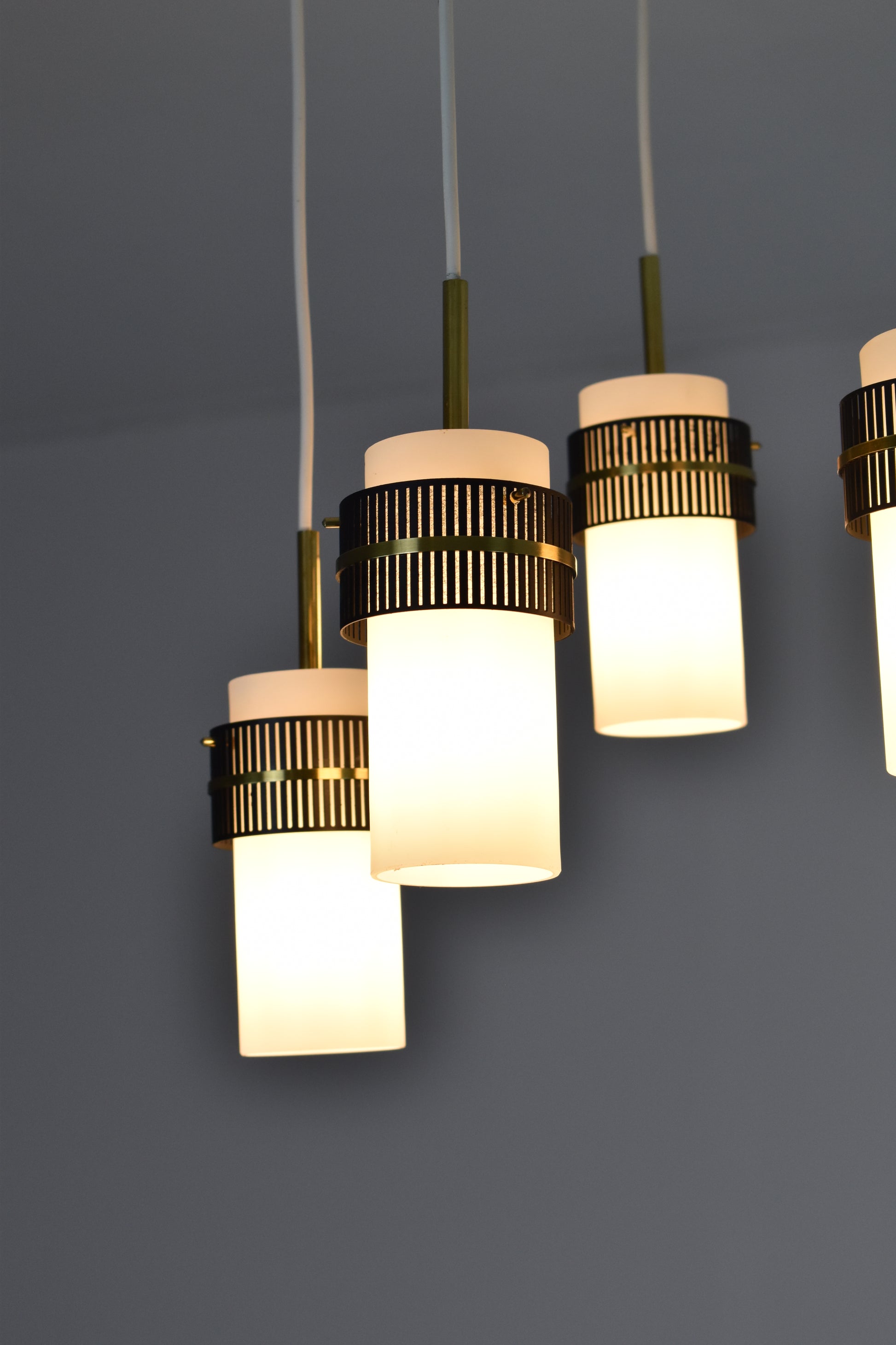Un élégant lustre ou suspension vintage des années 1950, inspiré de Stilnovo, du XXe siècle. Cette pièce maîtresse se compose de cinq lumières aux abat-jour en verre opalin, rehaussés de superbes détails perforés en laiton et métal noir qui maintiennent les abat-jour sur les fils. Un magnifique ajout moderne et de style milieu de siècle à tout espace de vie.
