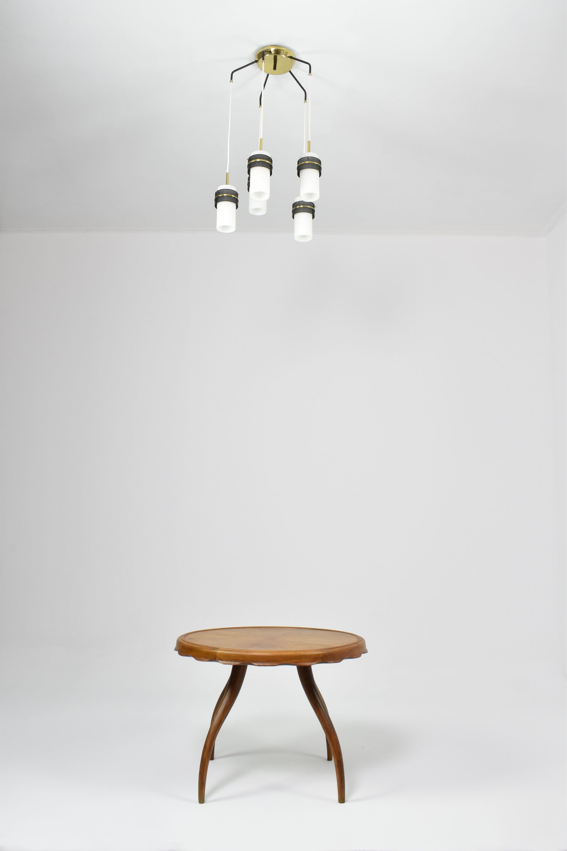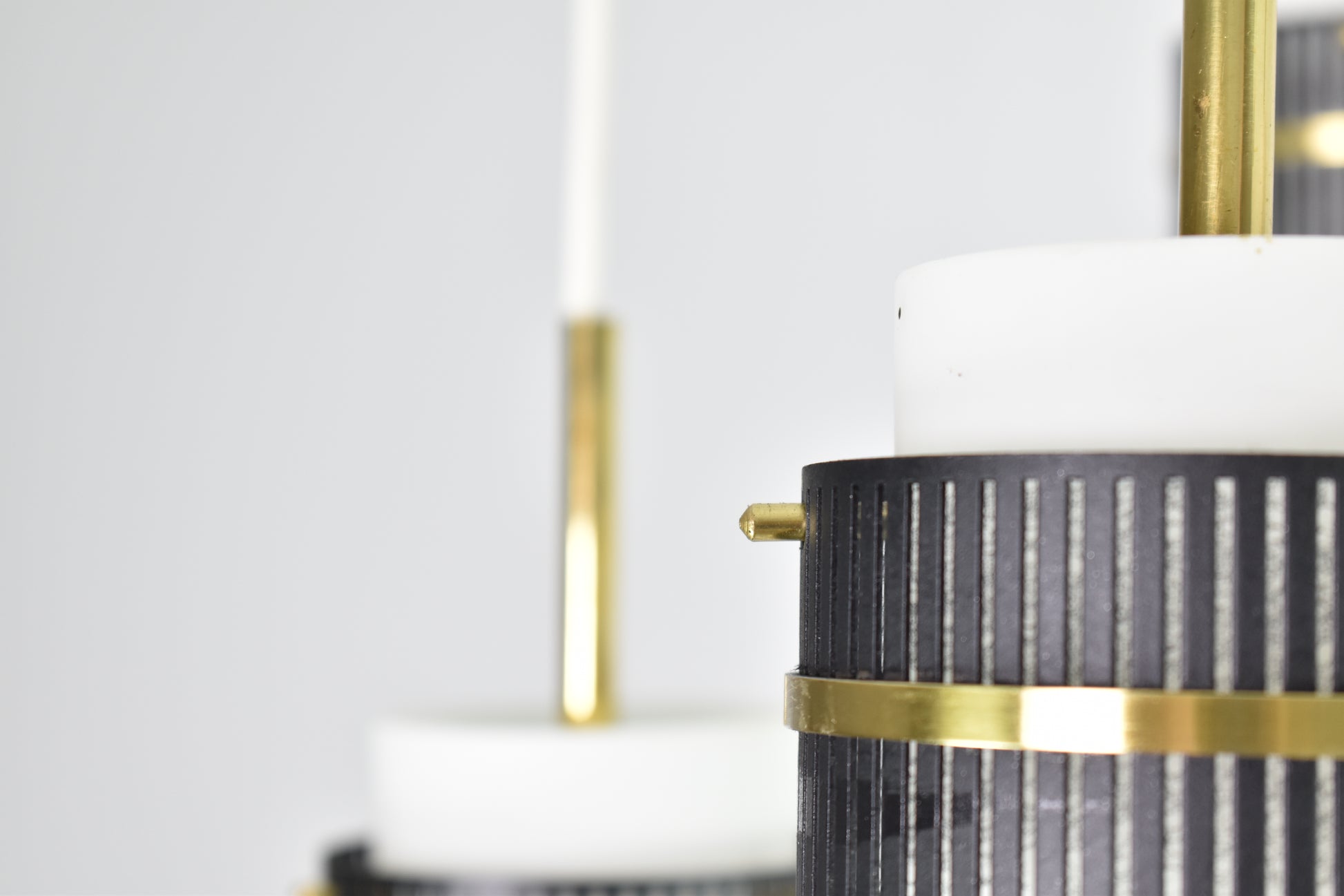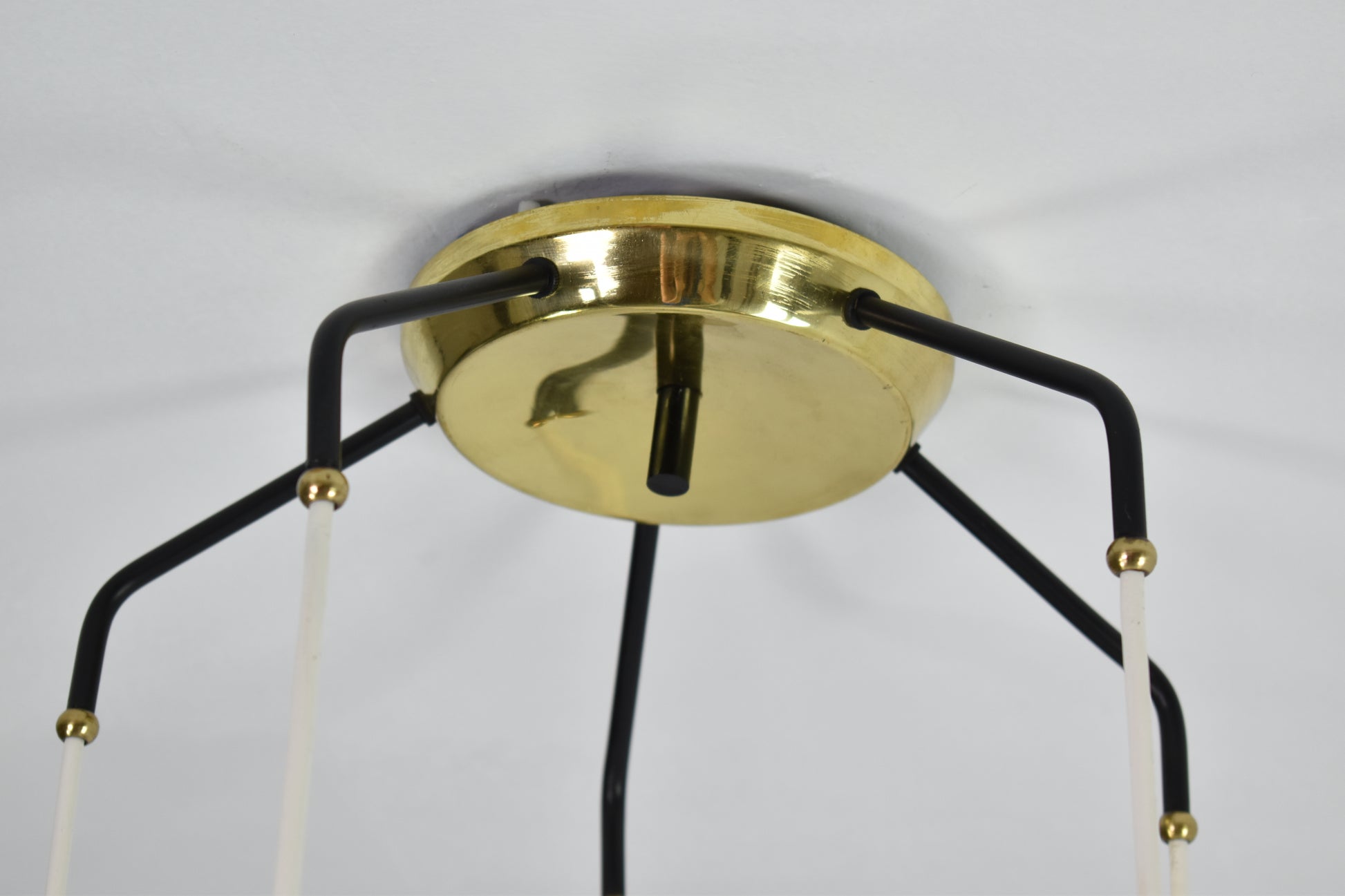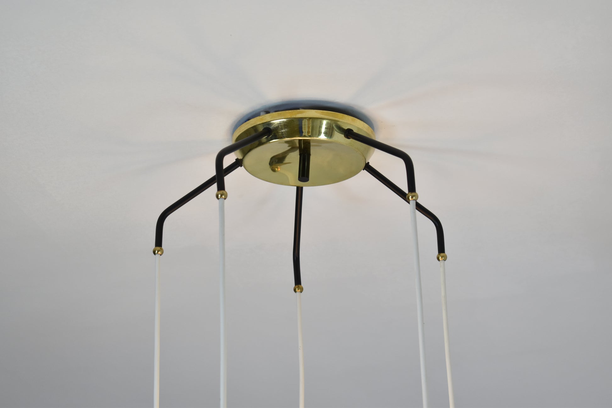 Un élégant lustre ou suspension vintage des années 1950, inspiré de Stilnovo, du XXe siècle. Cette pièce maîtresse se compose de cinq lumières aux abat-jour en verre opalin, rehaussés de superbes détails perforés en laiton et métal noir qui maintiennent les abat-jour sur les fils. Un magnifique ajout moderne et de style milieu de siècle à tout espace de vie.