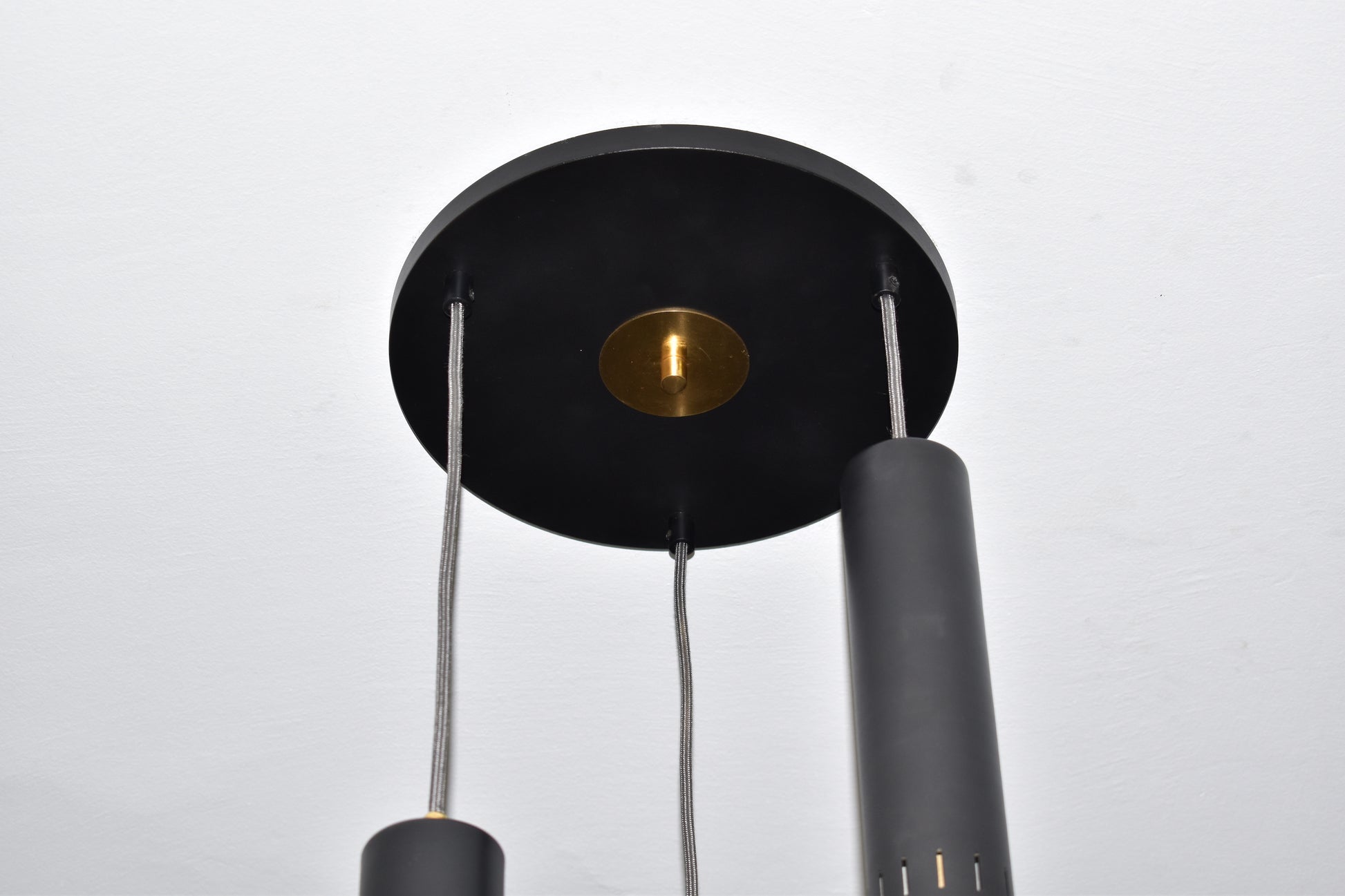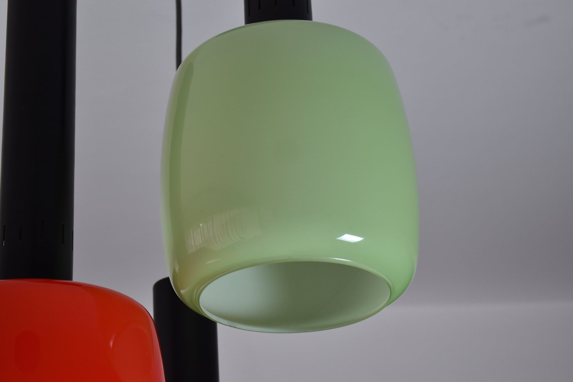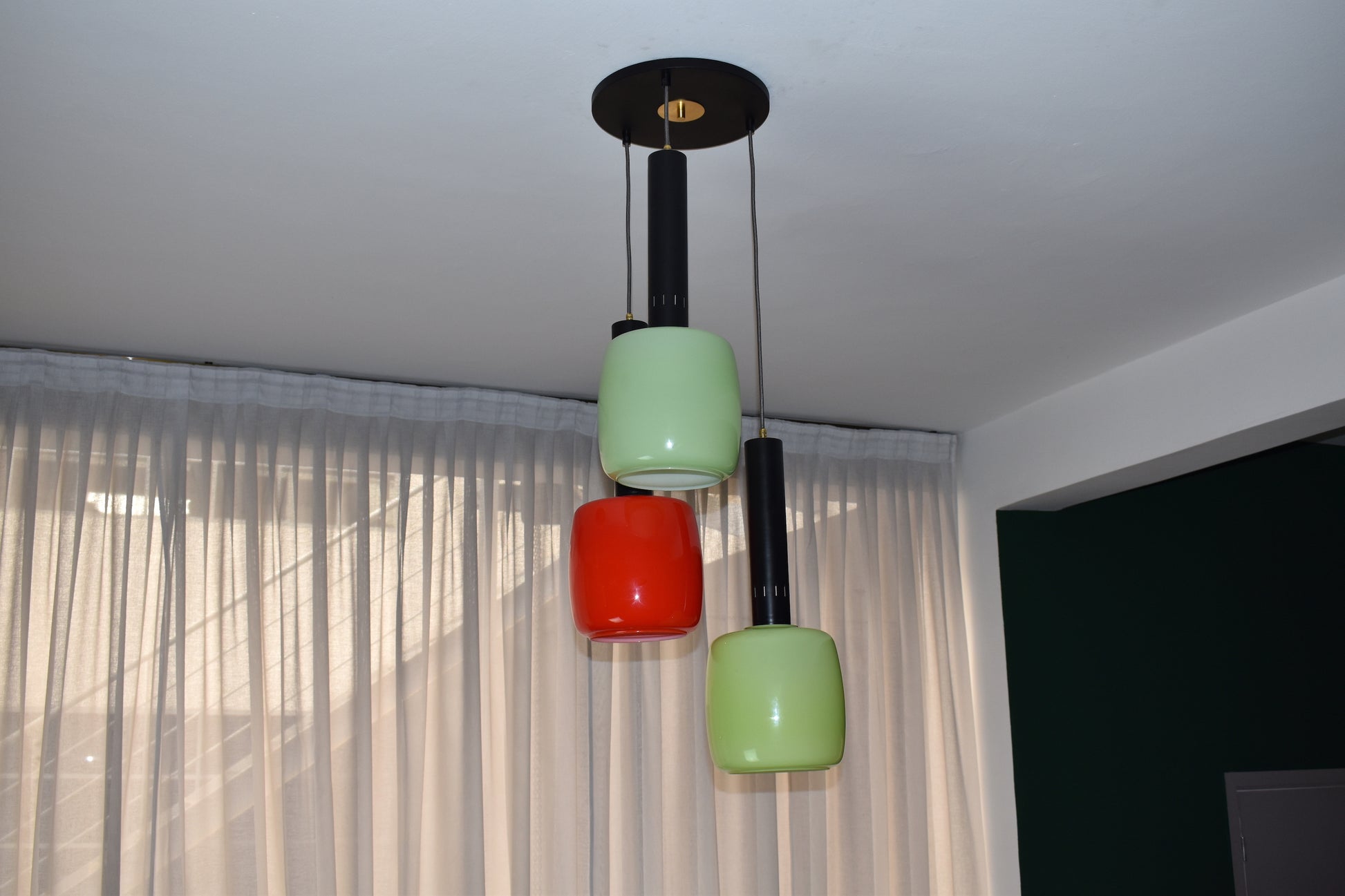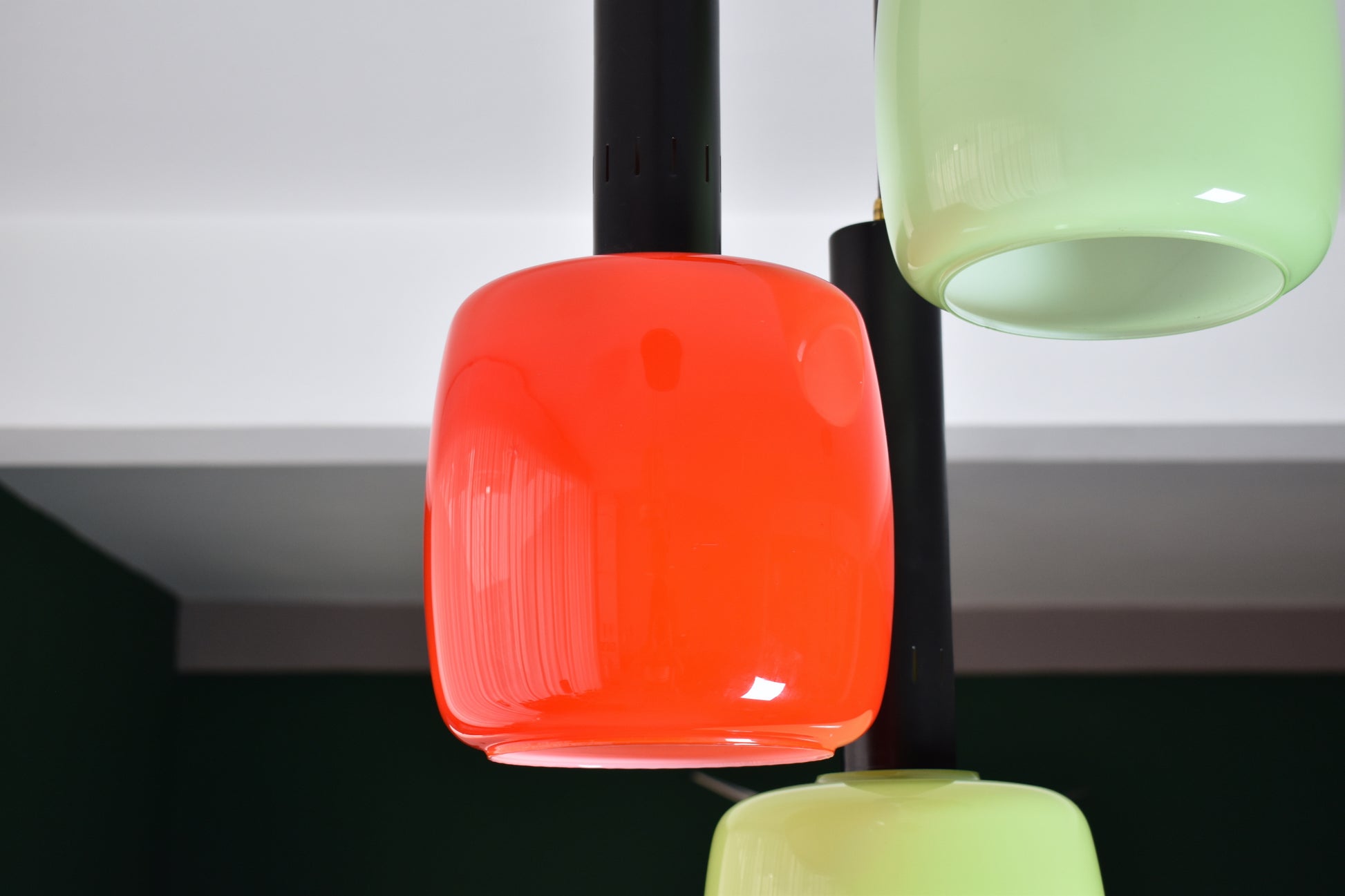 Suspension vintage du XXe siècle de Stilnovo composée de deux abat-jours en verre de Murano soufflé à la main vert pomme et d'un abat-jour rouge. La structure est composée de trois longs abat-jours en aluminium laqué noir. Italie. Vers les années 1950. Deux autres abat-jours en vert et jaune sont également disponibles.