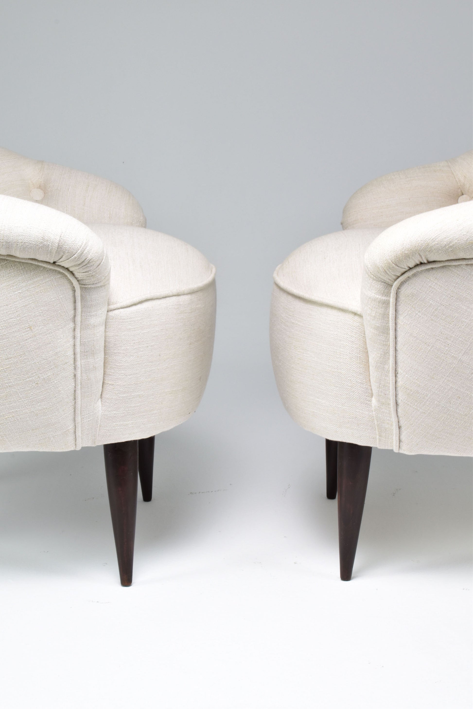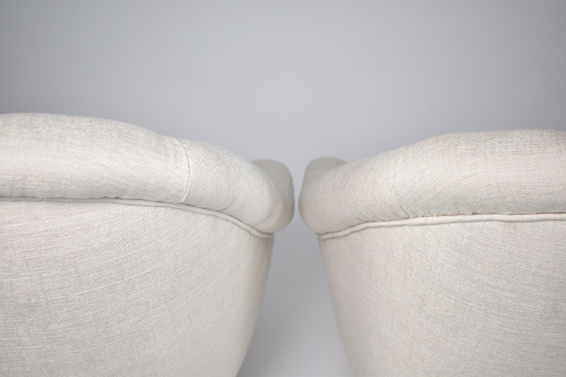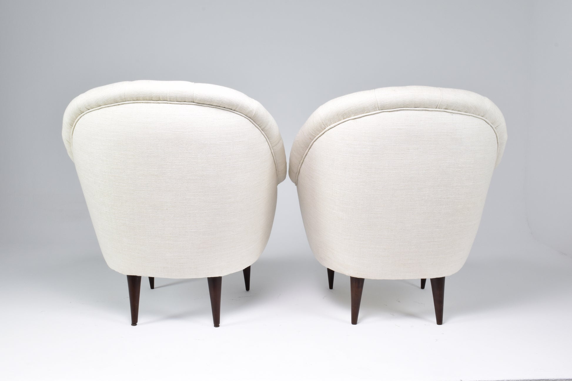 Ensemble de deux chaises longues ou fauteuils italiens fabriqués dans les années 1950 et attribués au légendaire designer Gio Ponti. Ces fauteuils soigneusement matelassés et courbés sont mis en valeur par leur profondeur confortable.