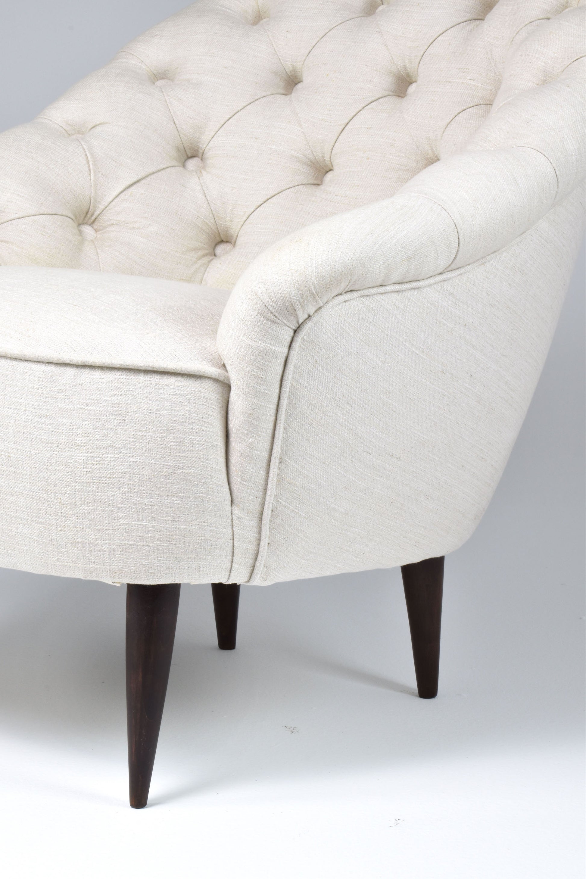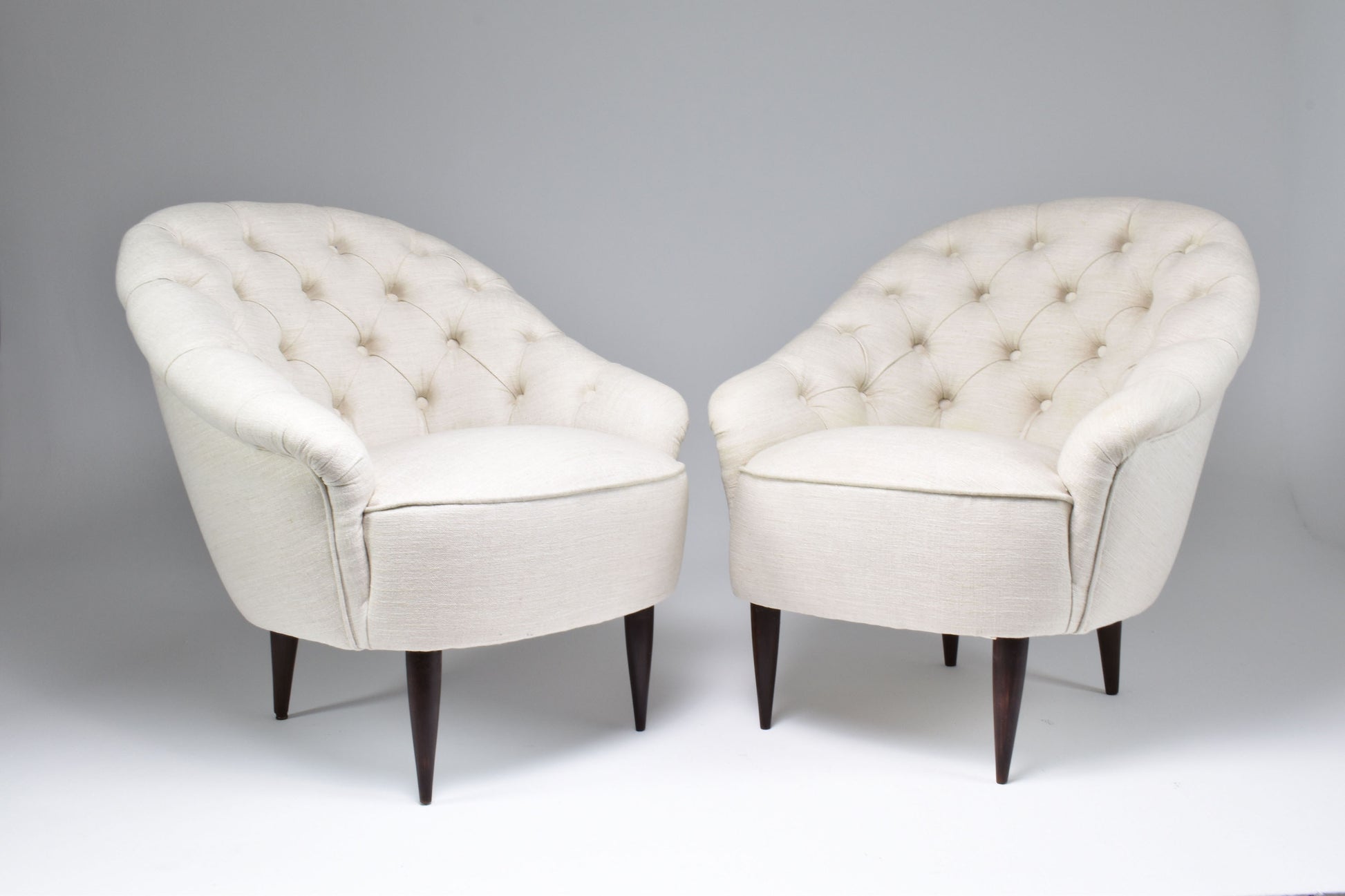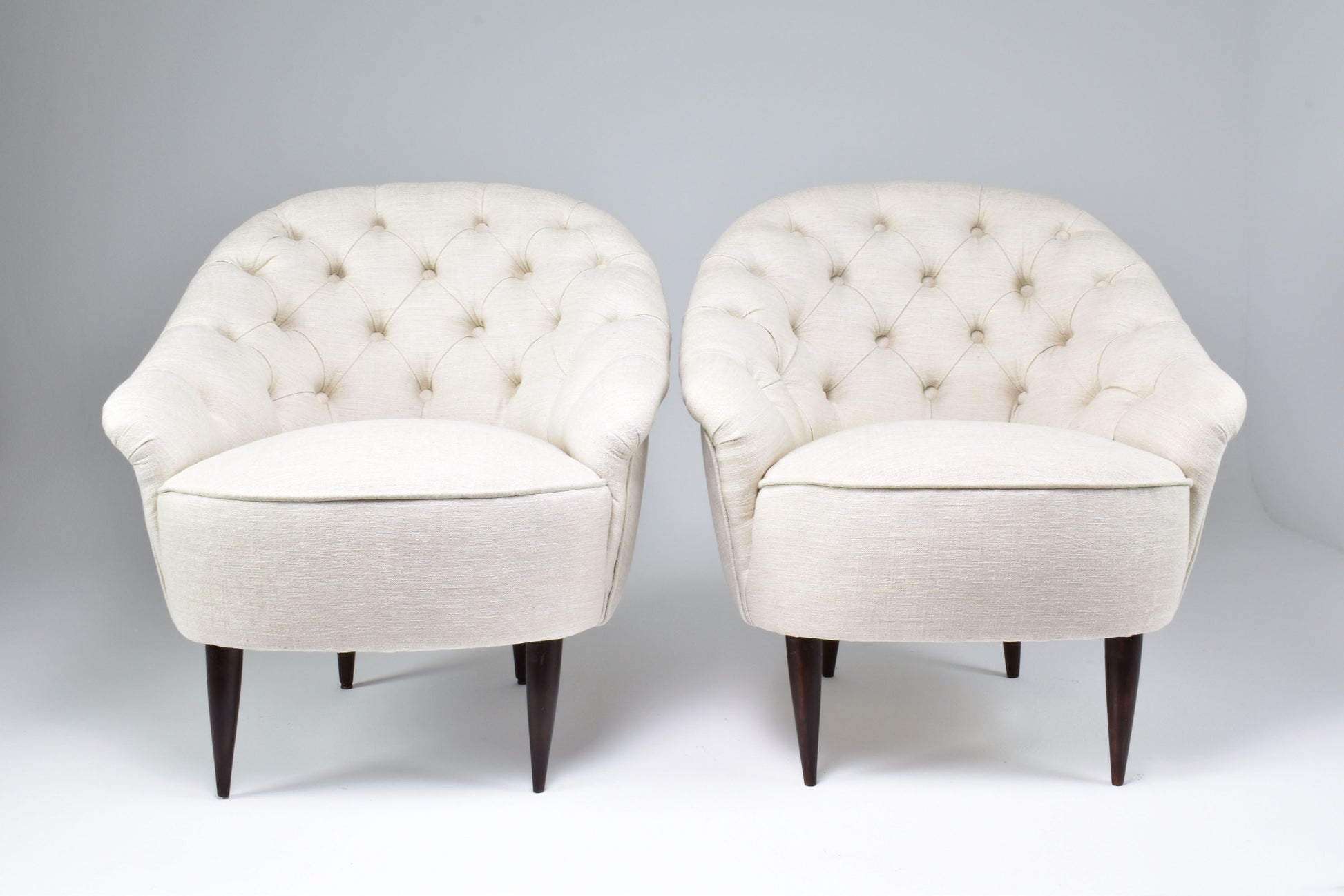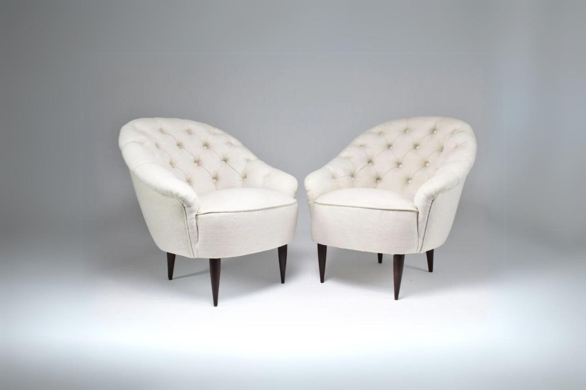 Ensemble de deux chaises longues ou fauteuils italiens fabriqués dans les années 1950 et attribués au légendaire designer Gio Ponti. Ces fauteuils soigneusement matelassés et courbés sont mis en valeur par leur profondeur confortable.