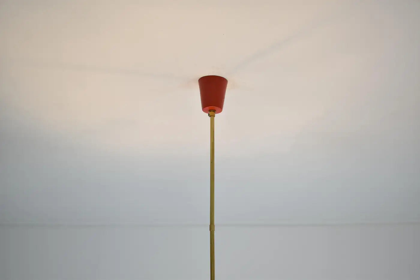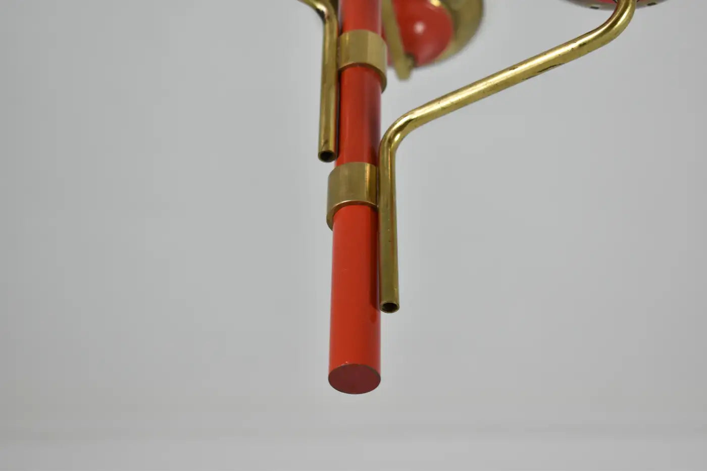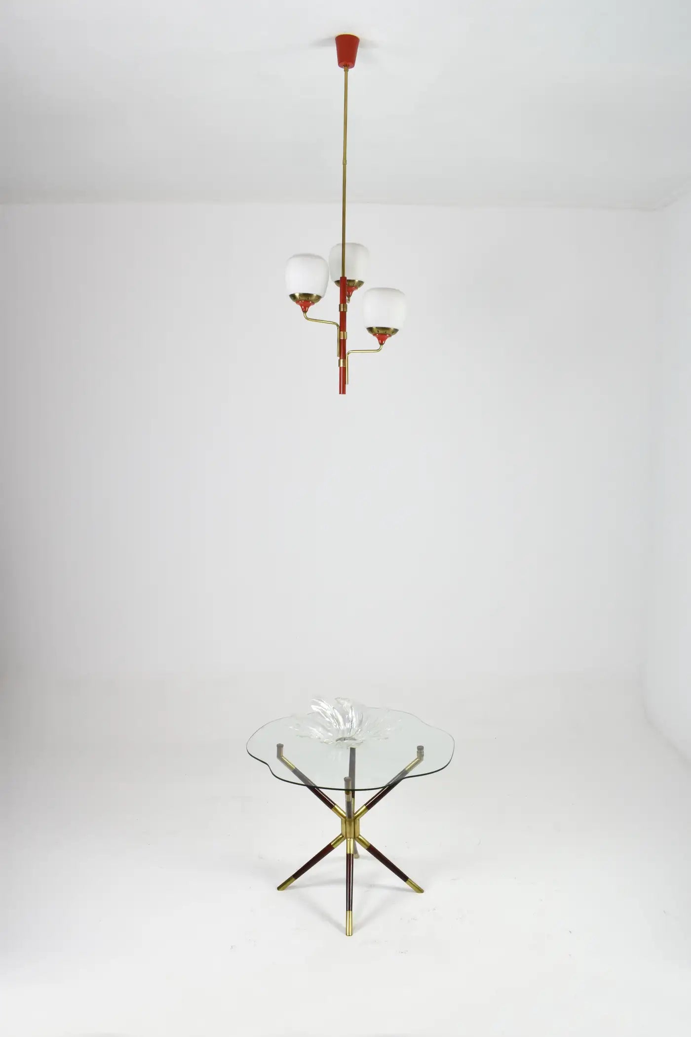 Pourquoi on l'adore : On est séduit par le contraste affirmé entre les globes opalins épurés et la laque rouge joyeuse, ancrée dans la chaleur du laiton vieilli. C'est une pièce rare, à la fois graphique et poétique, idéale au-dessus d'une table à manger ou comme élément central audacieux dans une entrée.