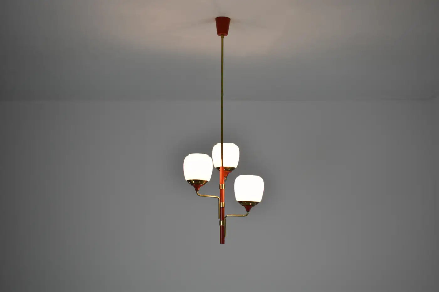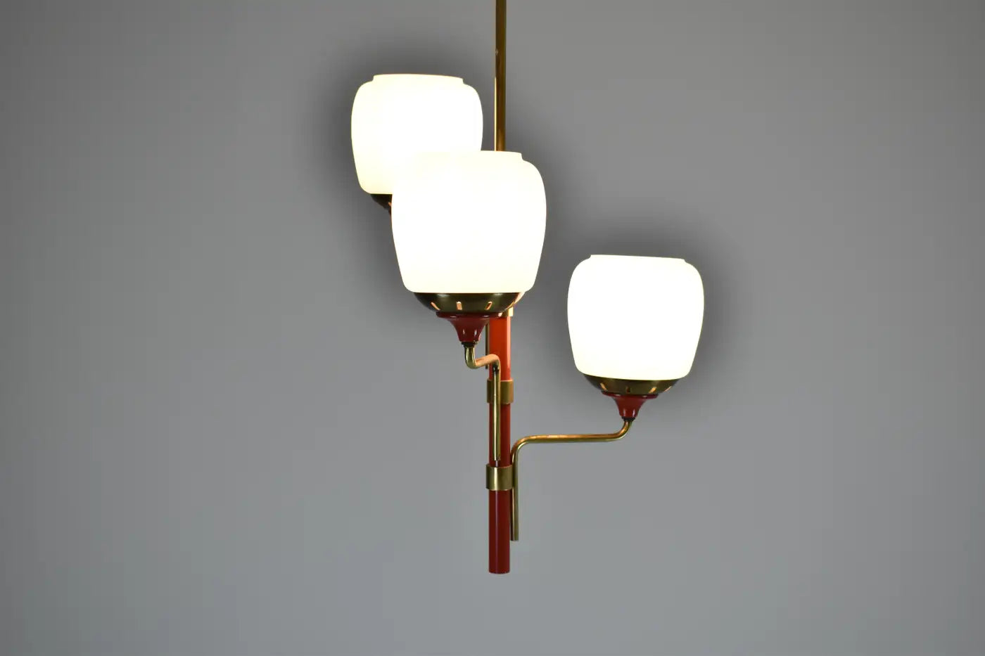 Suspension style Stilnovo des années 50 en laiton, laque rouge et verre opalin