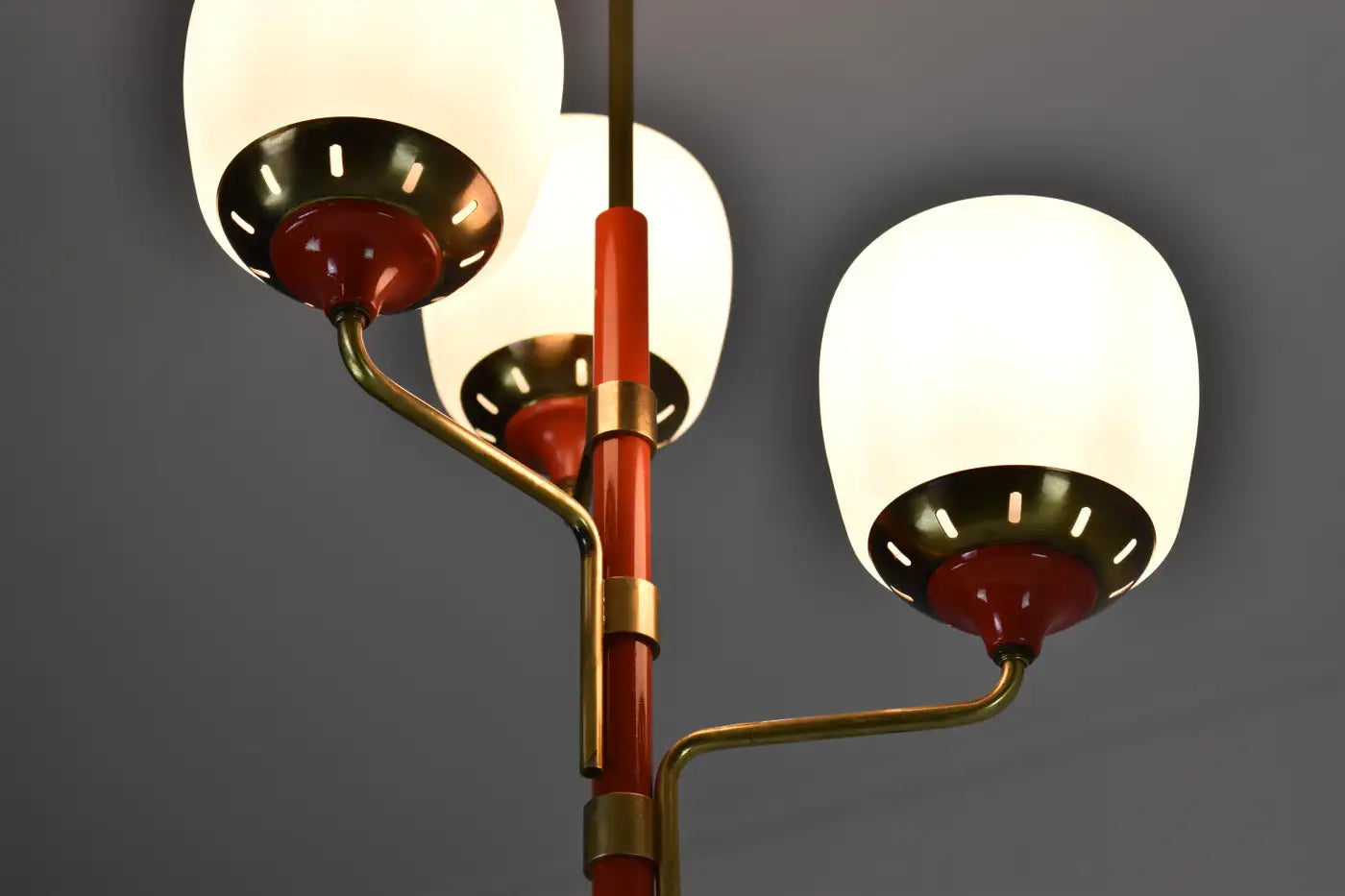 Suspension italienne des années 50, emblématique du style mid-century modern, attribuée à Stilnovo, composée d'une tige en métal rouge laqué avec trois bras en laiton décalés, chacun supportant un globe en verre opalin et des colliers en laiton perforés.