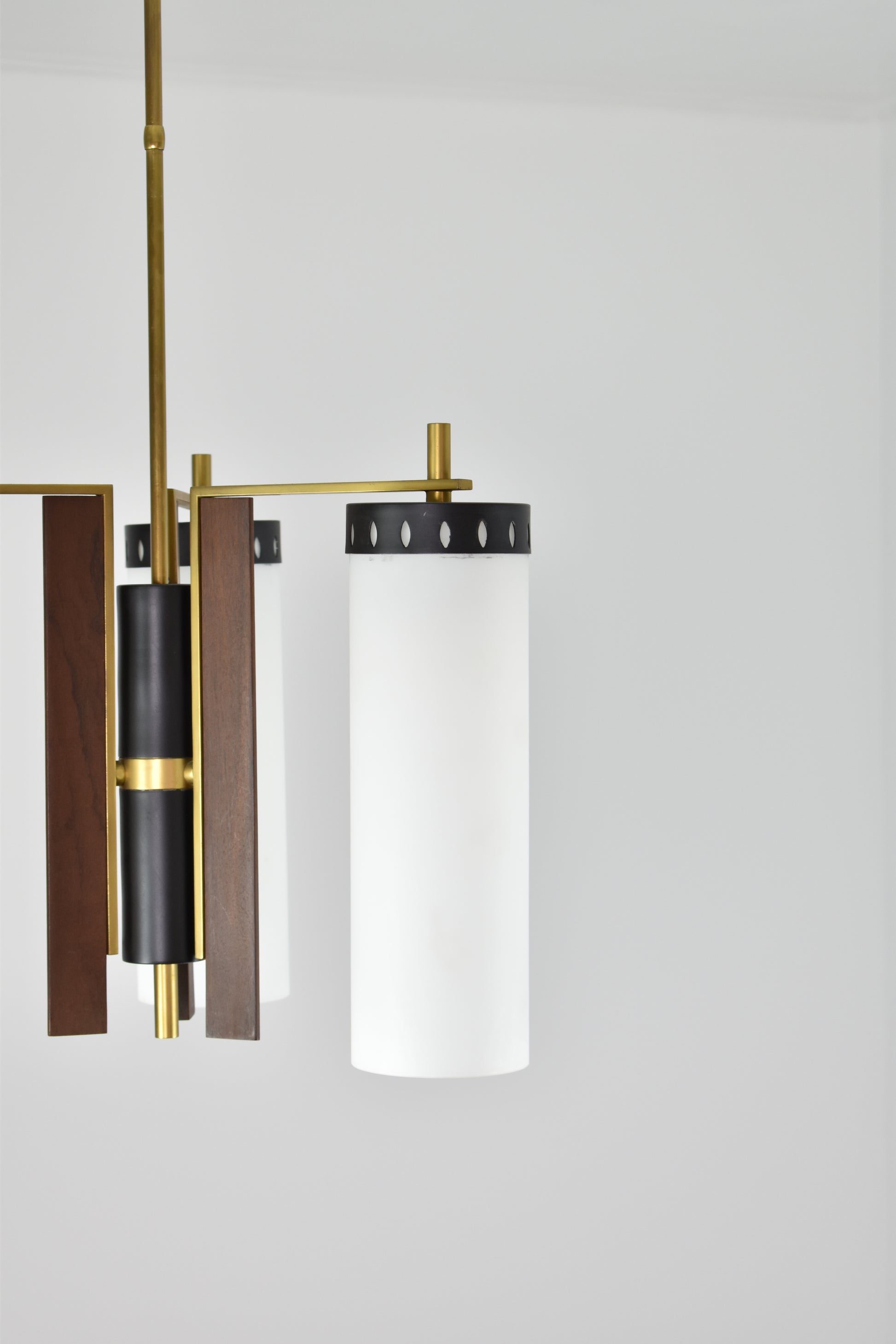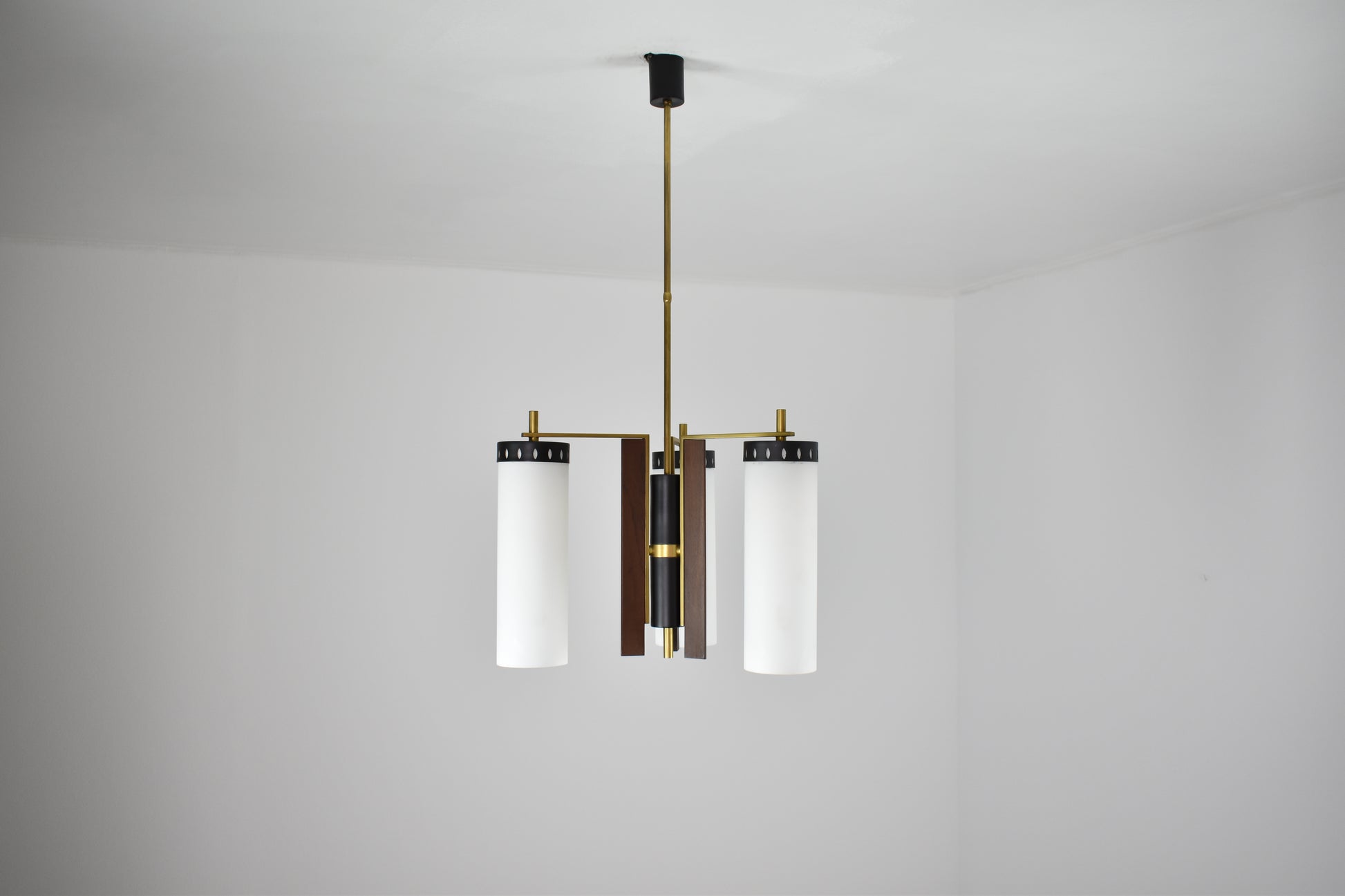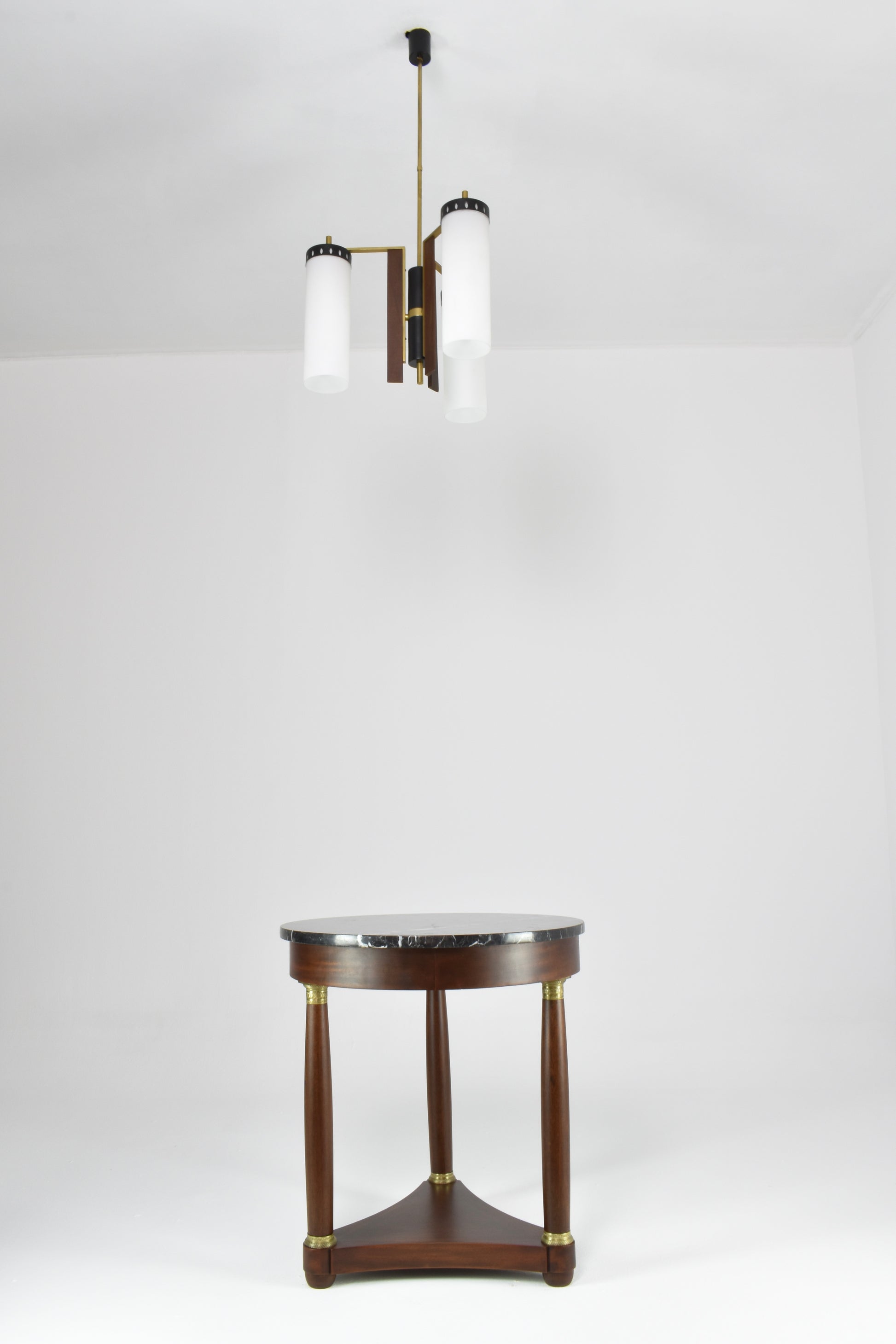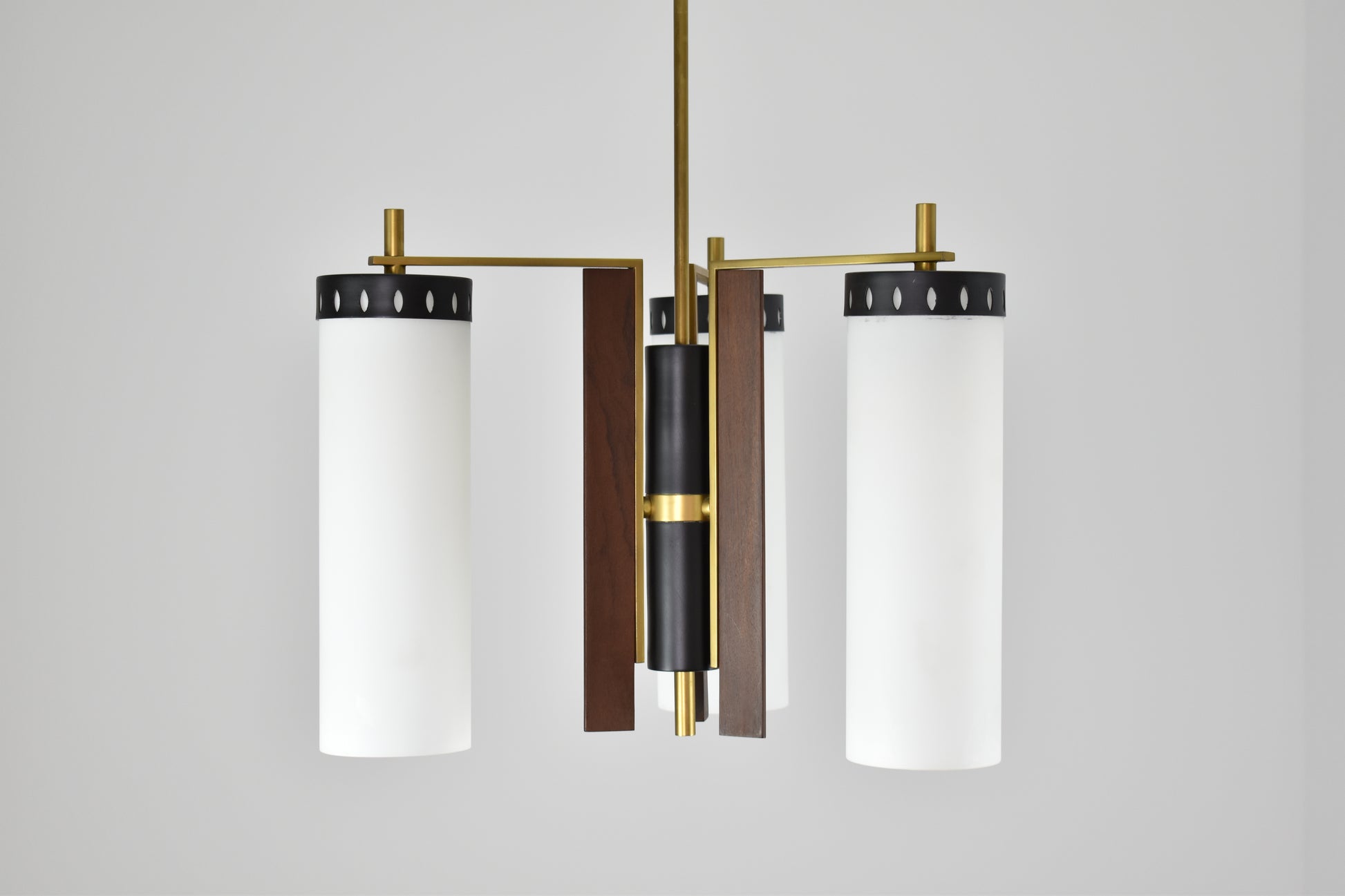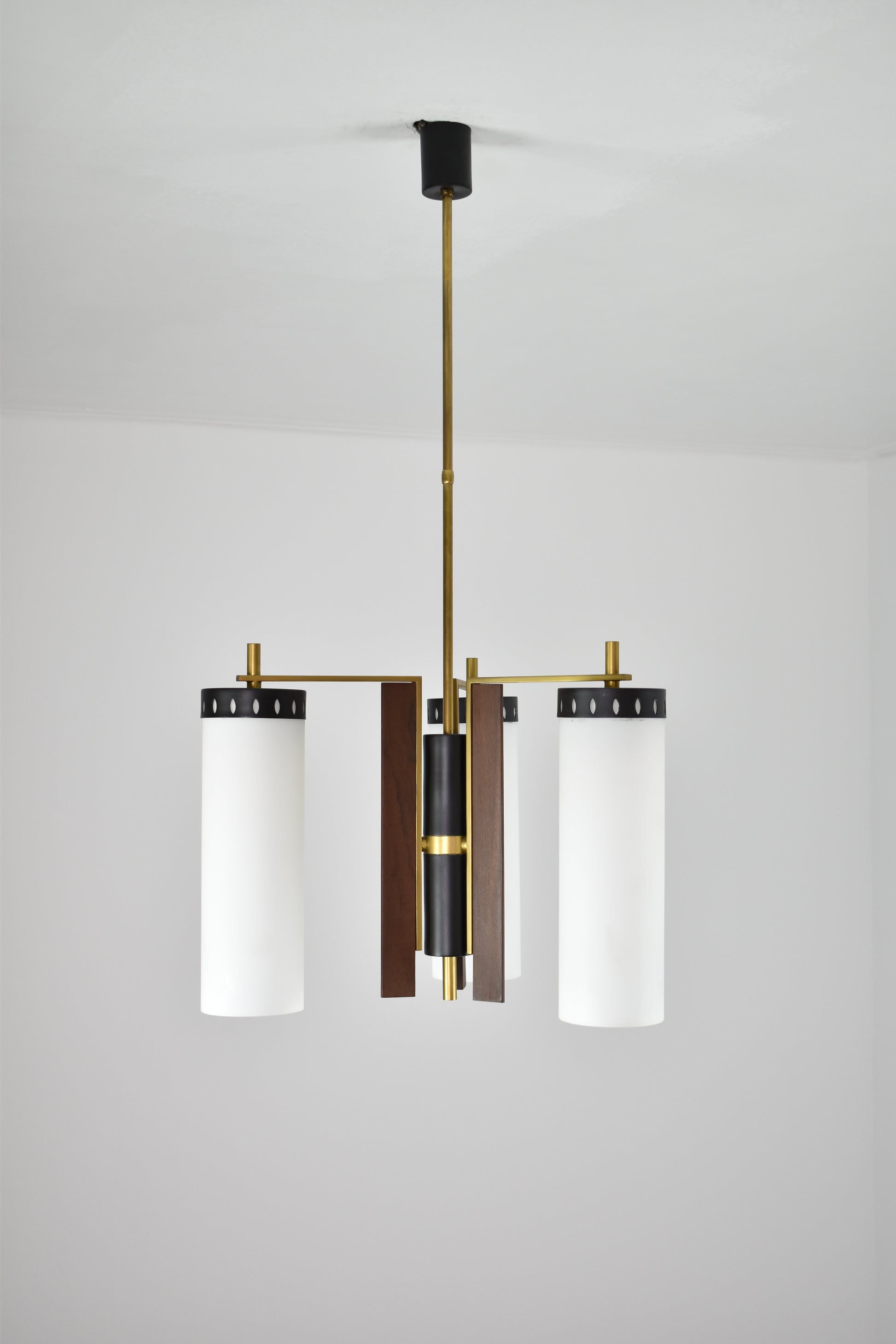 Magnifique suspension italienne à trois lumières des années 60 composée de longues structures circulaires en verre laiteux fixées par des tôles perforées en acier noir. La structure sophistiquée est conçue en laiton, panneaux en bois et acier.