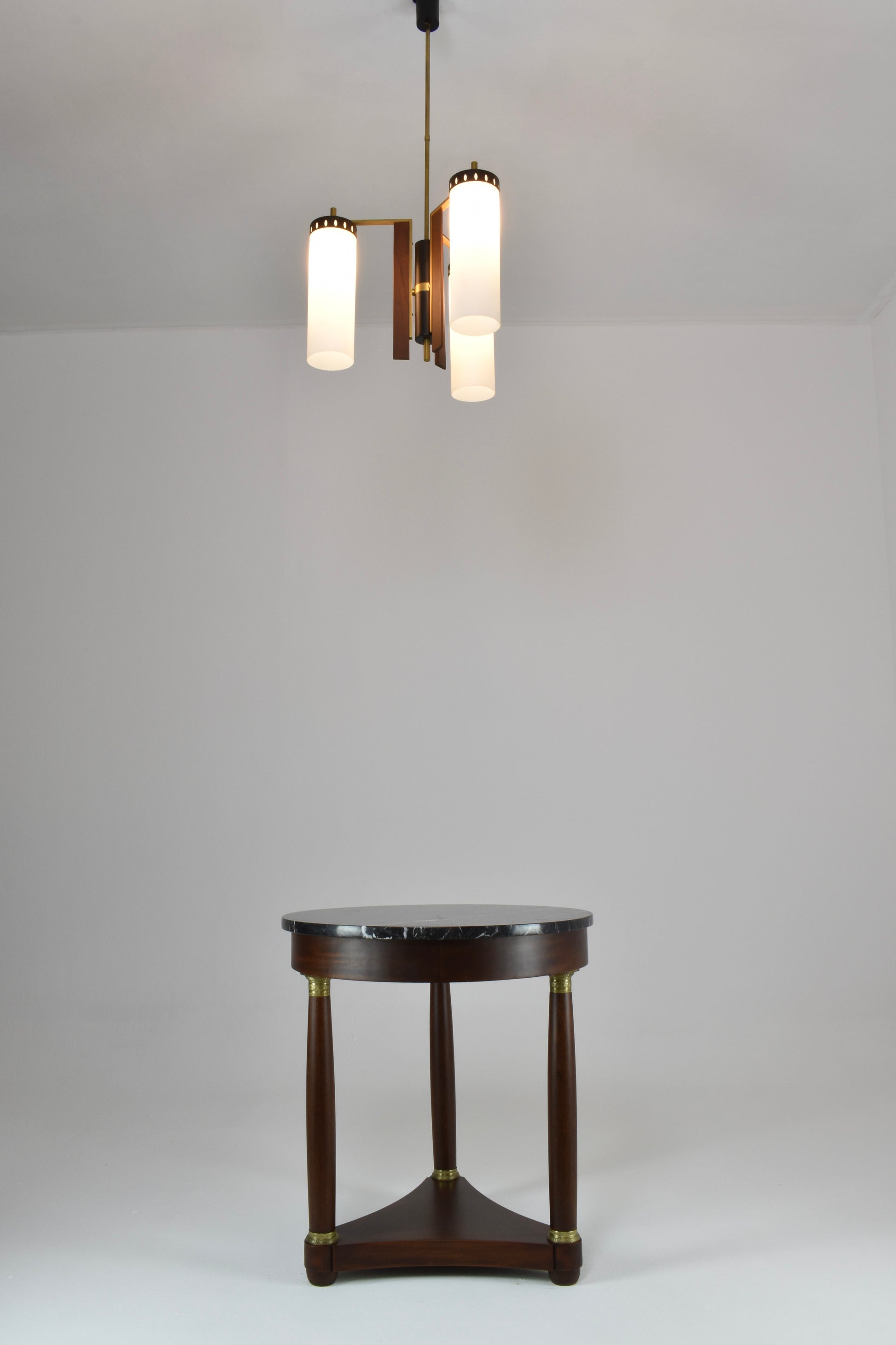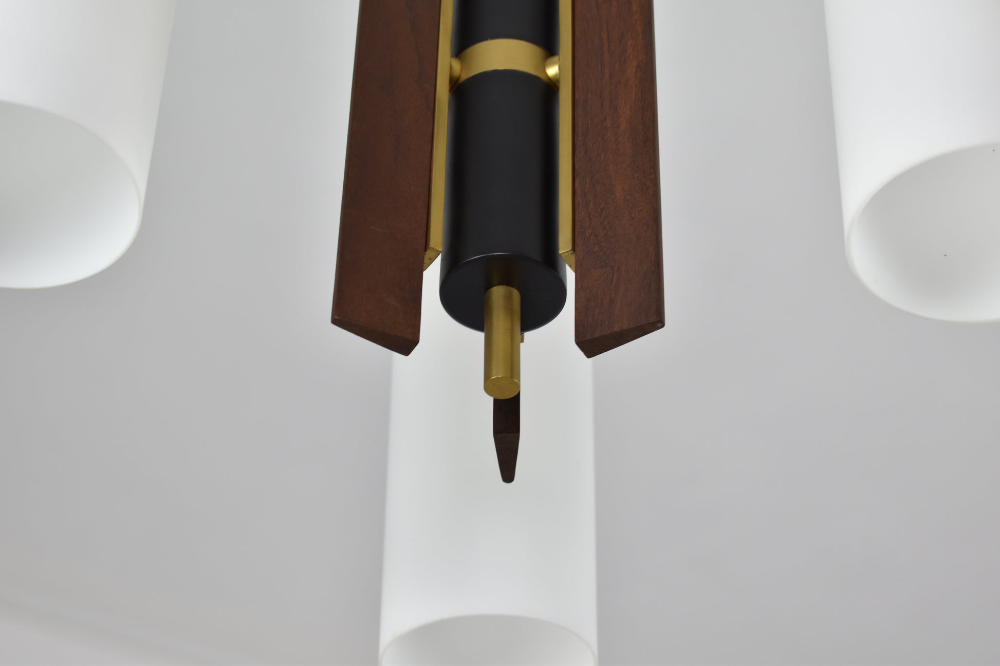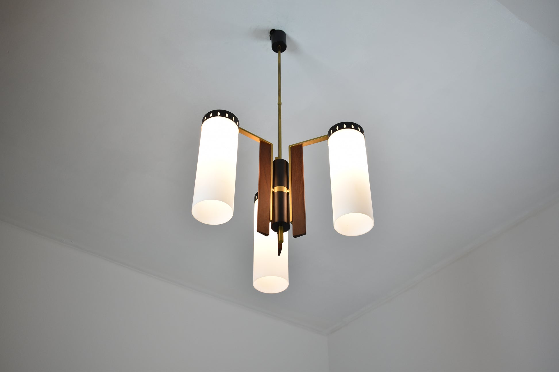 Suspension à 3 lampes en verre et bois des années 1960 attribuée à Stilnovo