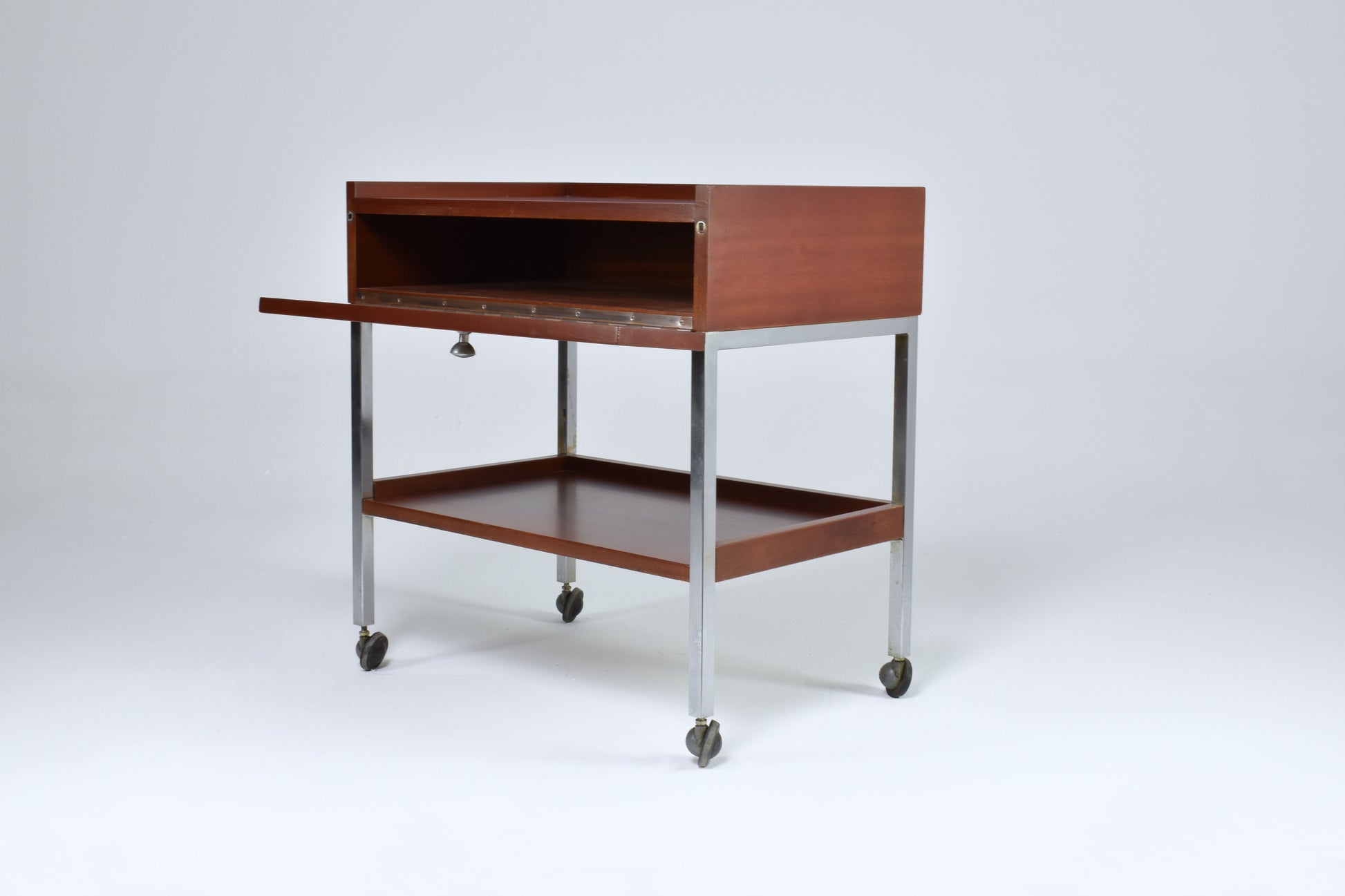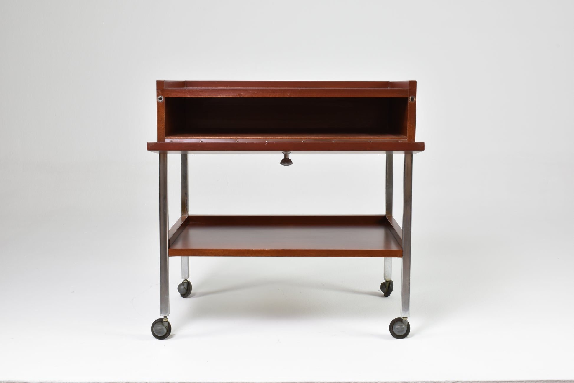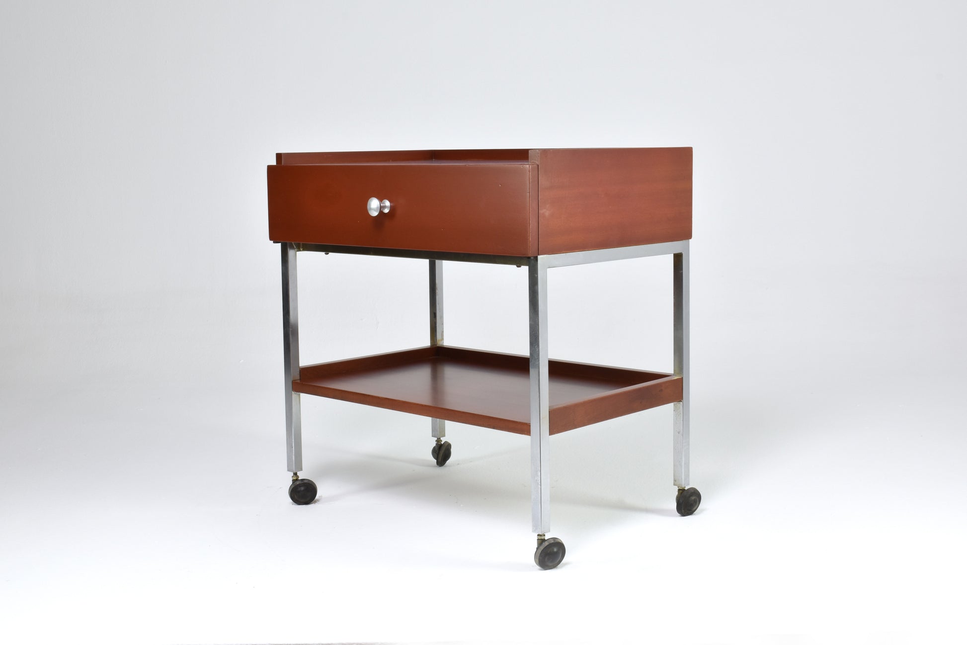 Desserte, table de service ou table d'appoint vintage française du XXe siècle de haute qualité, avec roulettes, structure en bois massif restauré et pieds en acier inoxydable. Cette pièce élégante comprend une grande étagère inférieure et un tiroir supérieur. France. Vers les années 1960. Entièrement restaurée.