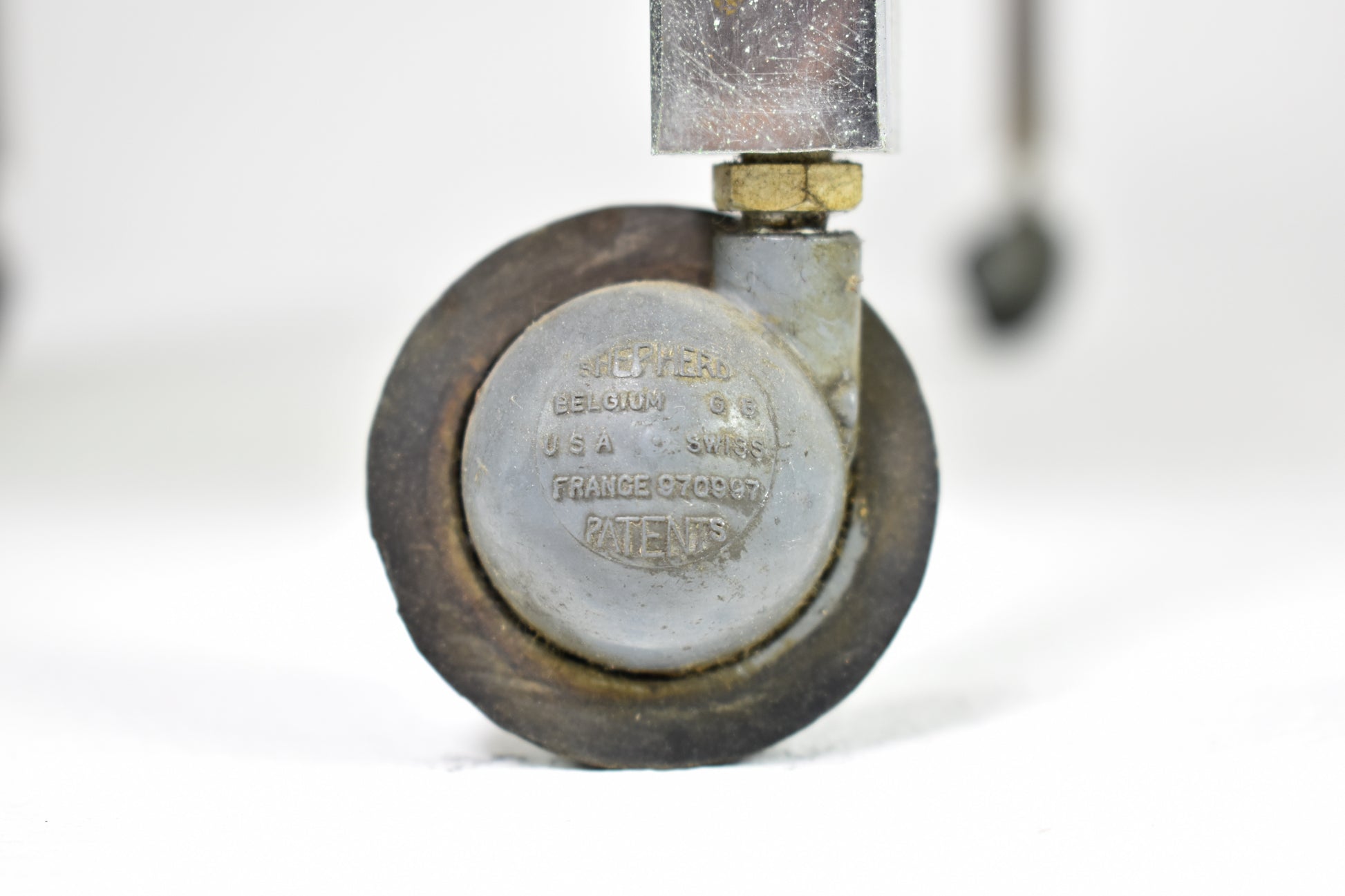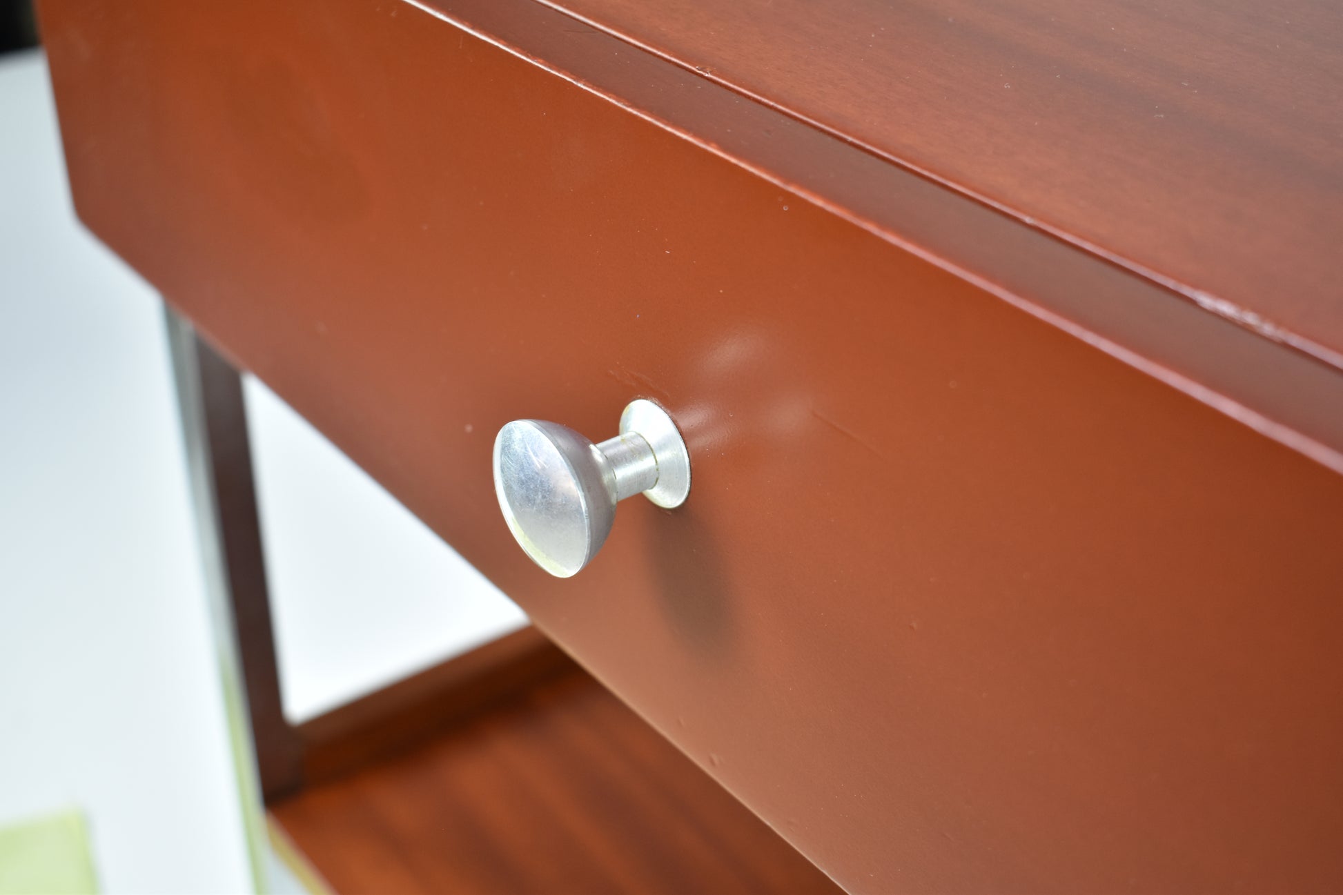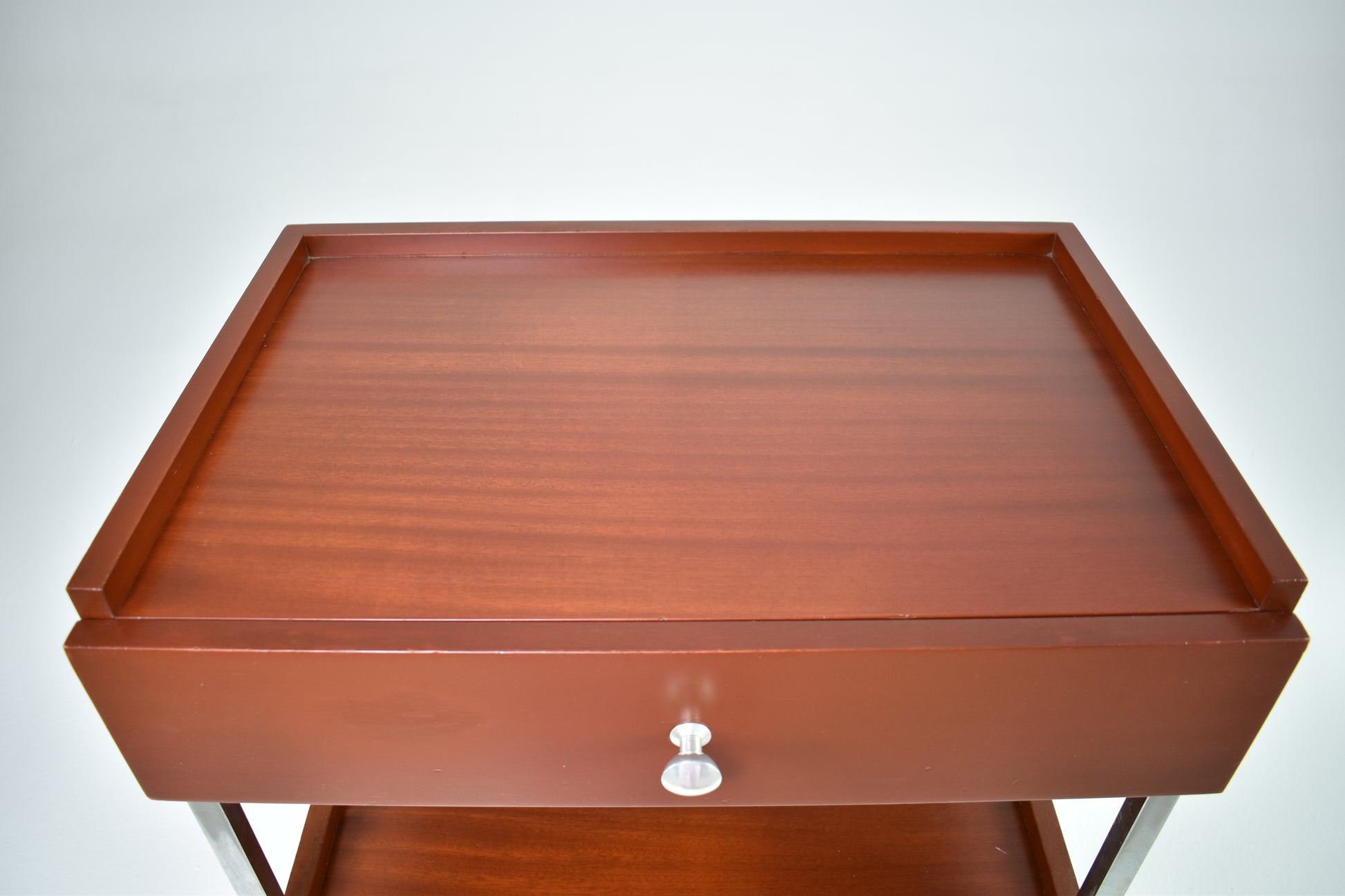 Desserte, table de service ou table d'appoint vintage française du XXe siècle de haute qualité, avec roulettes, structure en bois massif restauré et pieds en acier inoxydable. Cette pièce élégante comprend une grande étagère inférieure et un tiroir supérieur. France. Vers les années 1960. Entièrement restaurée.