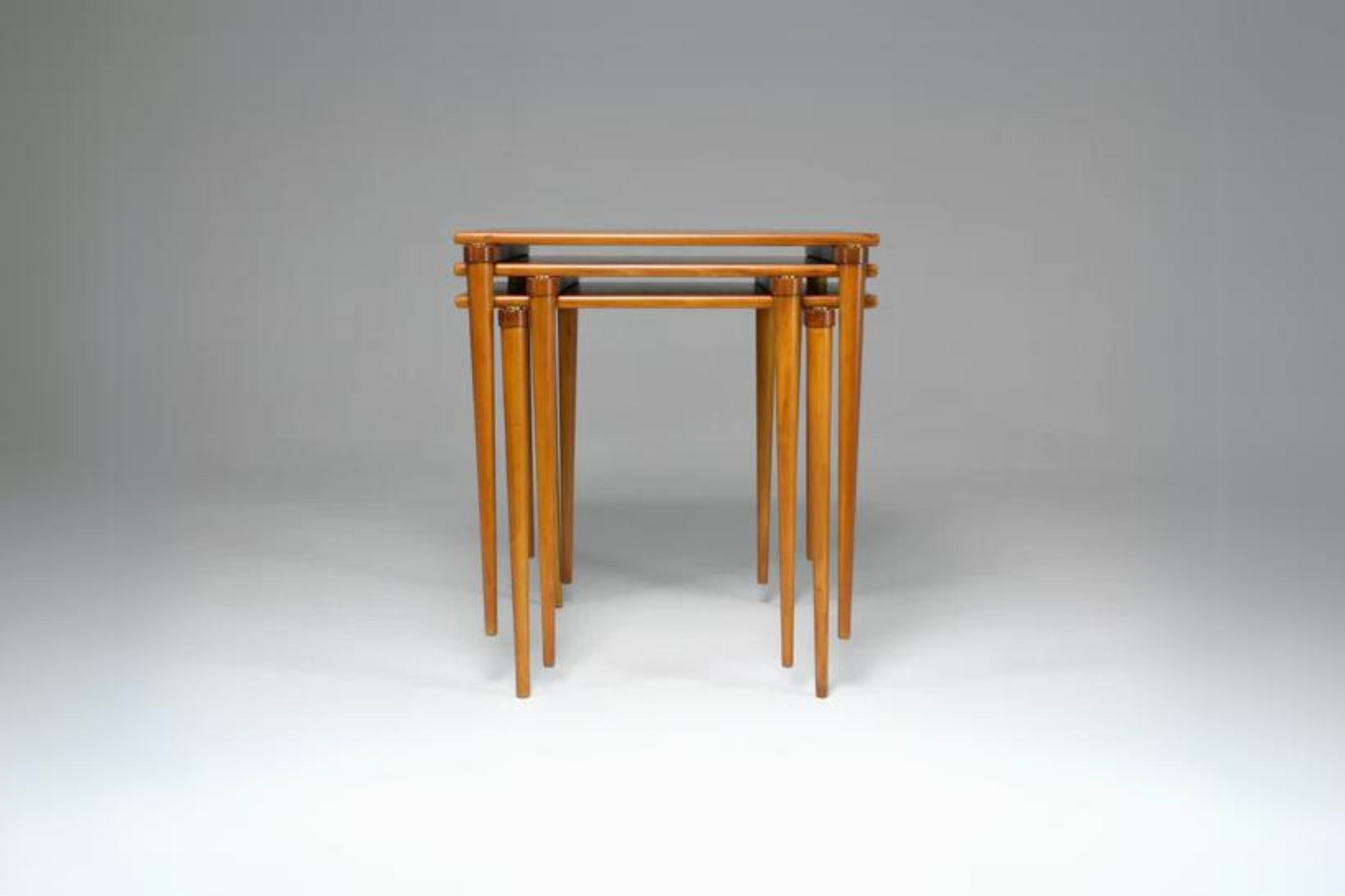 Ensemble de 3 tables d'appoint italiennes vintage du milieu du XXe siècle en bois massif et pieds finement fuselés avec des détails en laiton doux. En état entièrement restauré. Italie. Vers les années 1960