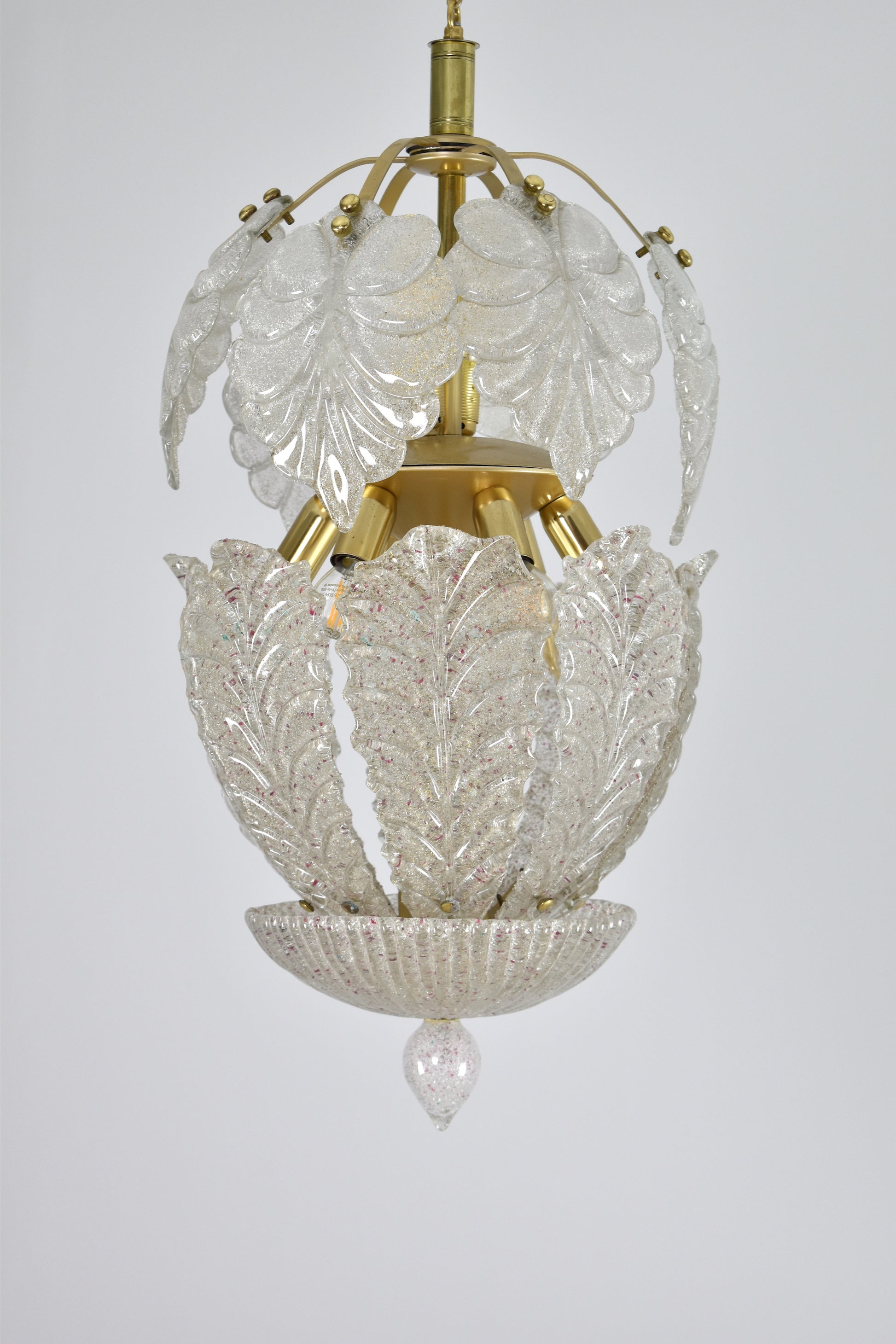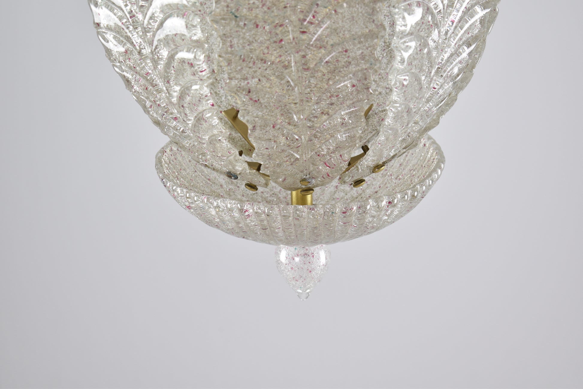 Un pendentif italien en verre de Murano et laiton des années 1970, qui met en valeur les meilleures techniques de fabrication et de conception de l'époque. Le pendentif présente un mélange impeccable de laiton et de verre de Murano, tous deux coupés et polis à la perfection pour ressembler à 8 feuilles de verre sculptées courbées pour former une forme d'œuf. Le verre de Murano est mis en valeur par ses taches roses texturées. Le pendentif témoigne du riche héritage culturel de l'industrie verrière italienne de Murano et représente les prouesses artistiques et de conception des années 1970. Dans l'ensemble, le pendentif italien en verre de Murano et laiton des années 1970 de Barovier Toso est un bijou exquis et un objet de collection qui met en valeur le meilleur du design et de l'artisanat italiens.