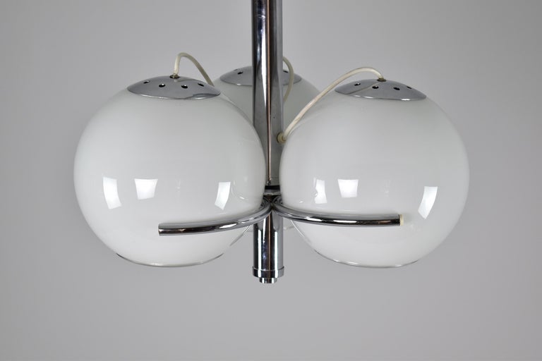 Suspension vintage du XXe siècle du célèbre fabricant italien Reggiani des années 1970. Ce luminaire est en très bon état et est conçu avec une structure chic en acier inoxydable et trois abat-jours en verre opaque en forme de globe. Cette pièce est recâblée professionnellement selon les normes les plus élevées et est universellement compatible.