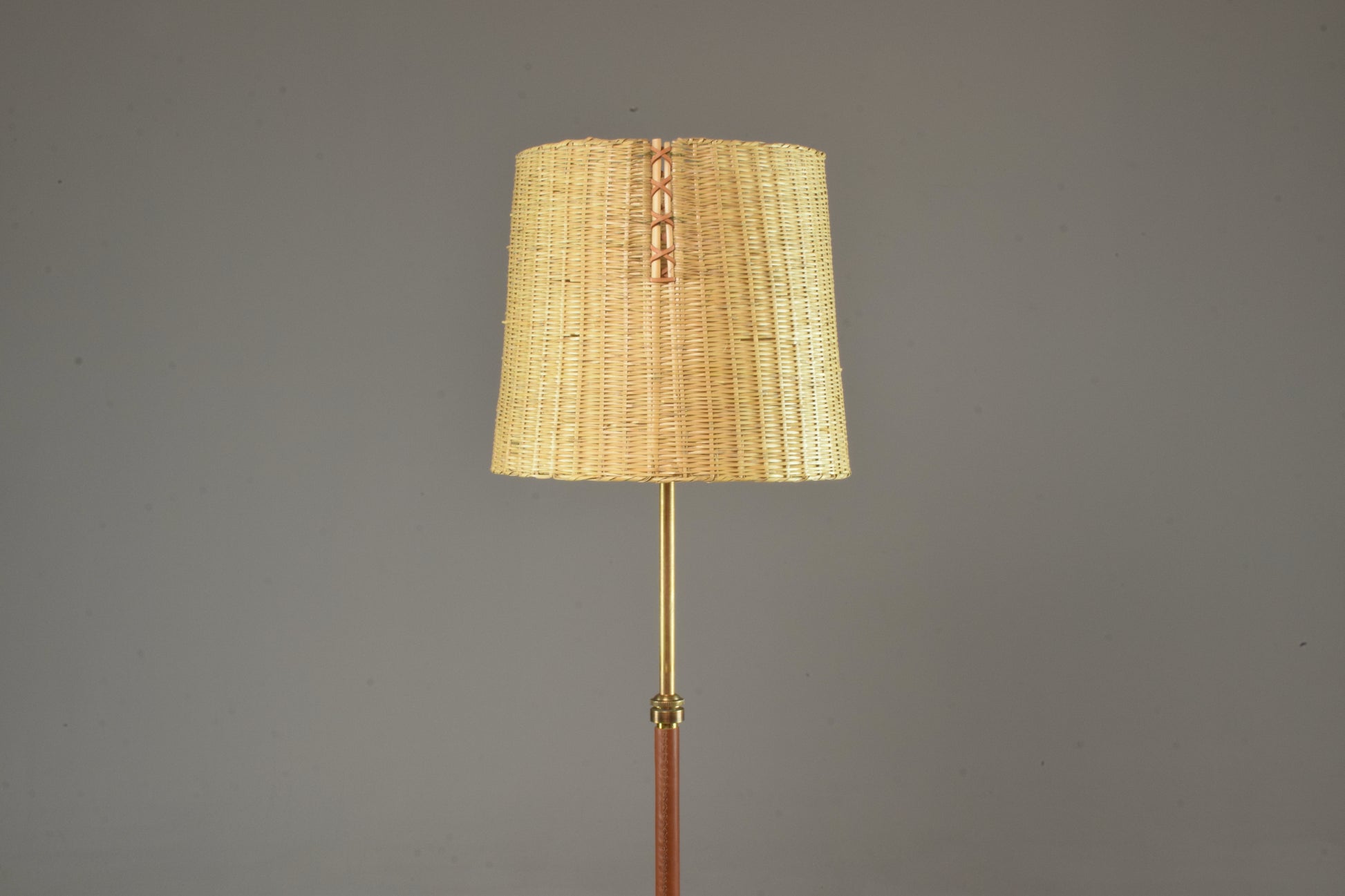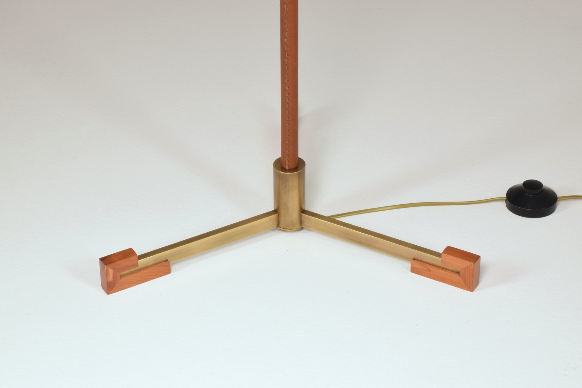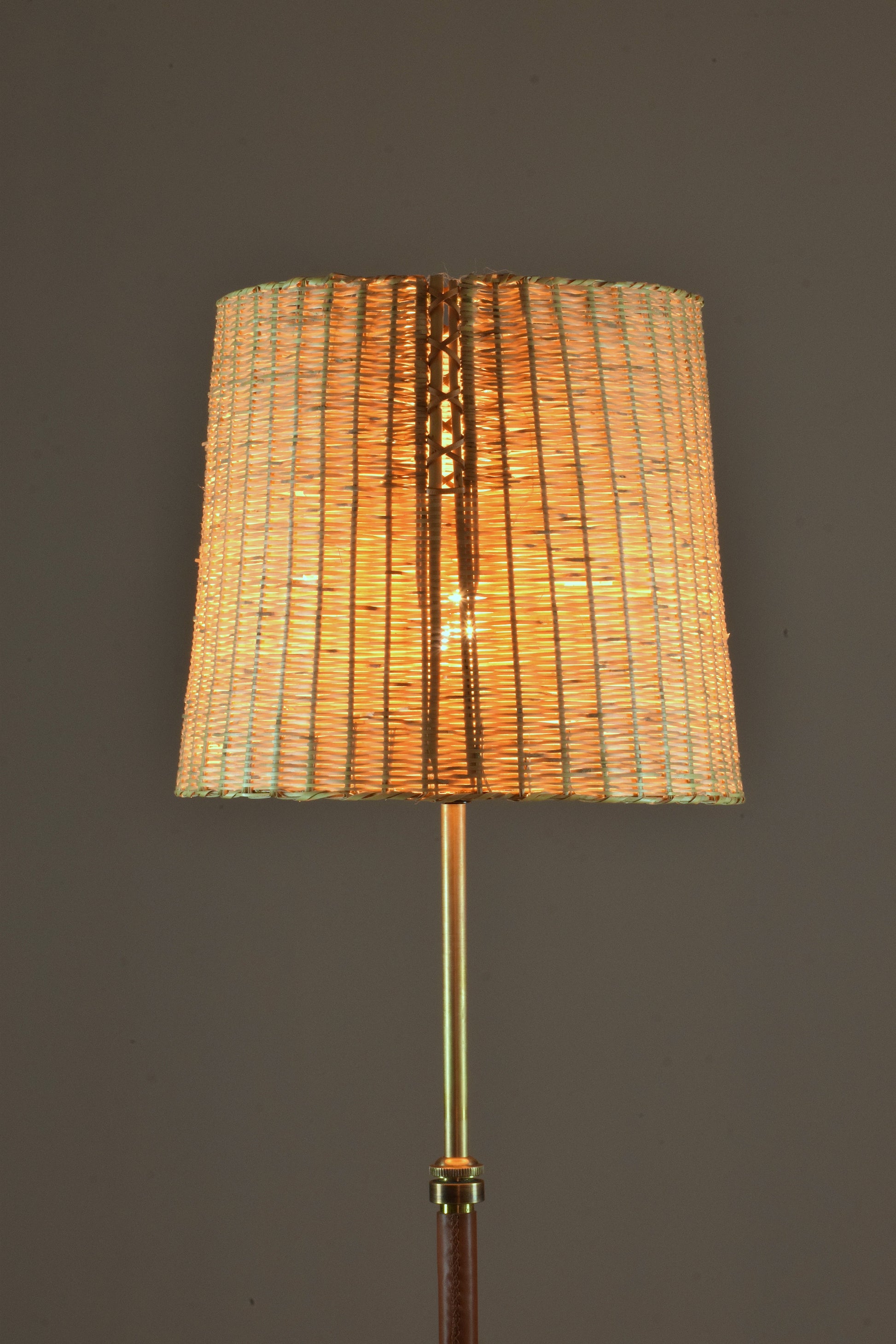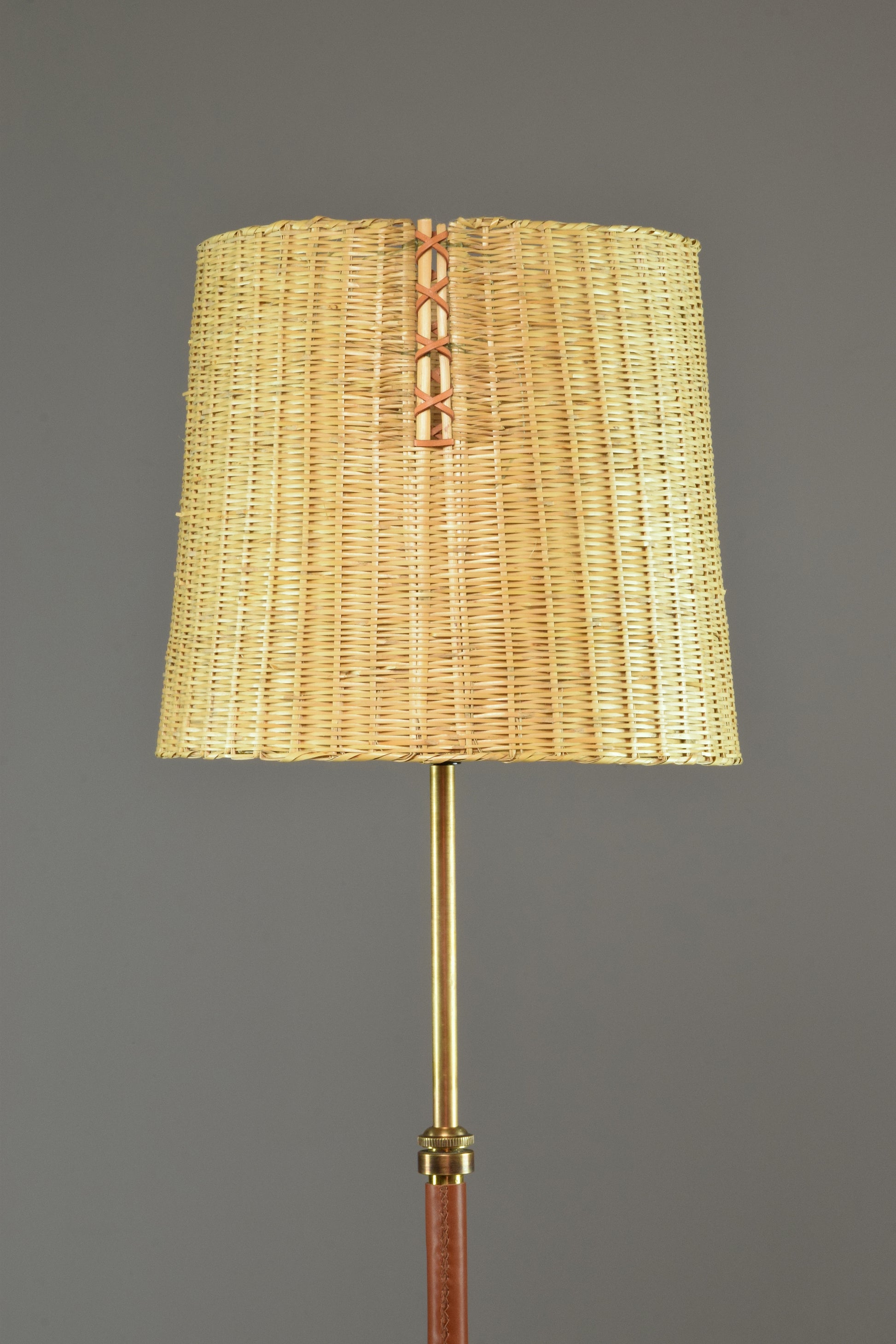 Le lampadaire Ancora-T repose sur une structure fine en laiton entièrement gainée de cuir et repose sur un trépied en laiton massif avec des extrémités en noyer. L'abat-jour est délicatement fabriqué à la main par des artisans marocains experts en osier (ou en rotin) et présente un détail tressé. Cette pièce fantastique est illustrée ici dans une finition en laiton vieilli.