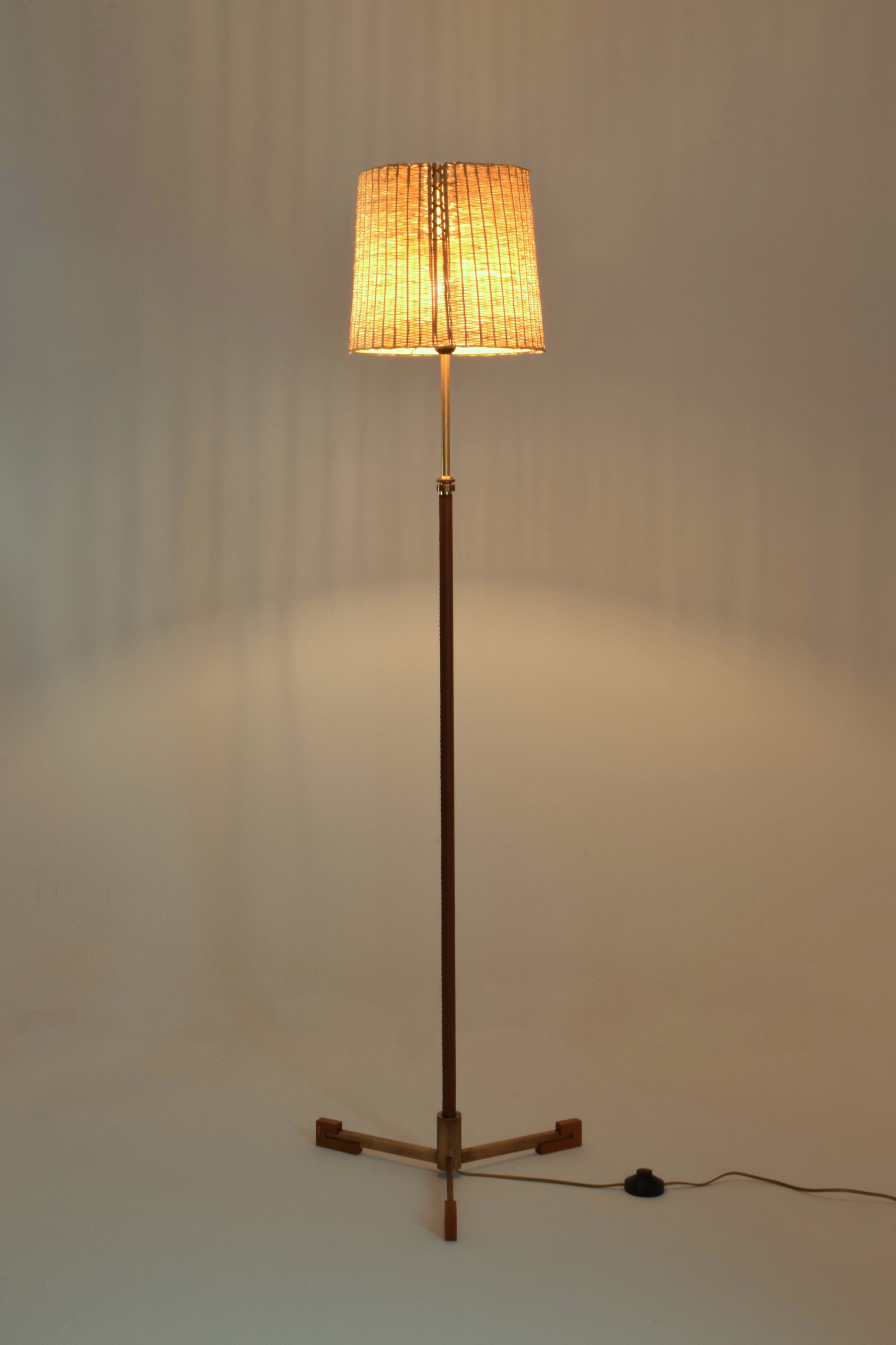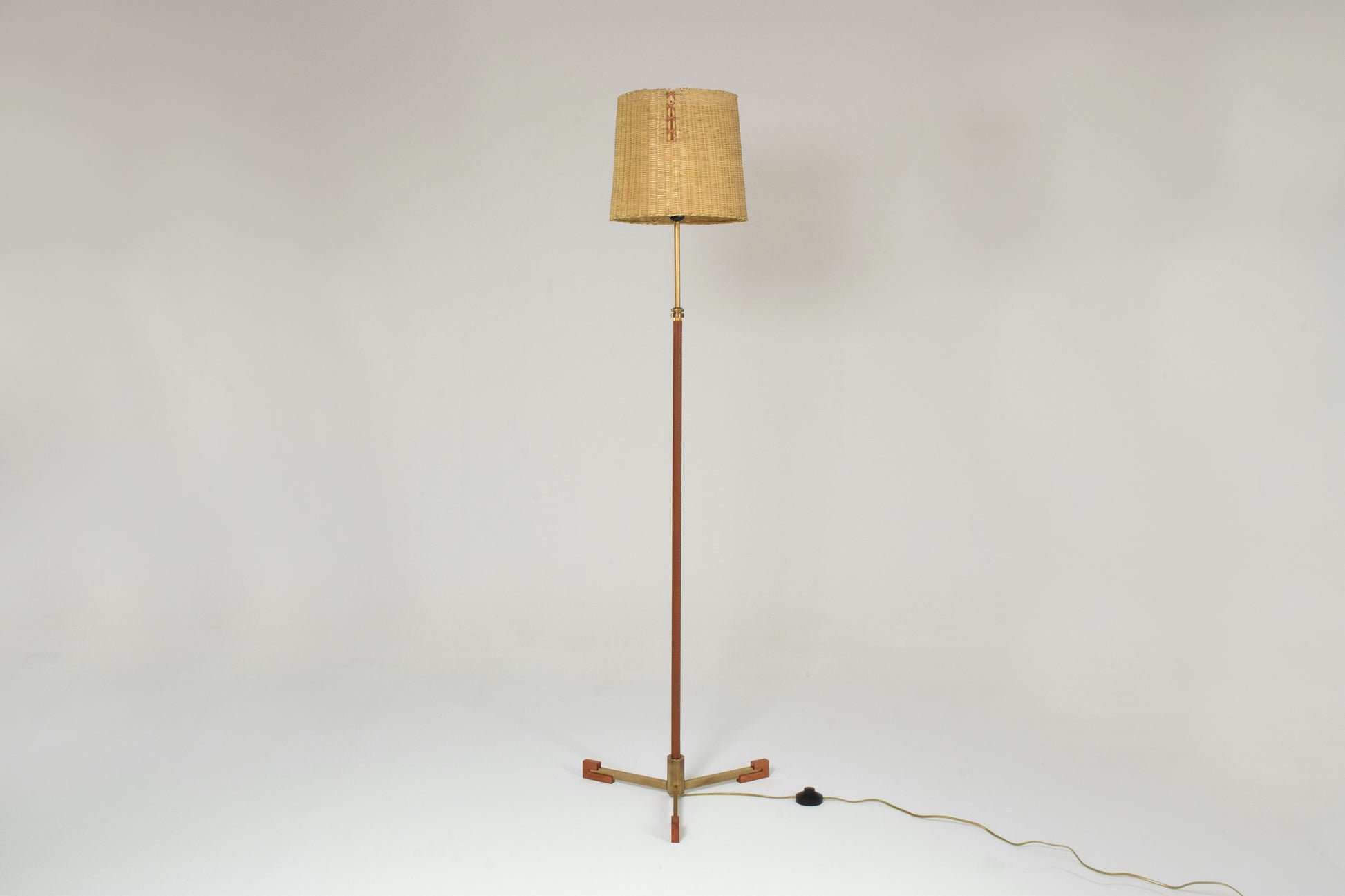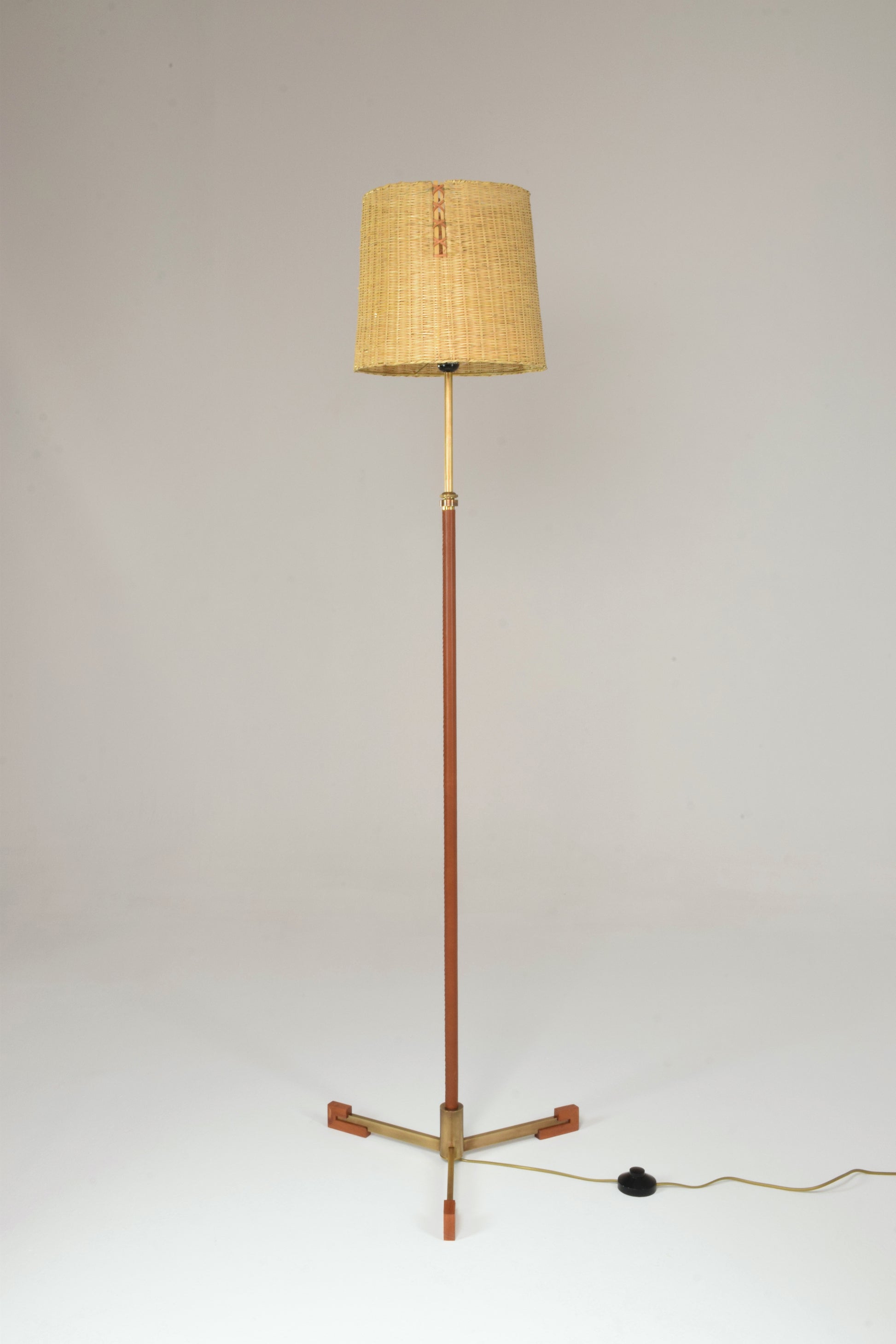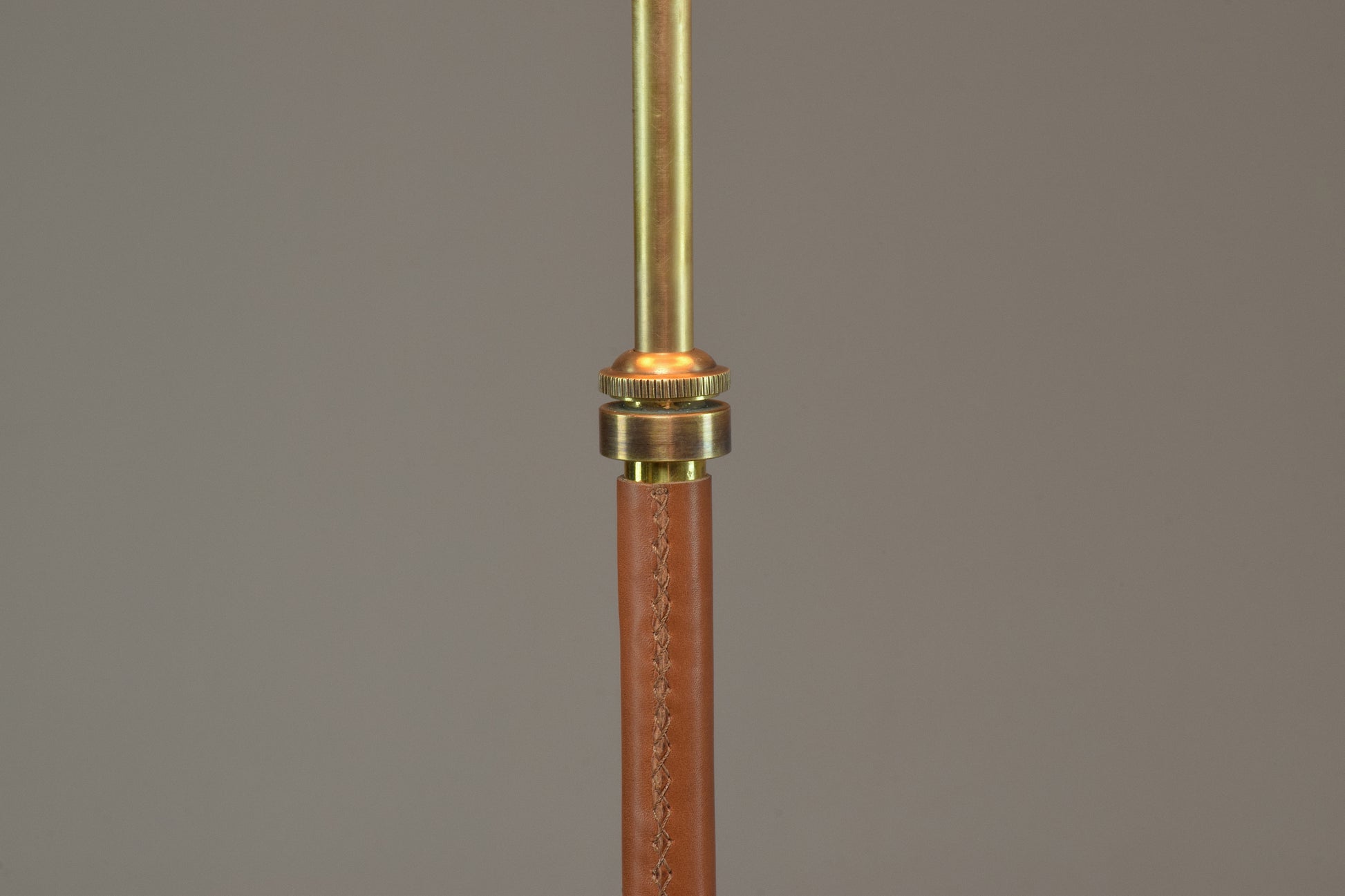 Le lampadaire Ancora-T repose sur une structure fine en laiton entièrement gainée de cuir et repose sur un trépied en laiton massif avec des extrémités en noyer. L'abat-jour est délicatement fabriqué à la main par des artisans marocains experts en osier (ou en rotin) et présente un détail tressé. Cette pièce fantastique est illustrée ici dans une finition en laiton vieilli.