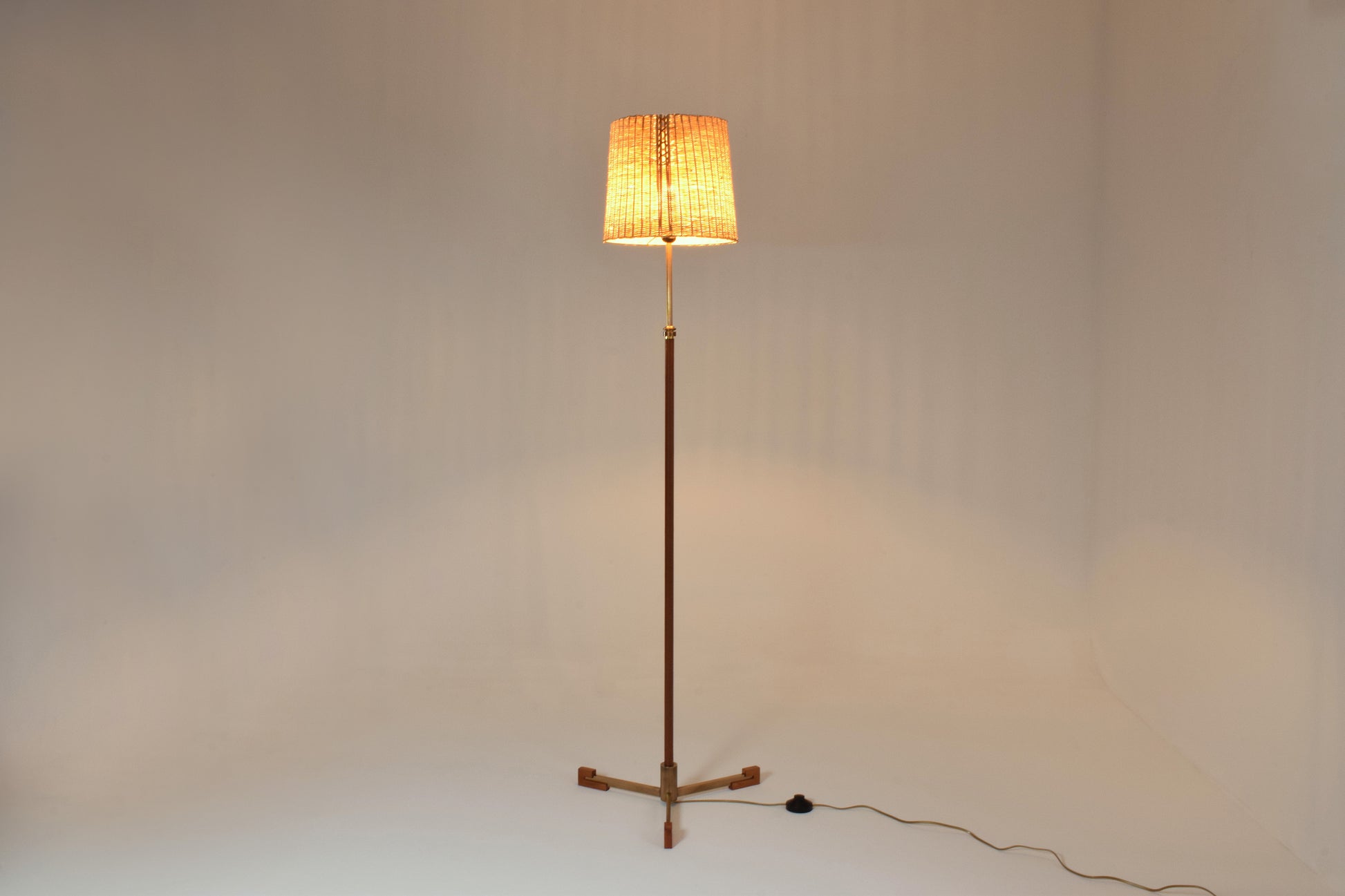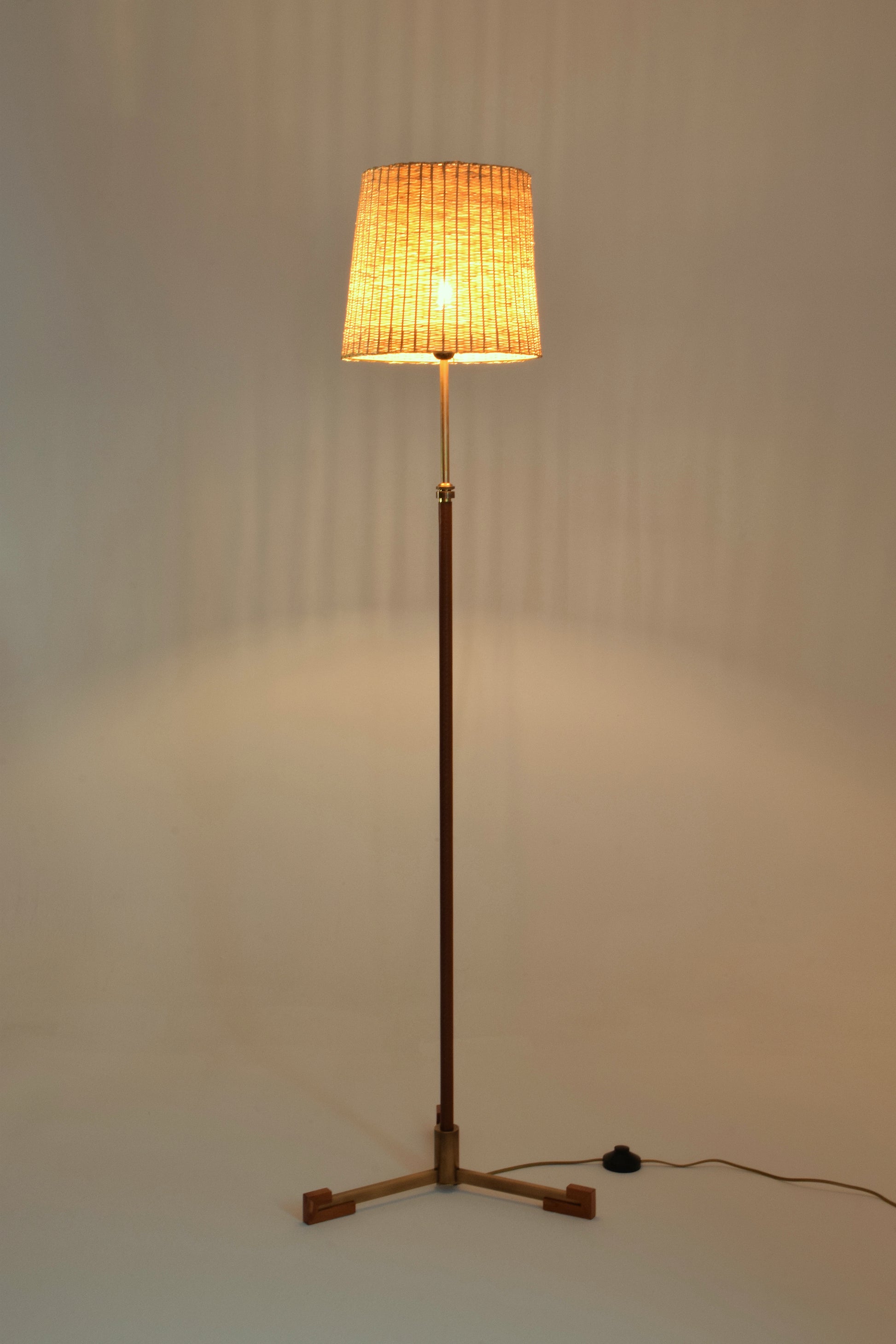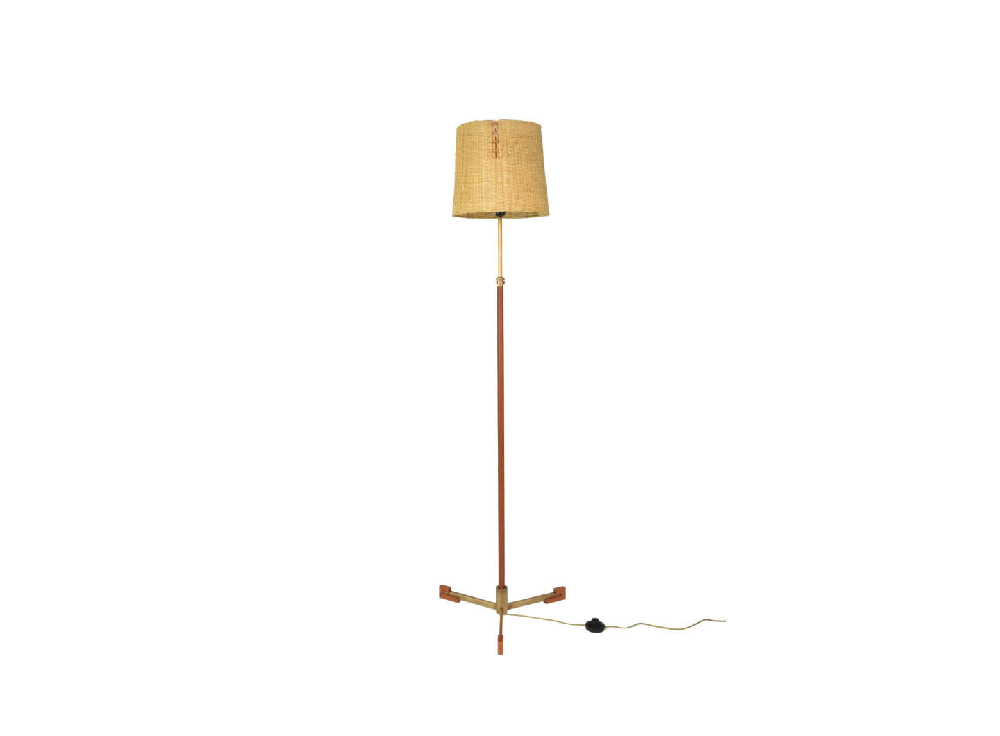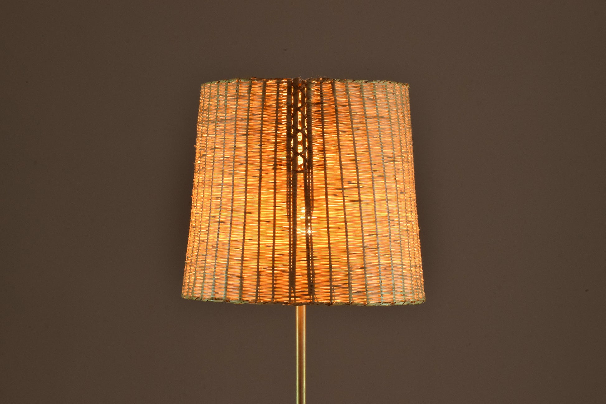 Le lampadaire Ancora-T repose sur une structure fine en laiton entièrement gainée de cuir et repose sur un trépied en laiton massif avec des extrémités en noyer. L'abat-jour est délicatement fabriqué à la main par des artisans marocains experts en osier (ou en rotin) et présente un détail tressé. Cette pièce fantastique est illustrée ici dans une finition en laiton vieilli.