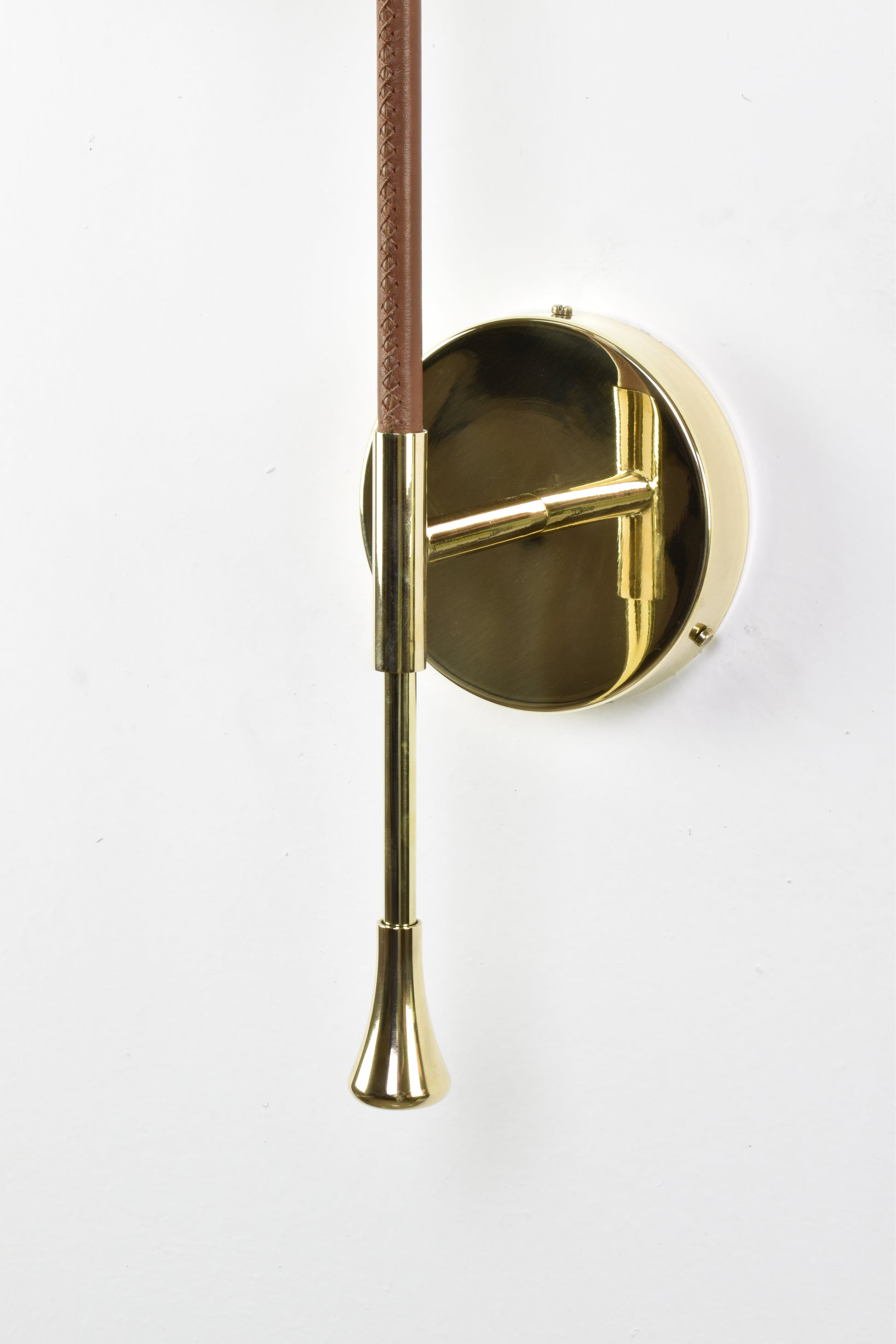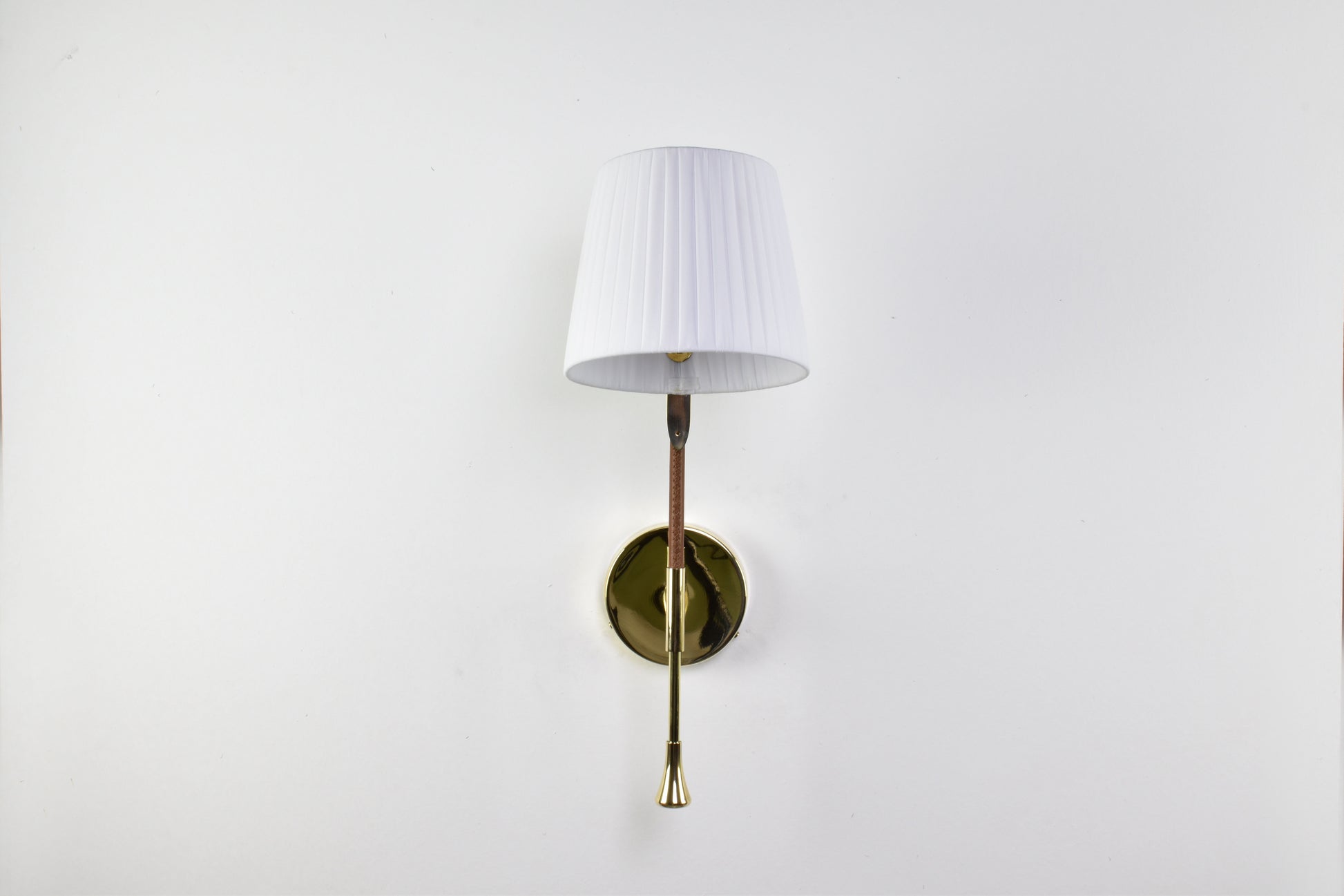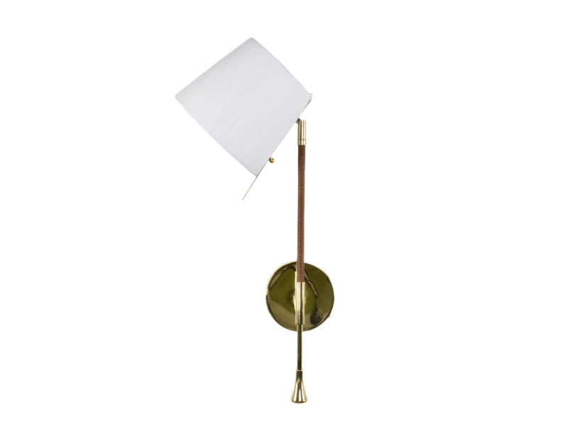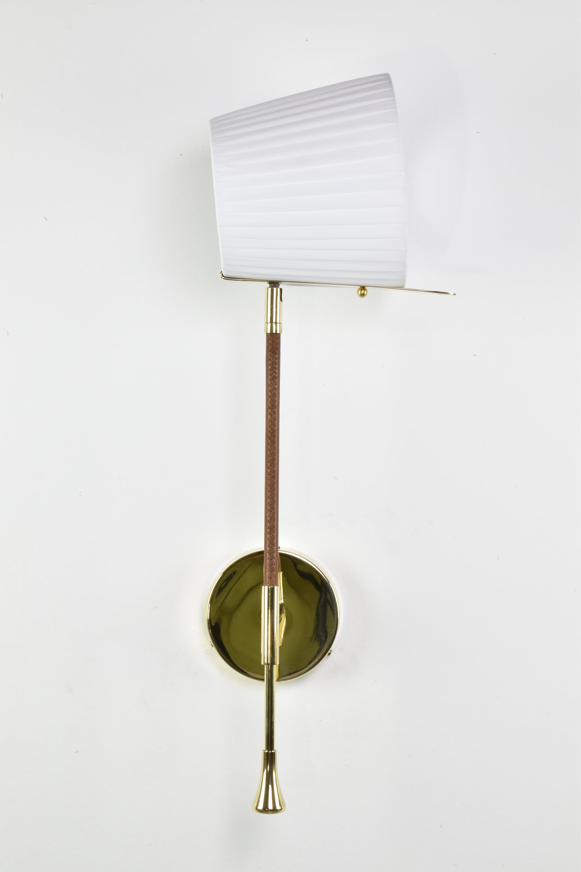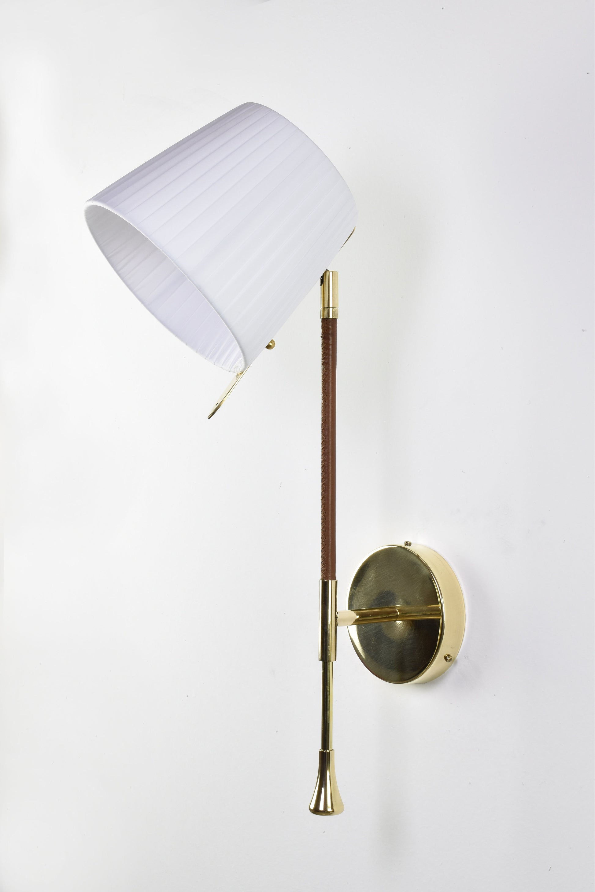 Applique murale contemporaine du XXIe siècle, fabriquée artisanalement. Sa structure en laiton poli doré est ornée d'un détail gainé de cuir marron cousu main par des artisans selliers. L'abat-jour en tissu plissé blanc doux est rotatif à 90° et doté d'une tige permettant d'orienter facilement la lumière. Les pièces sont expédiées depuis Leiria, au Portugal, ou Rabat, au Maroc.
