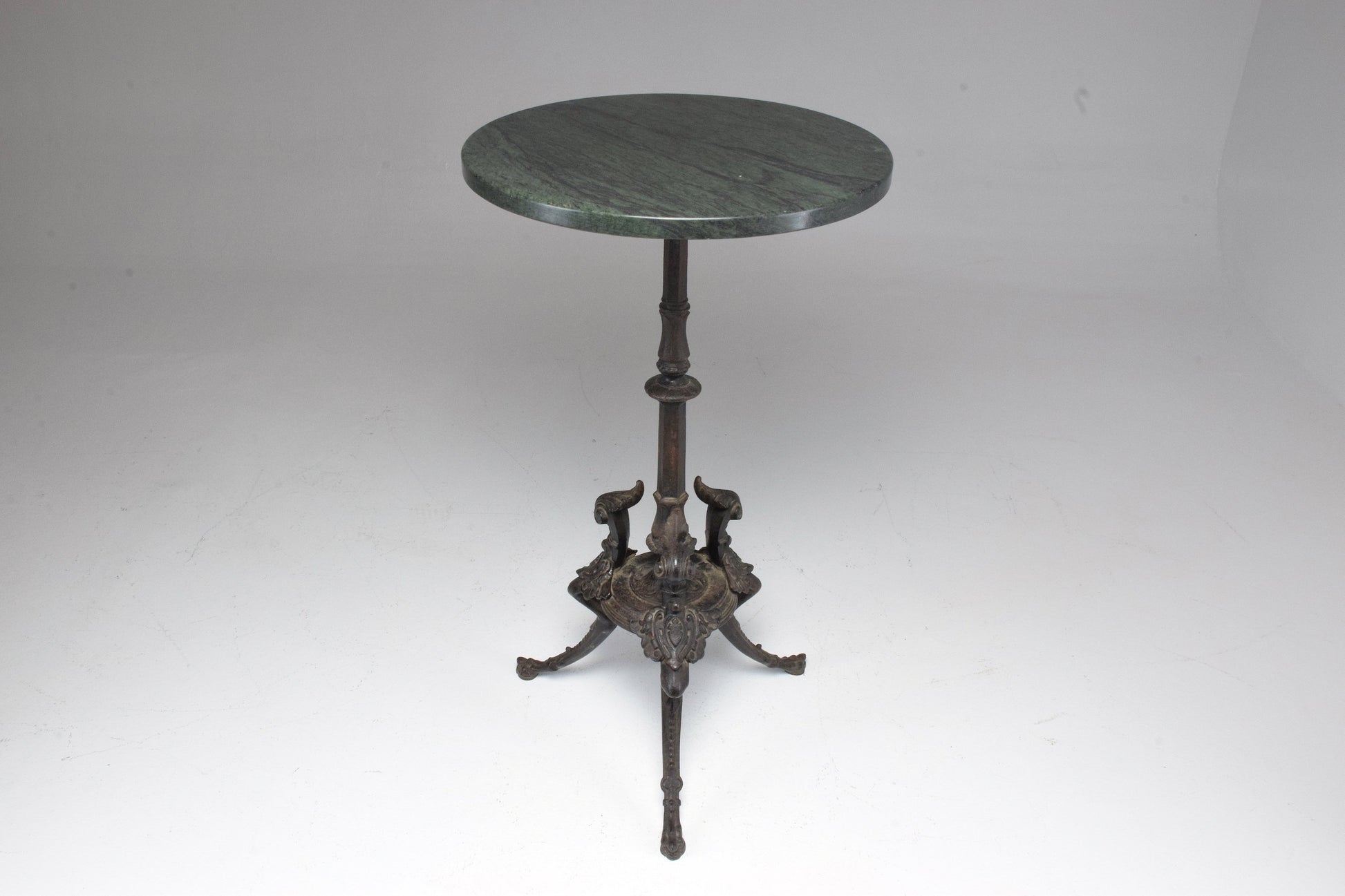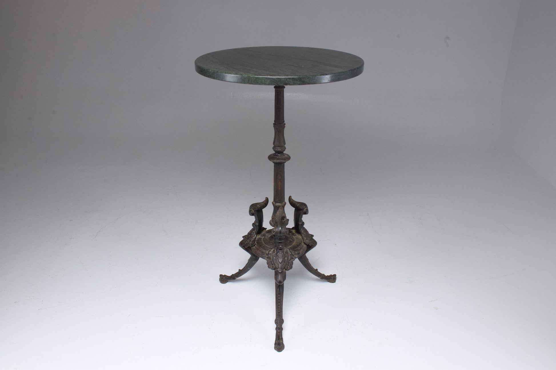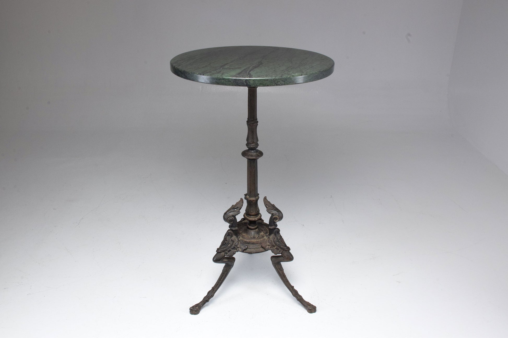 Guéridon du XIXe siècle de style Napoléon III avec structure tripode en fer forgé et détails finement sculptés. Restauré avec du marbre vert italien.