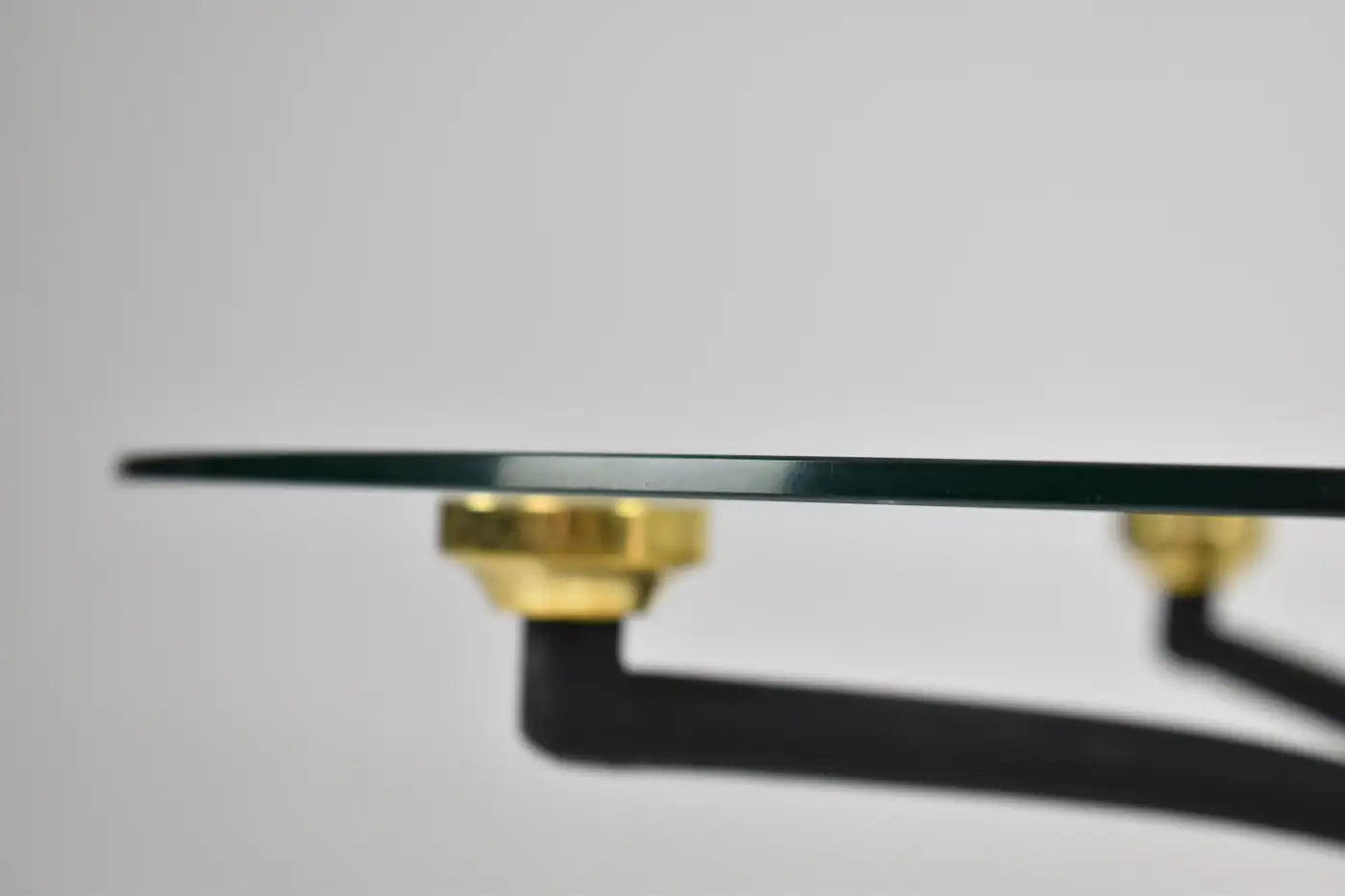 The Arte table plays with tension and harmony—its four-legged base curves upward like calligraphic strokes, supporting a round glass top in a barely-there balance. Crafted in painted iron with polished brass accents, it’s a sculptural take on the modernist cocktail table, with a distinct mid-century rhythm.