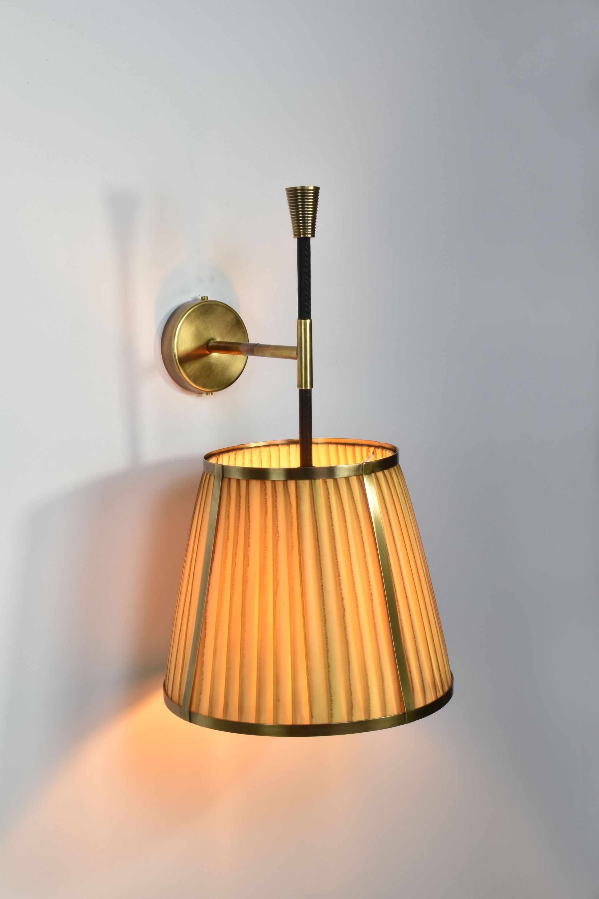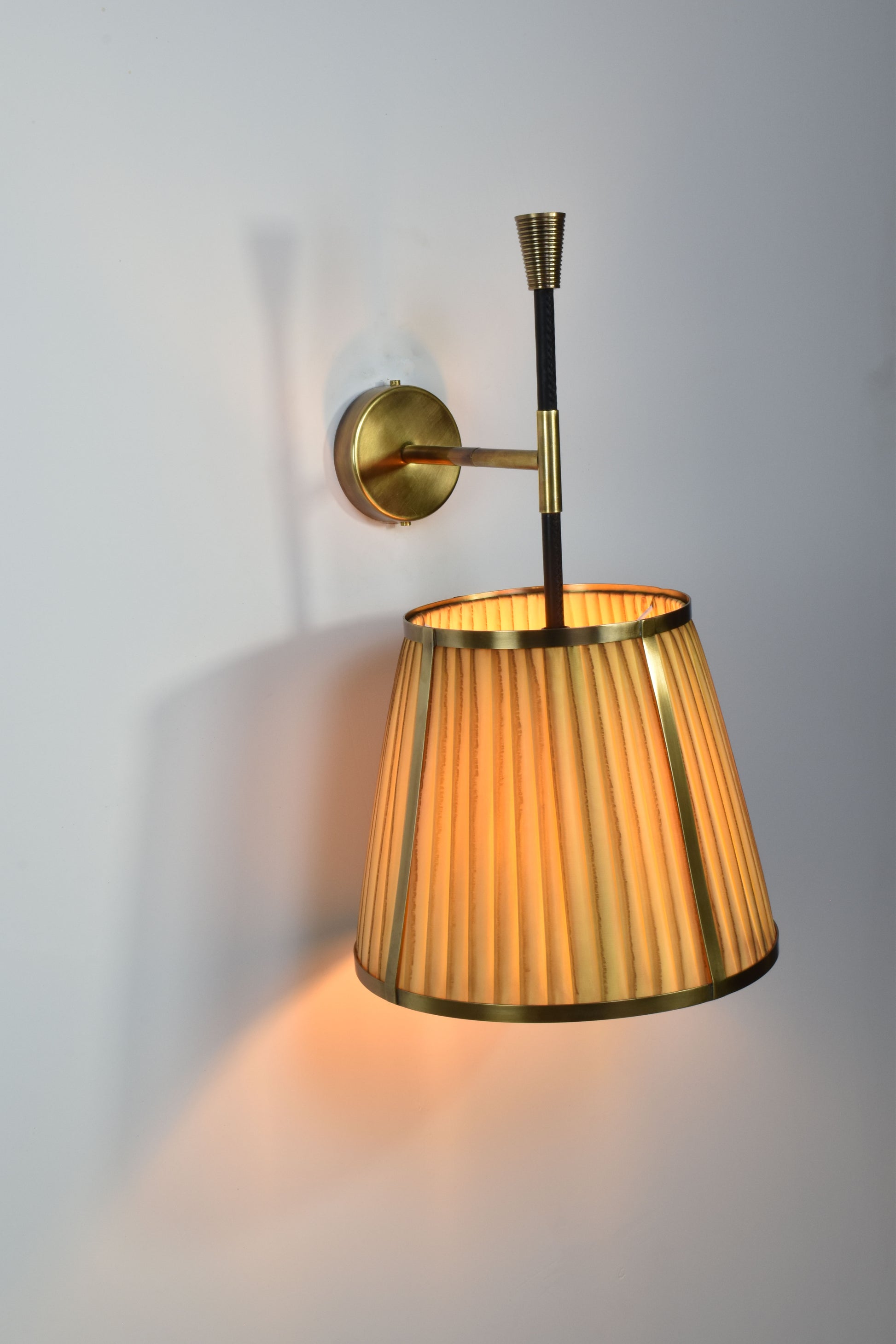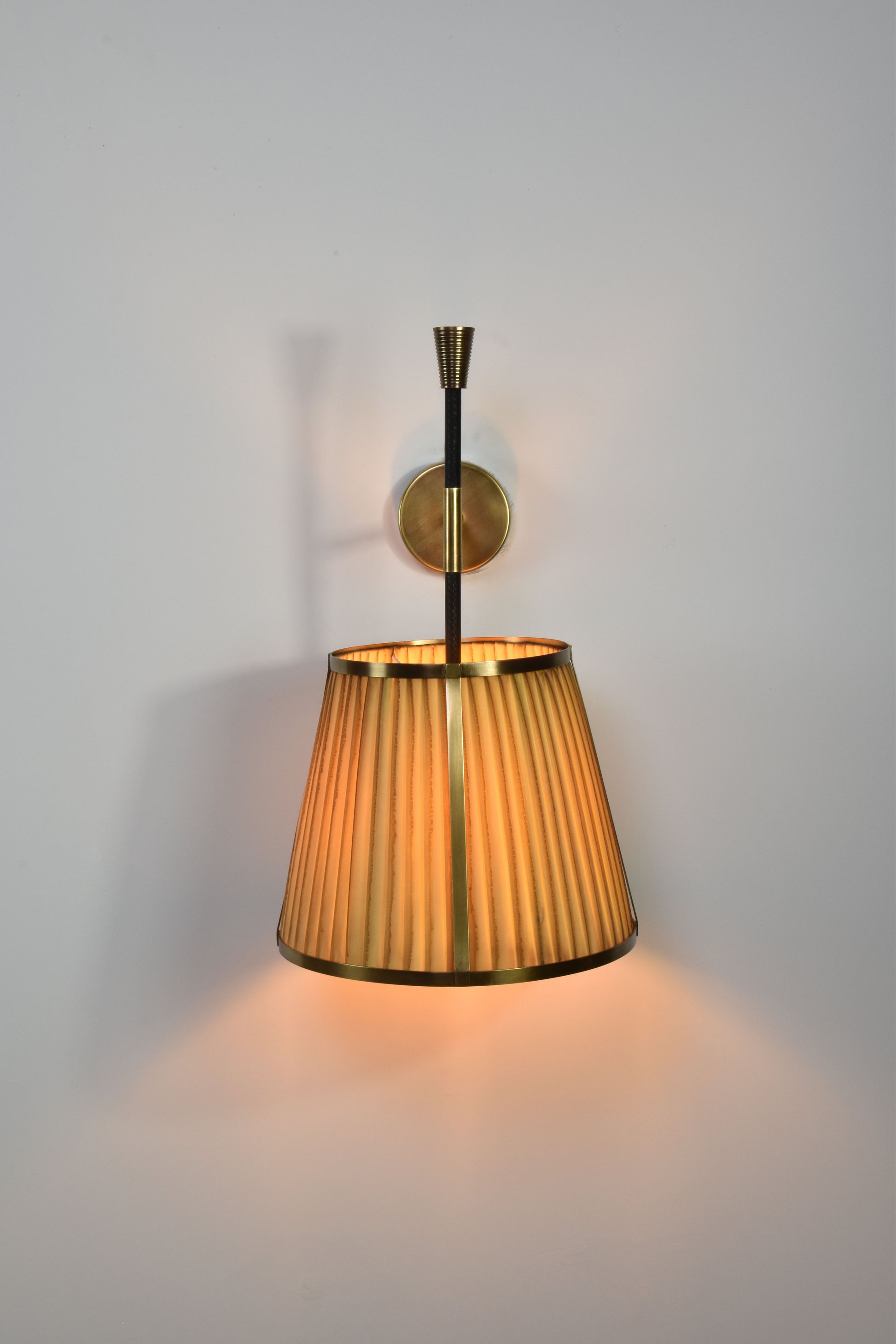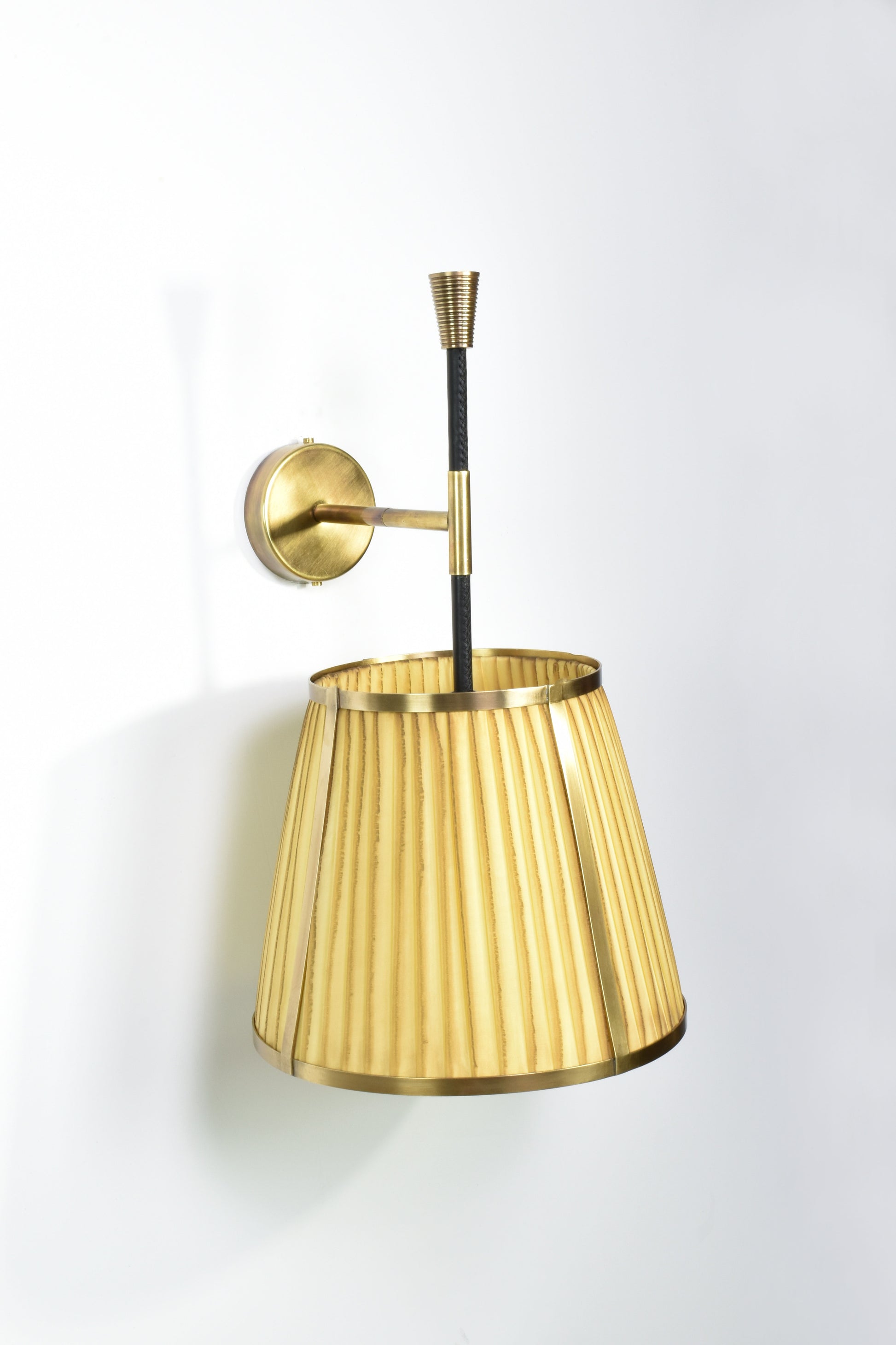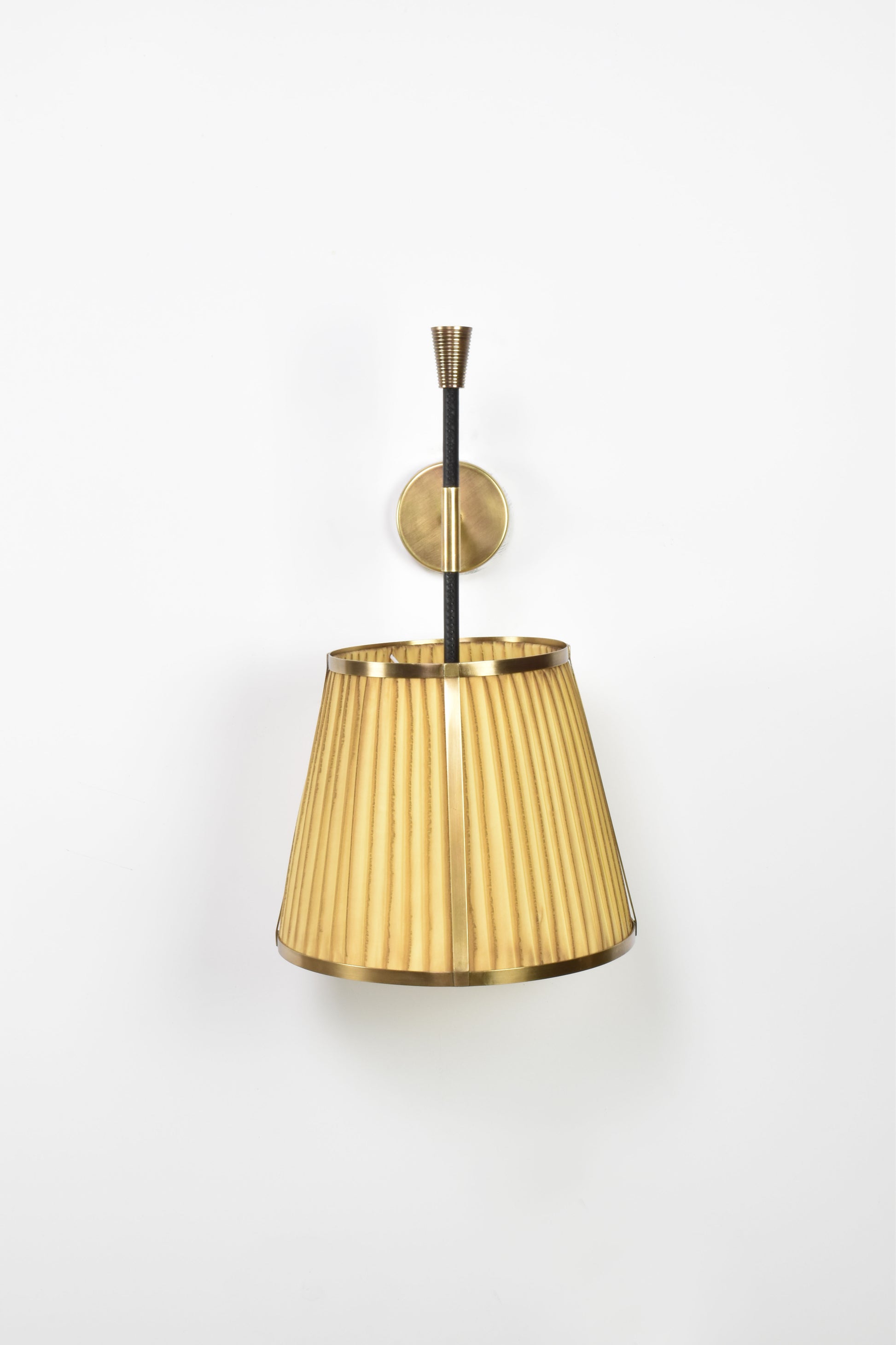 L'applique murale Caeli-w4, fabriquée à la main, allie une structure moderne en laiton à un abat-jour unique en tissu plissé teint à la main. Disponible en version naturelle ou teintée, cet abat-jour présente de subtiles variations, permettant de créer une ambiance personnalisée dans chaque pièce.