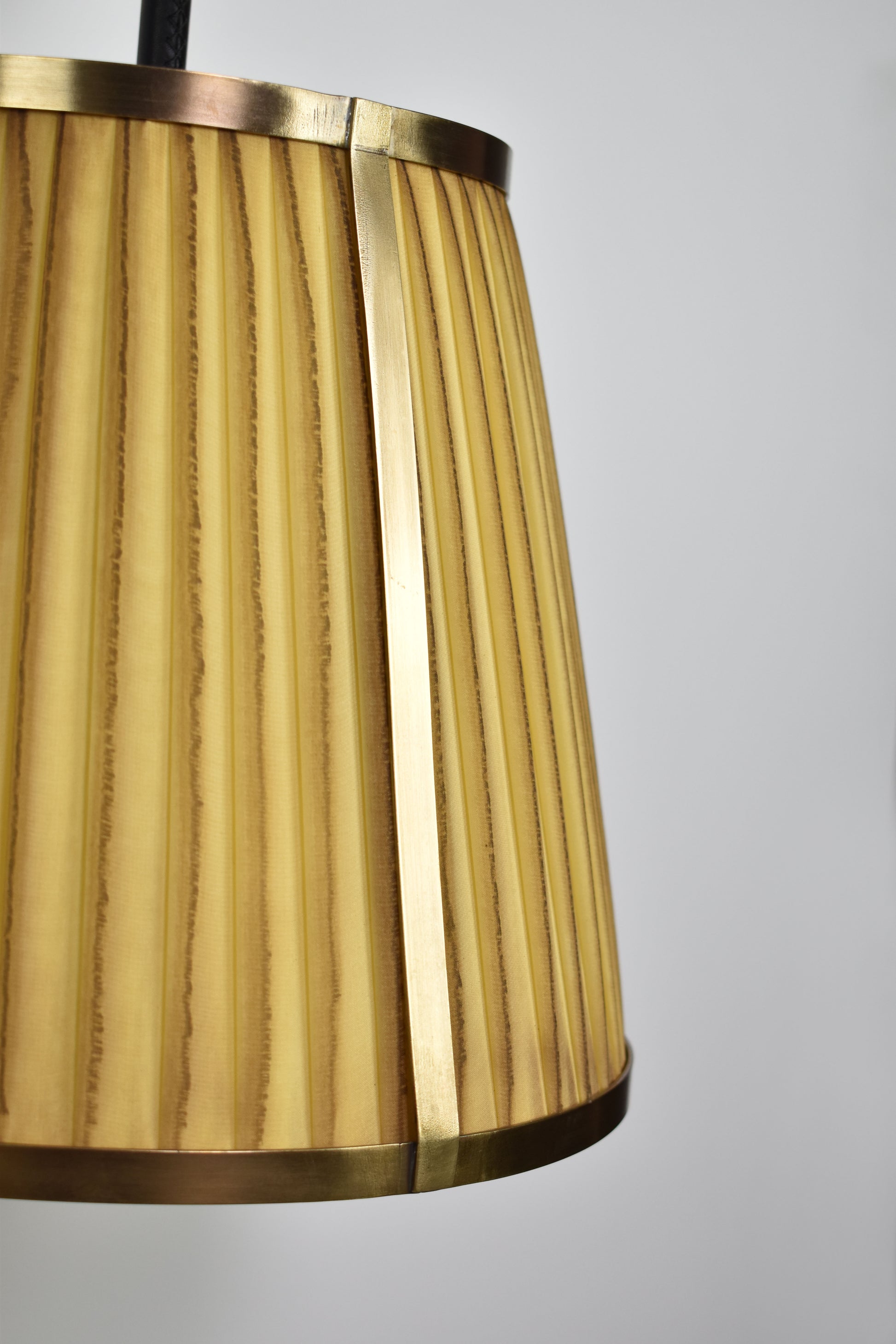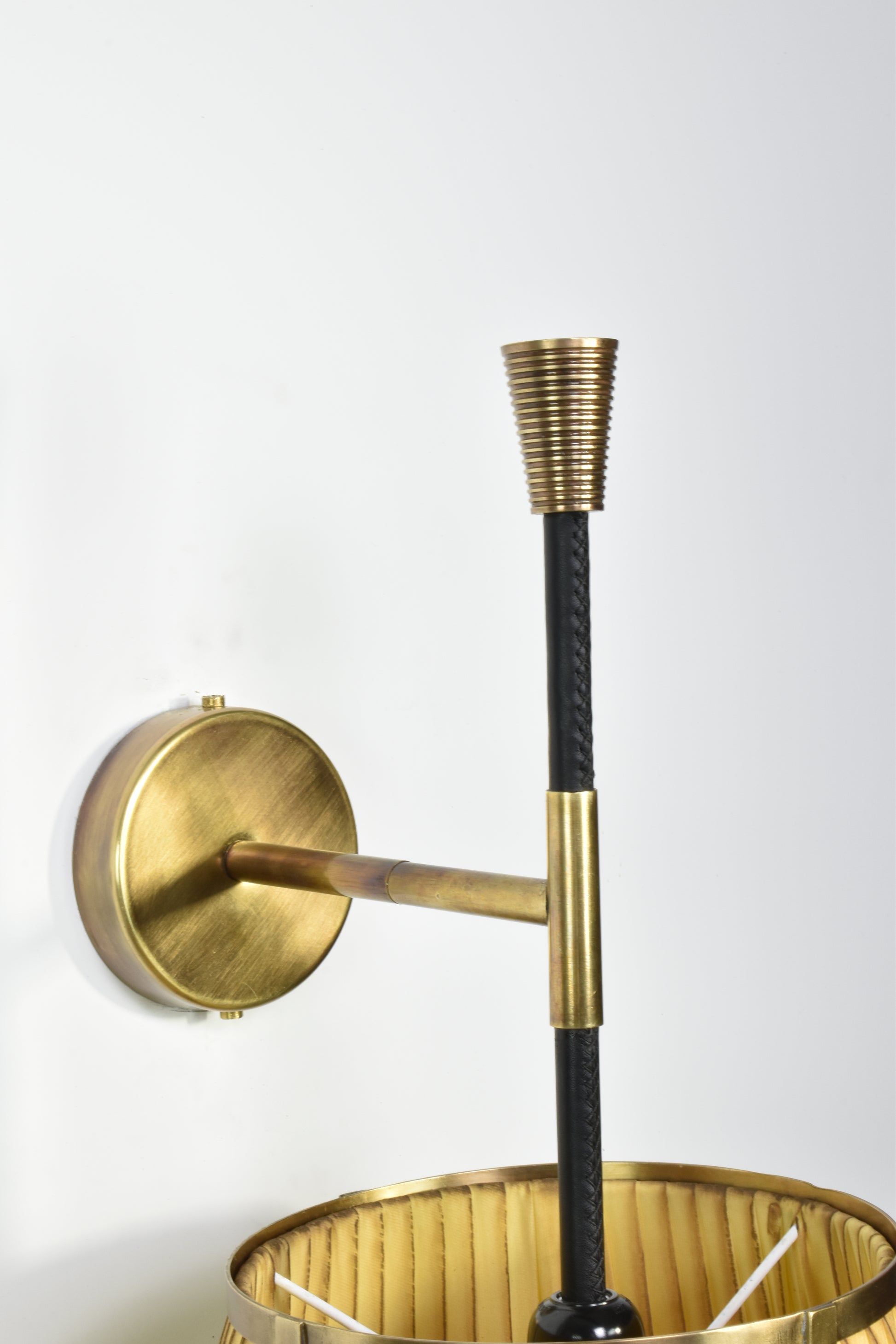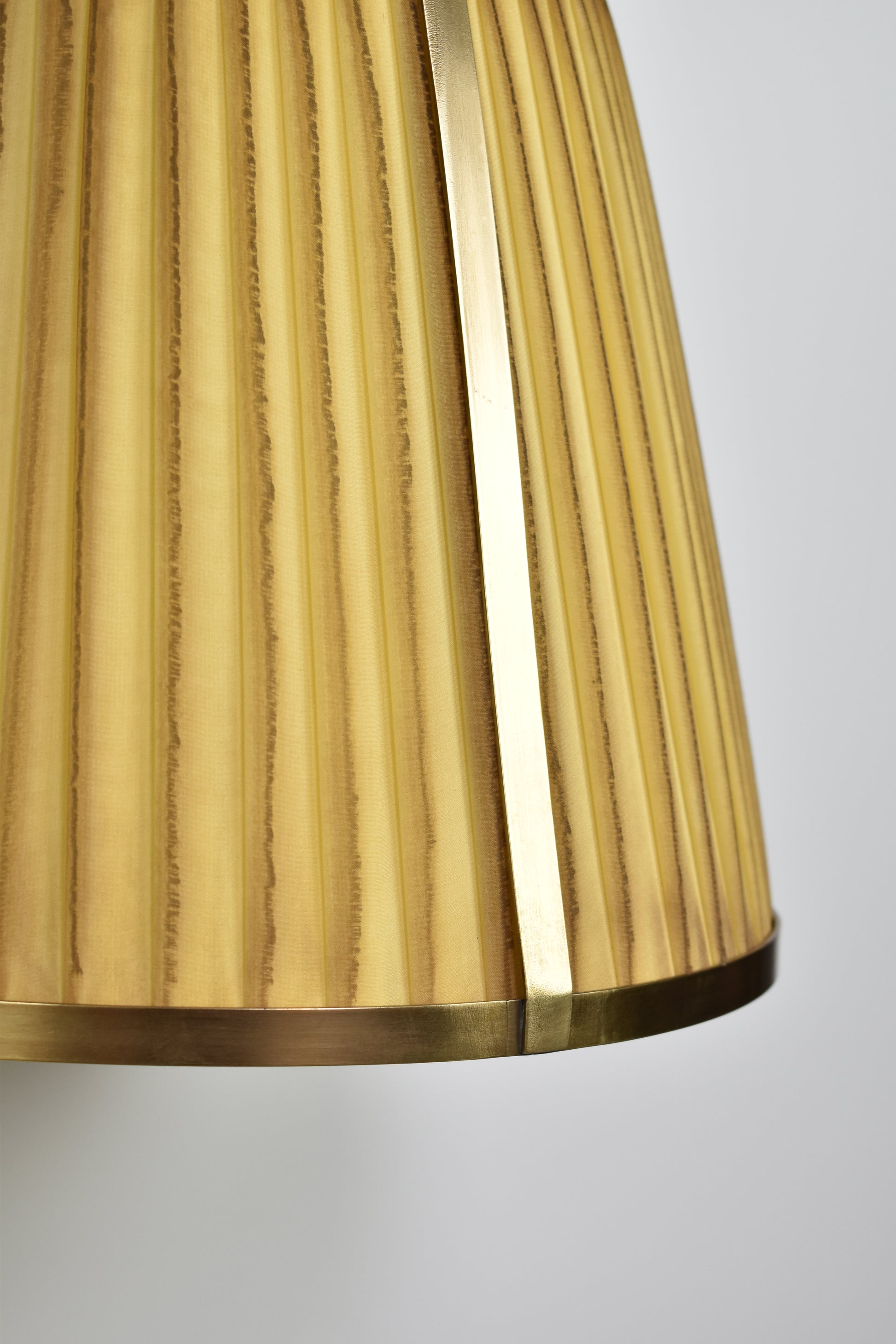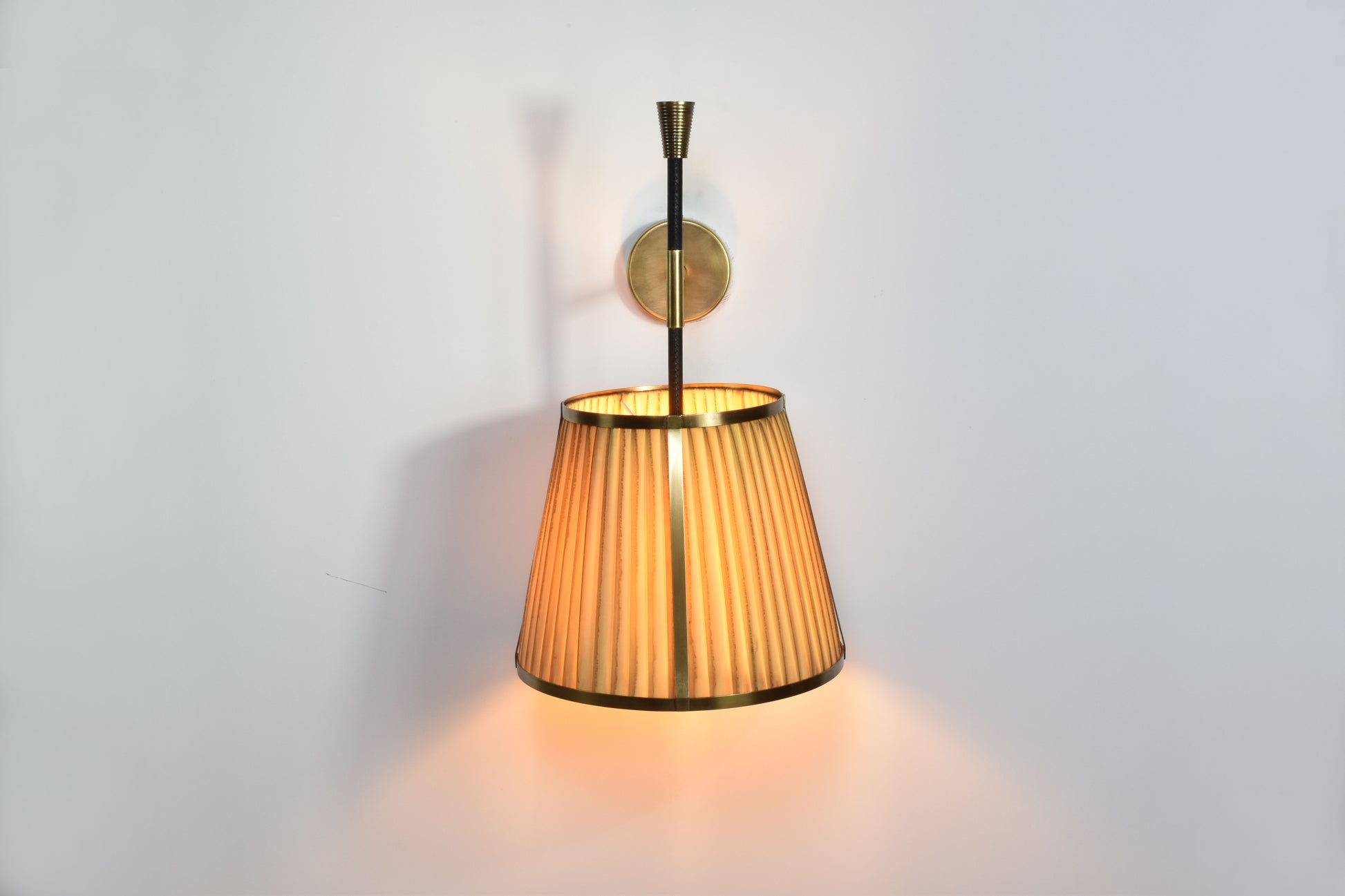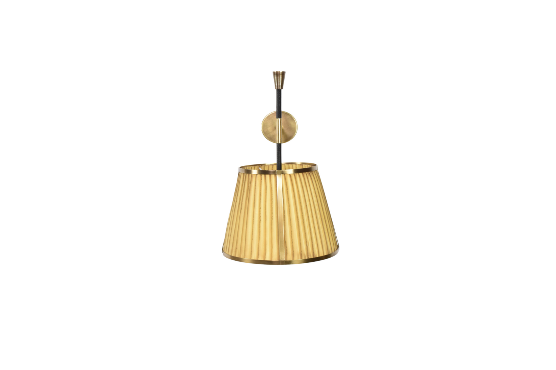 L'applique murale Caeli-w4, fabriquée à la main, allie une structure moderne en laiton à un abat-jour unique en tissu plissé teint à la main. Disponible en version naturelle ou teintée, cet abat-jour présente de subtiles variations, permettant de créer une ambiance personnalisée dans chaque pièce.