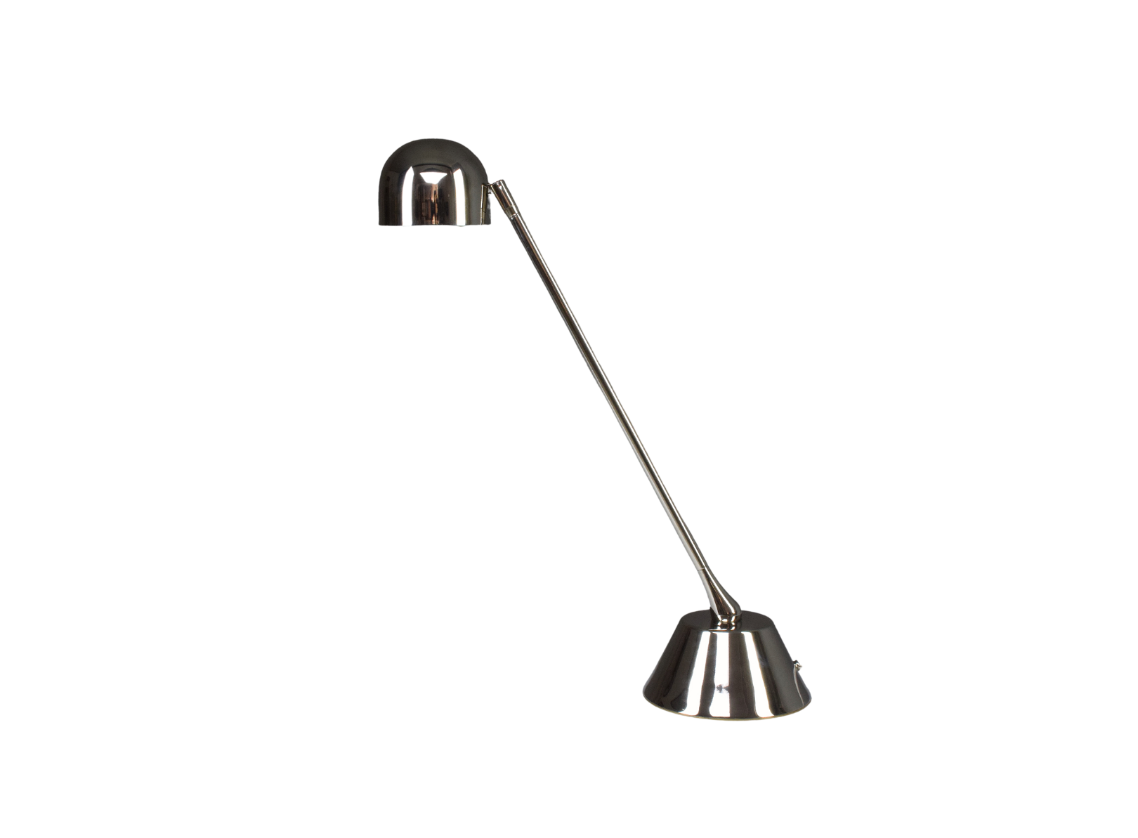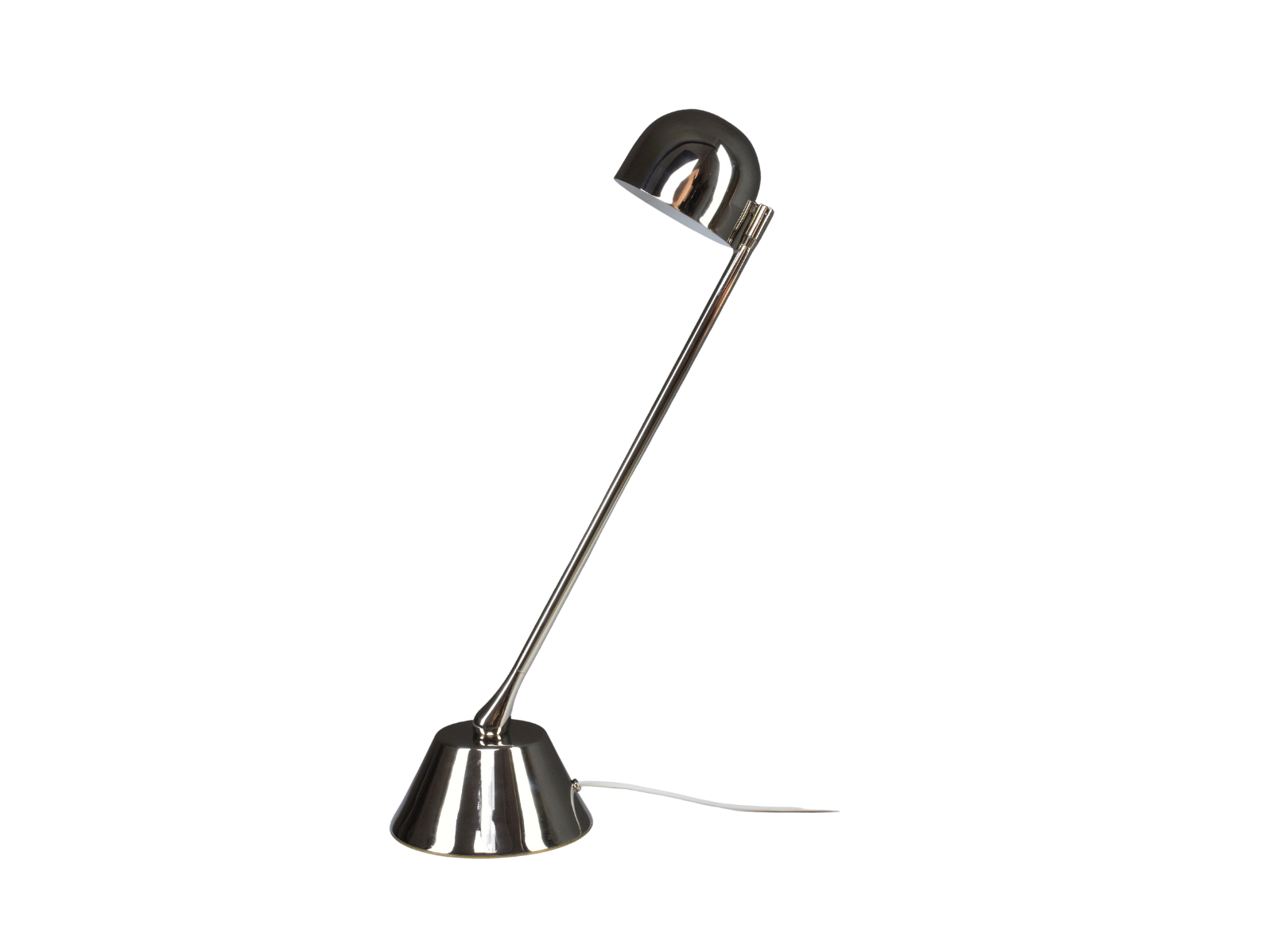 La D.Light T1 est une lampe de bureau design conçue et fabriquée à la main en laiton nickelé massif avec un support tubulaire directionnel et un abat-jour sphérique réglable.