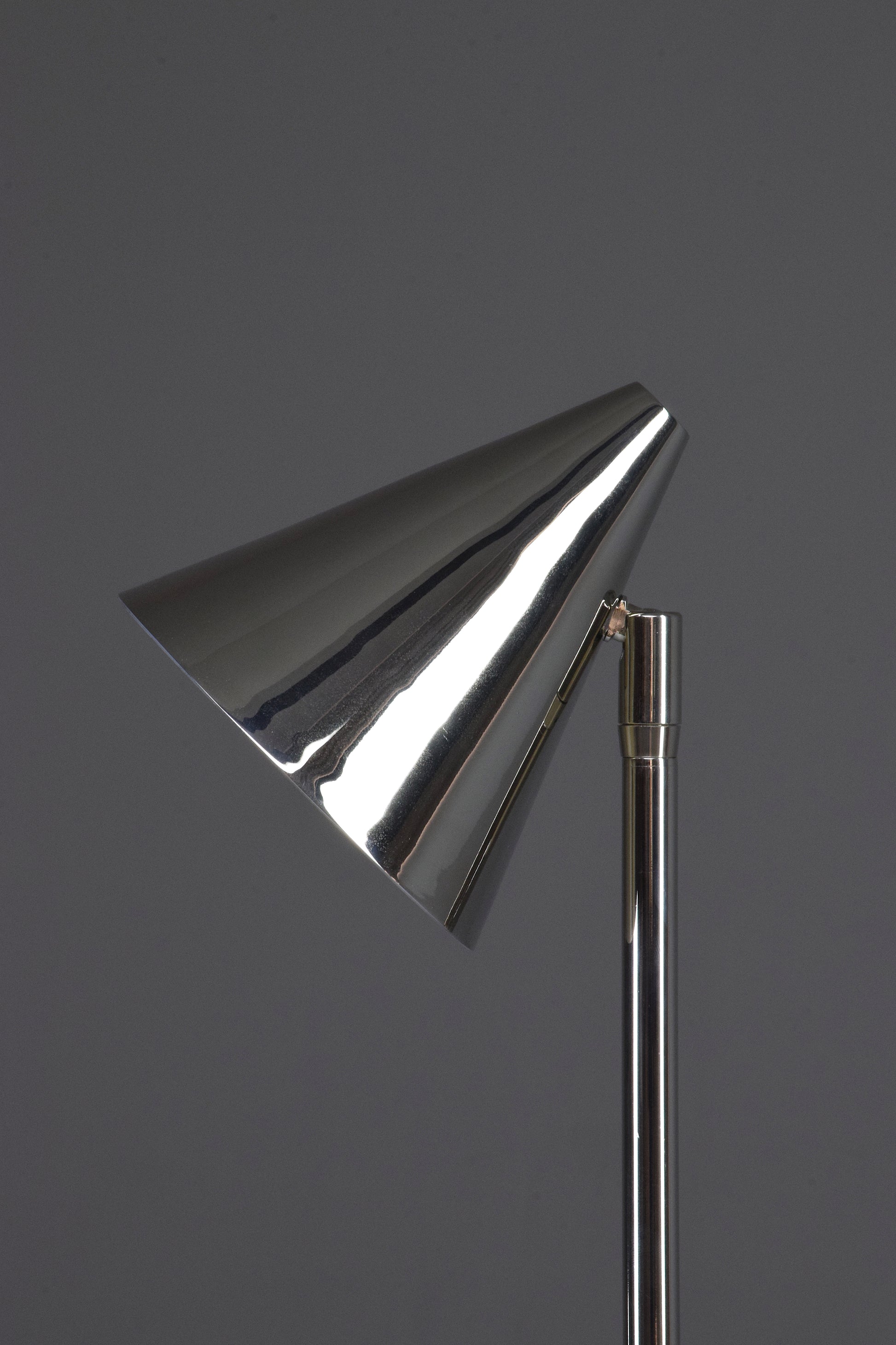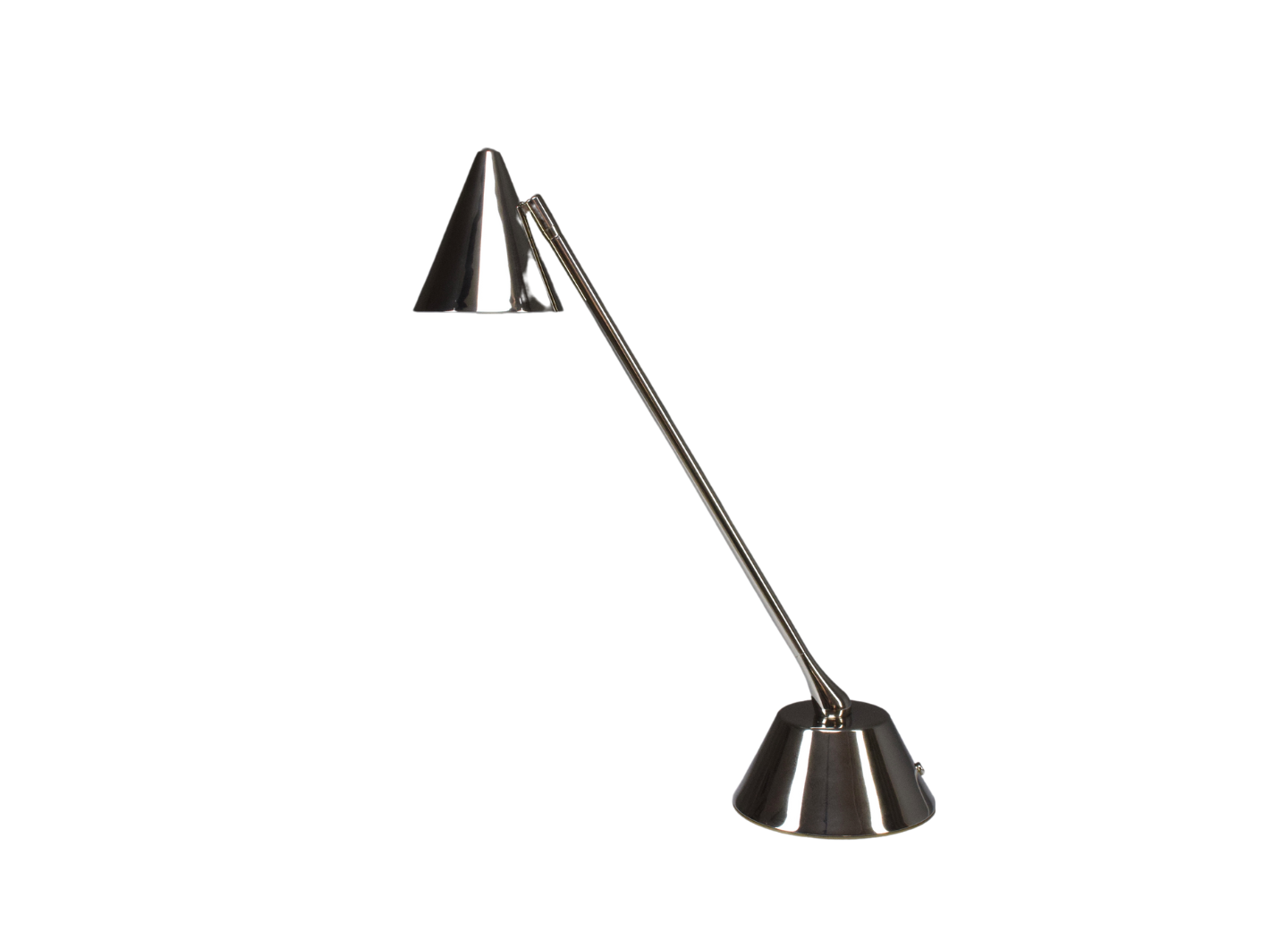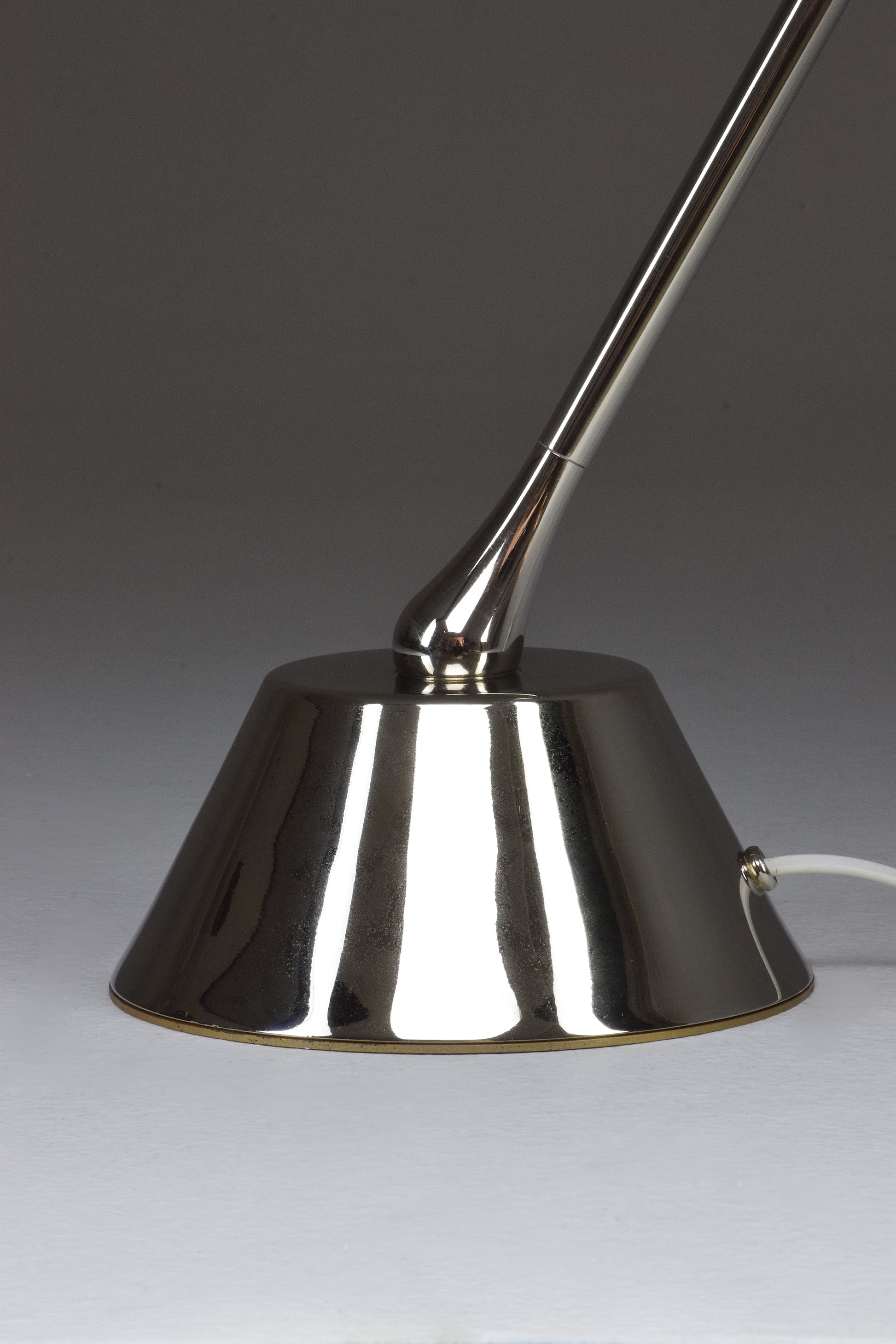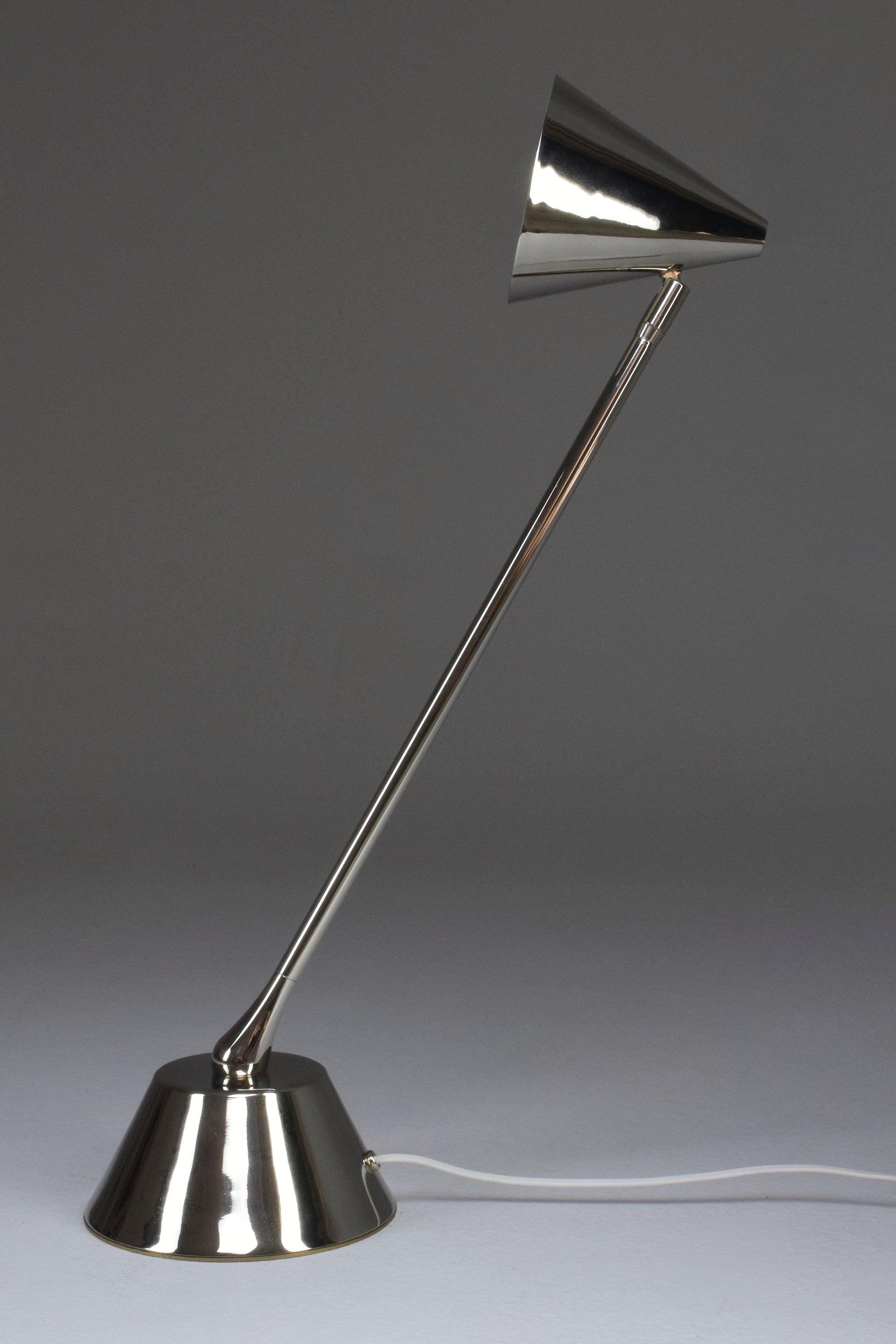 La De.Light T2 est une lampe de table ou de bureau sophistiquée conçue en laiton nickelé massif avec un support tubulaire directionnel et un abat-jour conique réglable.