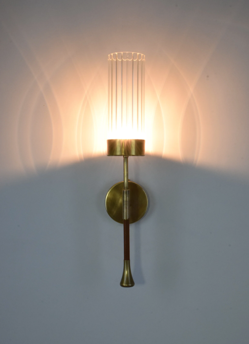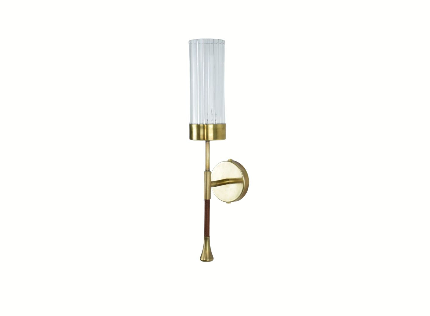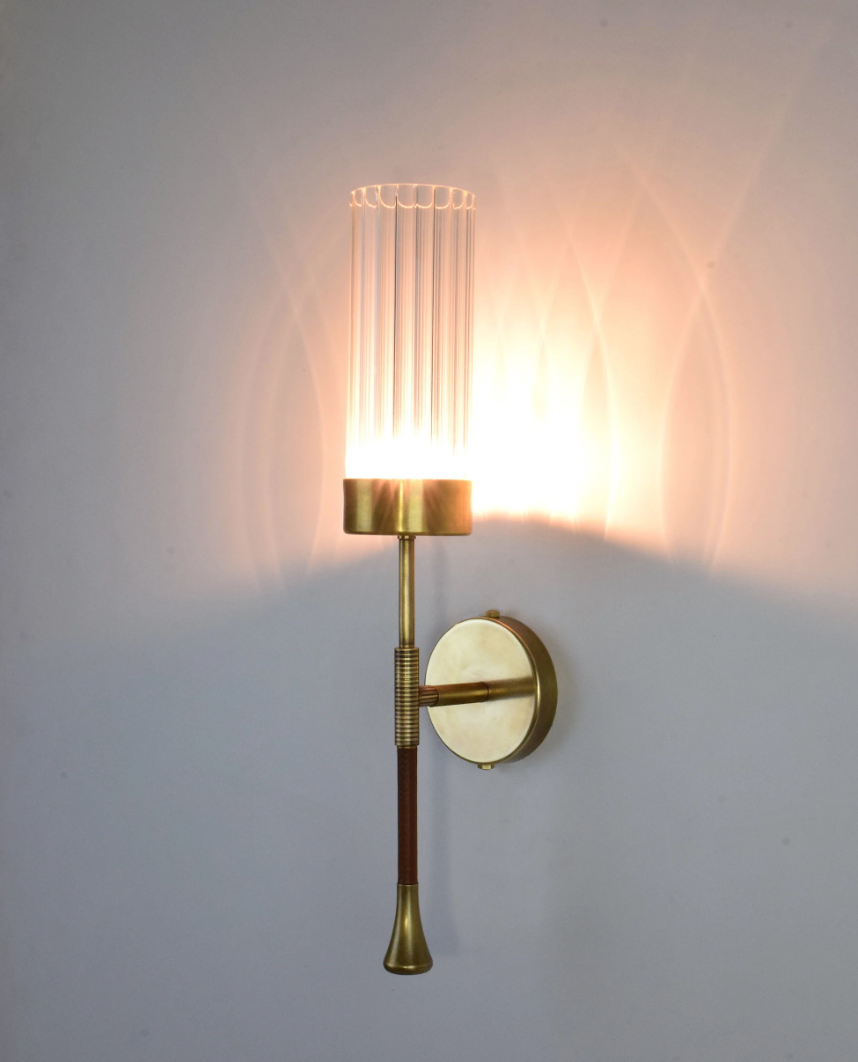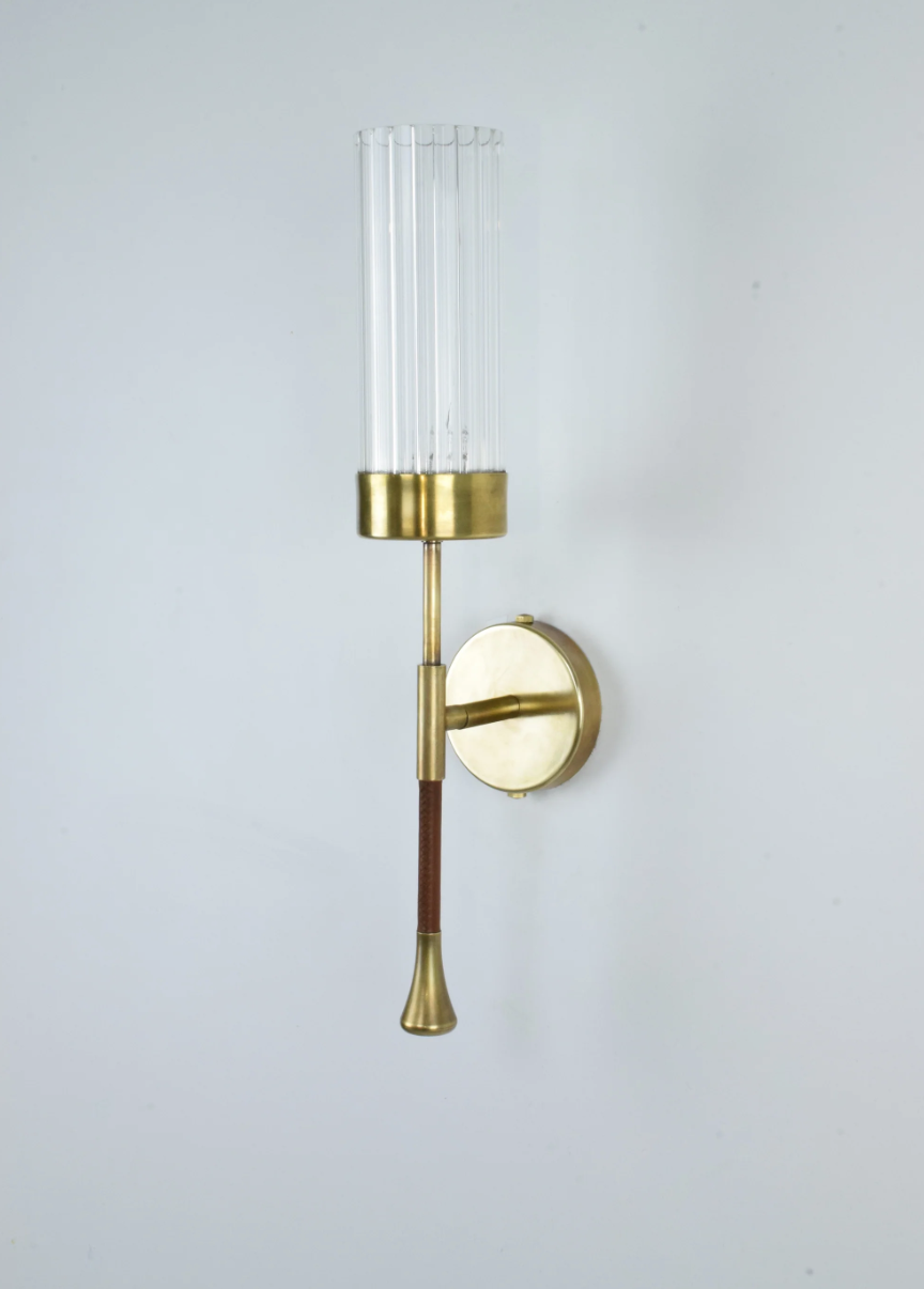 Une applique murale intemporelle, dotée d'une structure en laiton massif, sublimée par une tige gainée de cuir et un abat-jour en verre texturé cylindrique. Disponible en version simple ou double, avec la possibilité d'une gravure moderne.
