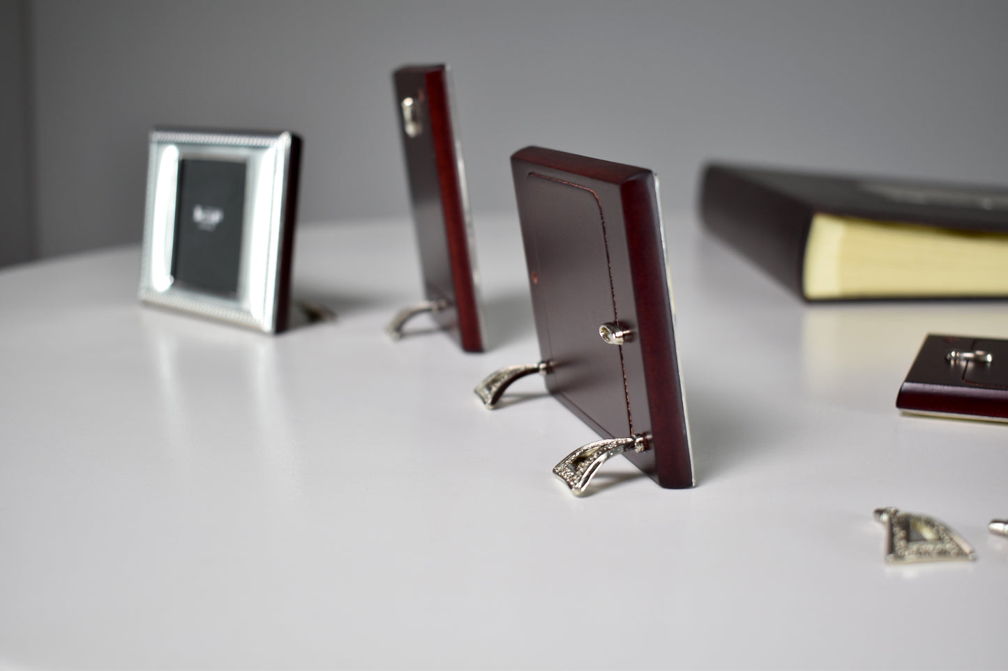 Superbe ensemble de petits cadres photo en argent sterling de style art déco du 21e siècle avec un élégant album photo noir conçu avec une plaque argentée sur la couverture. L'album mesure 25,2 cm x 21 cm Les cadres 9,8 cm x 7,4 cm Non utilisés. Livré dans sa boîte d'origine Marqué IGF argenterie sterling