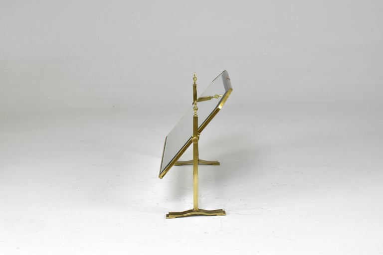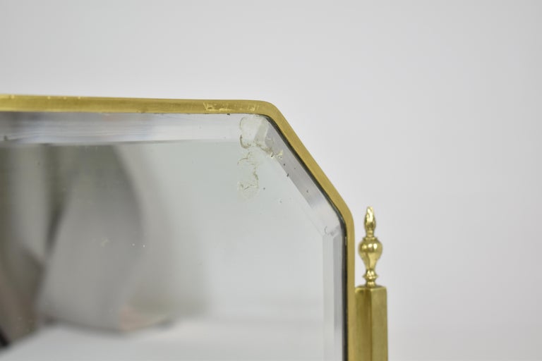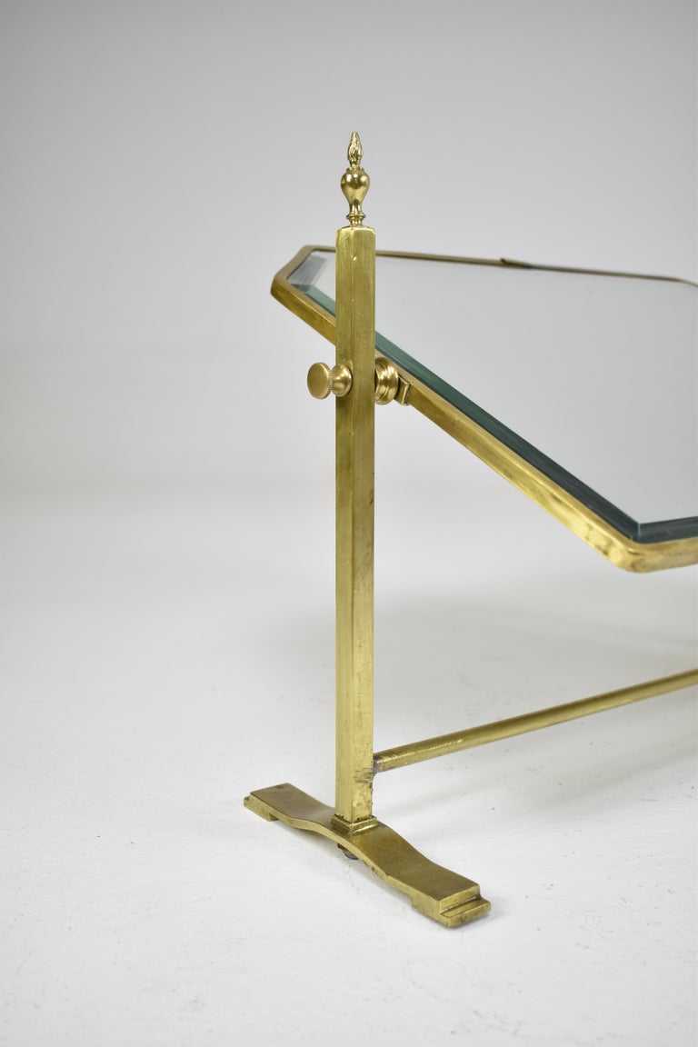 Un fantastique miroir de table français des années 1930 encadré de laiton massif, doté d'un mécanisme d'inclinaison réglable. Son design raffiné comprend des fleurons décoratifs qui en font un ajout intemporel à toute coiffeuse, console ou meuble-lavabo. Les lignes épurées du miroir, son mécanisme d'inclinaison et son bouton s'harmonisent avec le design Art déco ou du début du milieu du siècle.