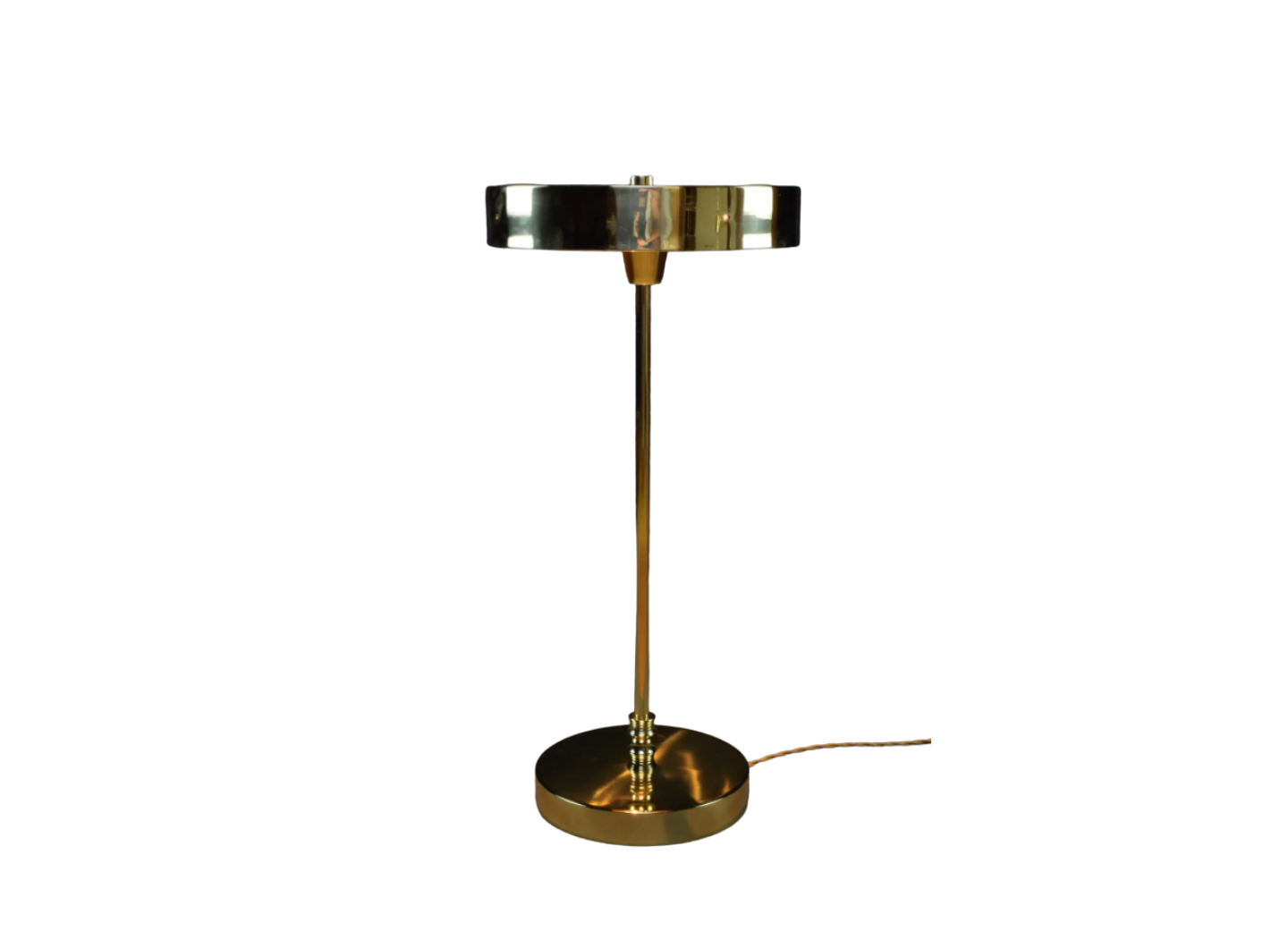 Une lampe minimaliste en laiton, mise en valeur par sa base en forme de disque et son abat-jour diffusant la lumière par le bas. Idéale pour la lecture, comme lampe de bureau ou comme lampe d'appoint.