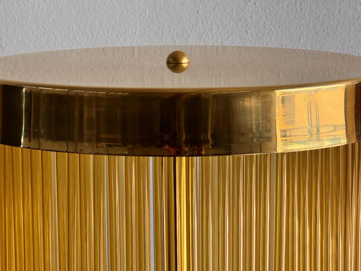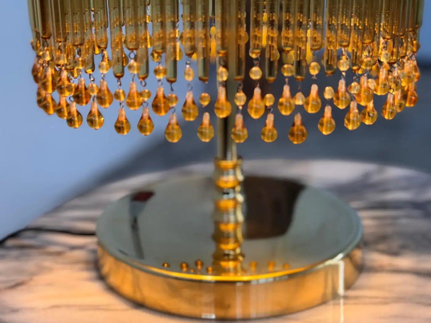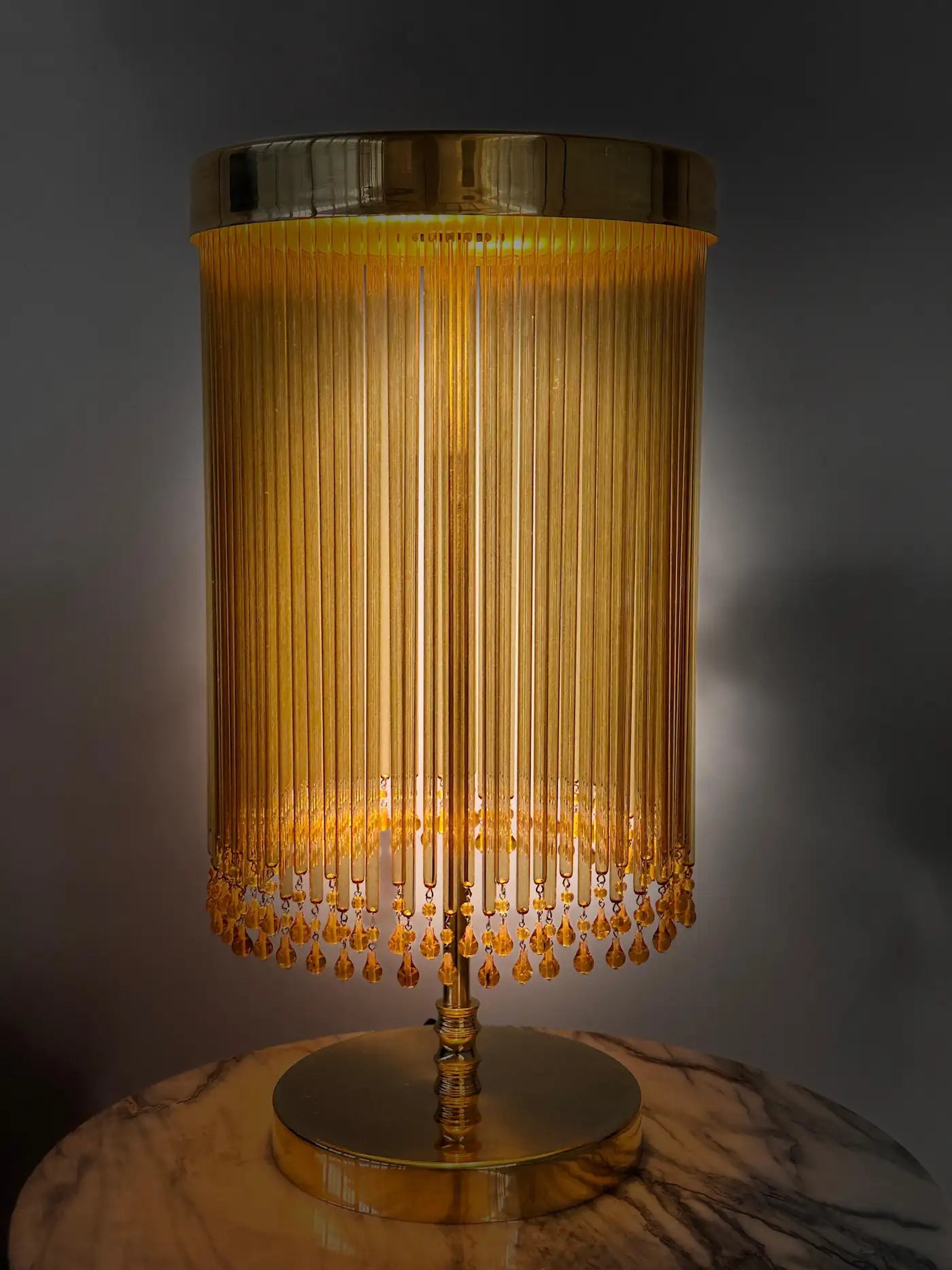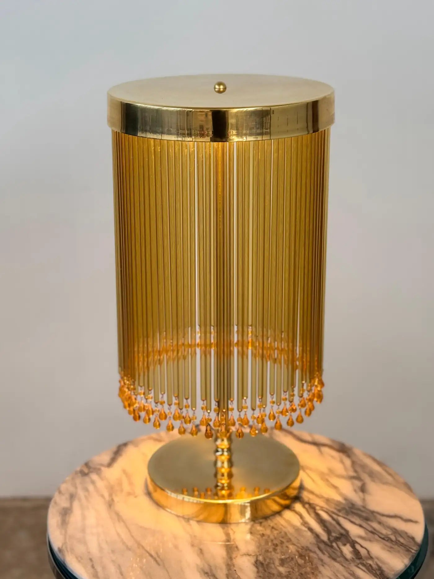 Handcrafted in Portugal, the IDRIA‑T2 is a striking table lamp defined by its cylindrical shade of vertical golden glass rods, each individually finished with an amber crystal drop. This intricate composition catches and refracts the light, casting a warm, golden glow enriched by shimmering reflections.