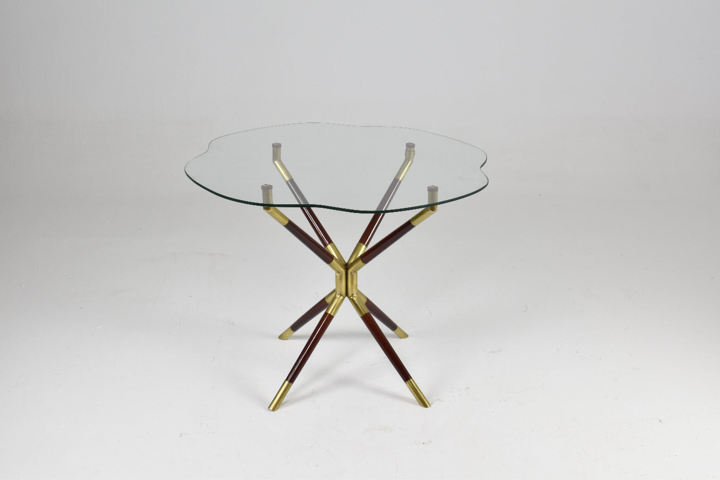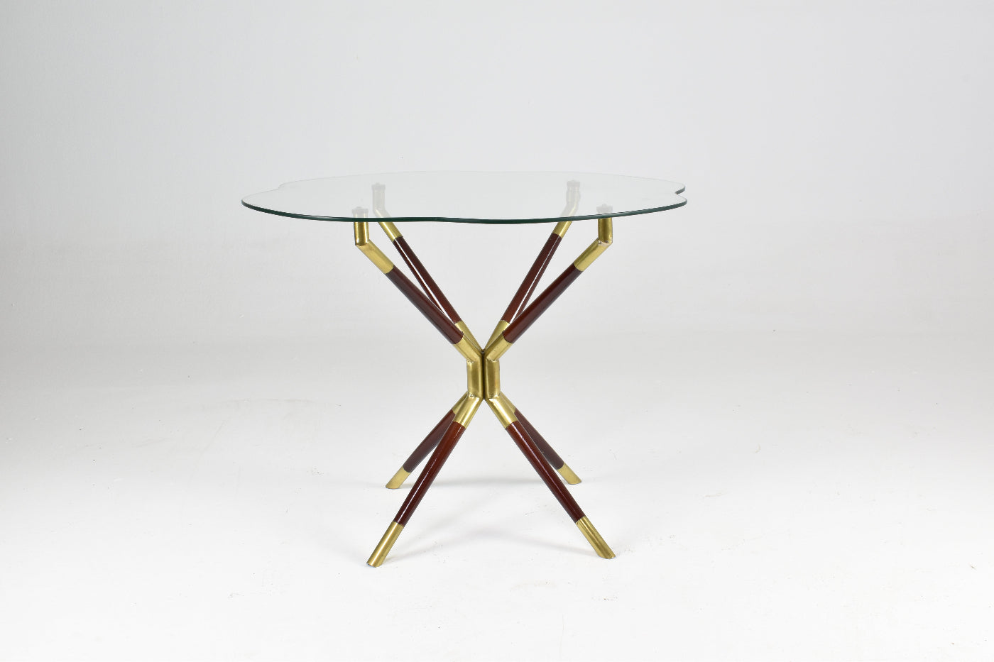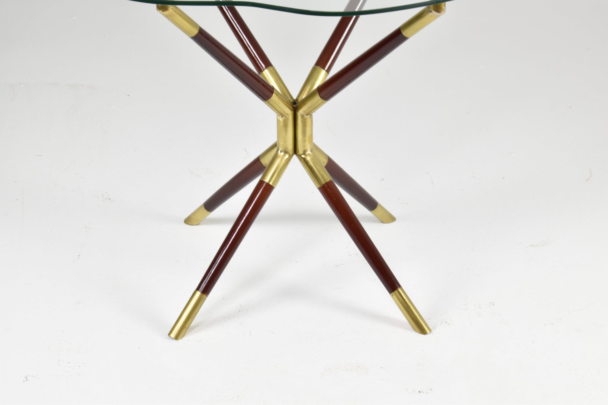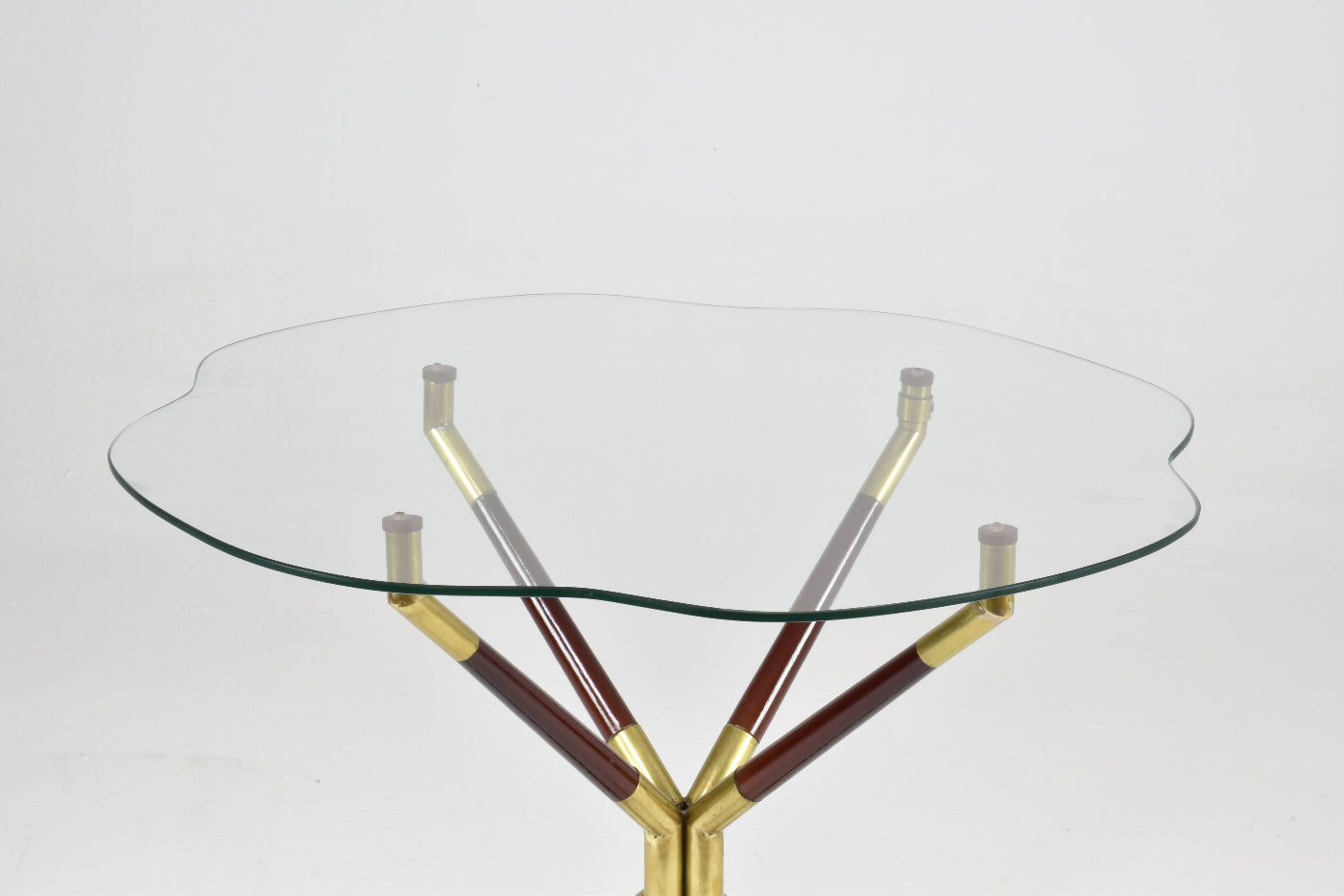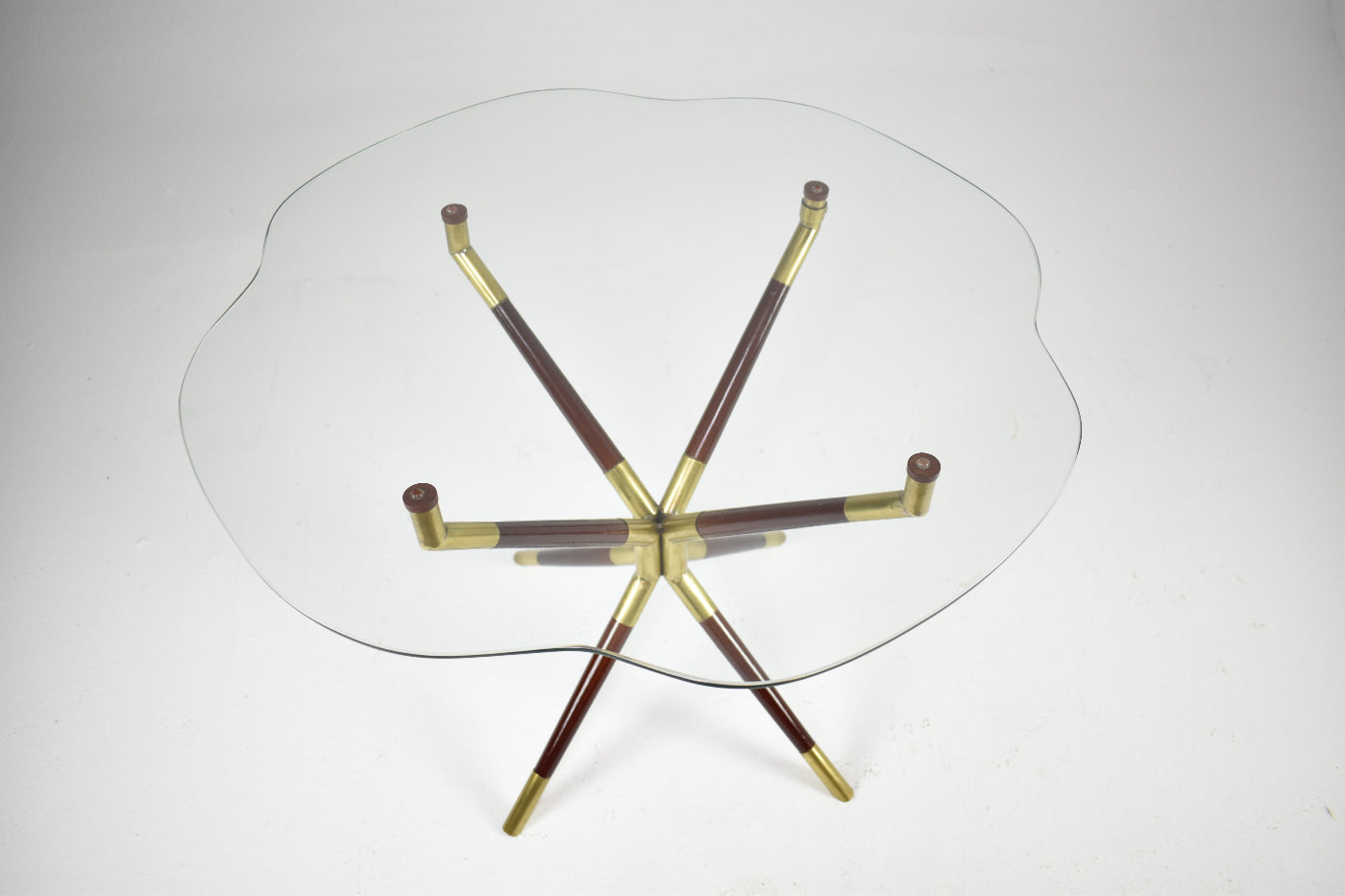 Table basse italienne moderne du milieu du siècle des années 50, attribuée à Cesare Lacca. Son plateau en verre organique en forme de pétale repose sur une base sculpturale composée de quatre pieds évasés en métal laqué, reliés par des embouts en laiton poli. La structure centrale en laiton ancre la composition.