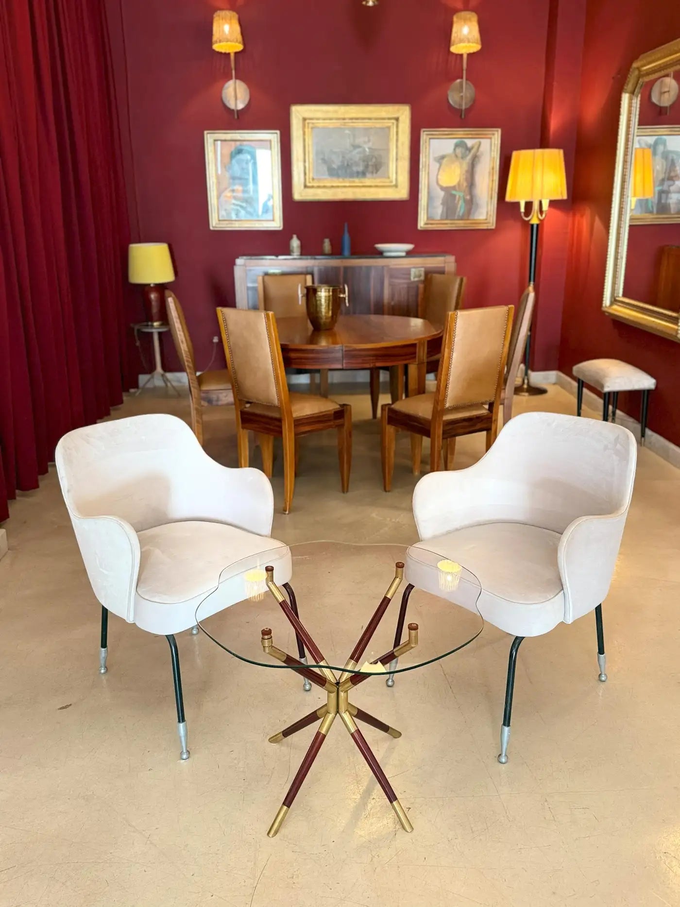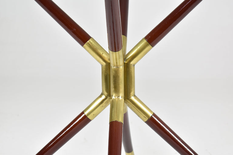 Le contraste entre le plateau en verre aérien et incurvé et le métal laqué et le laiton. Excellent état vintage avec une légère patine conforme à son âge.