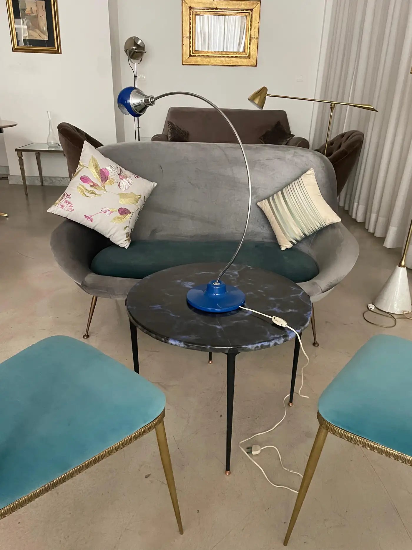 Rare canapé italien du XXe siècle, fabriqué par ISA Bergamo. Sa forme organique et incurvée, son anneau extérieur rembourré et sa profondeur confortable reposent sur des pieds évasés en laiton poli. Entièrement restauré, il est recouvert de velours bicolore gris et bleu. Italie, vers les années 1950.