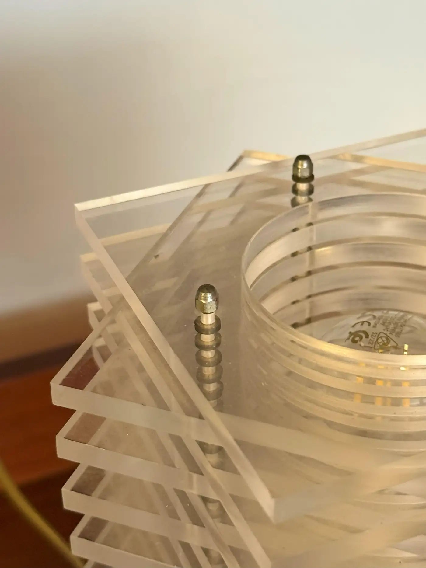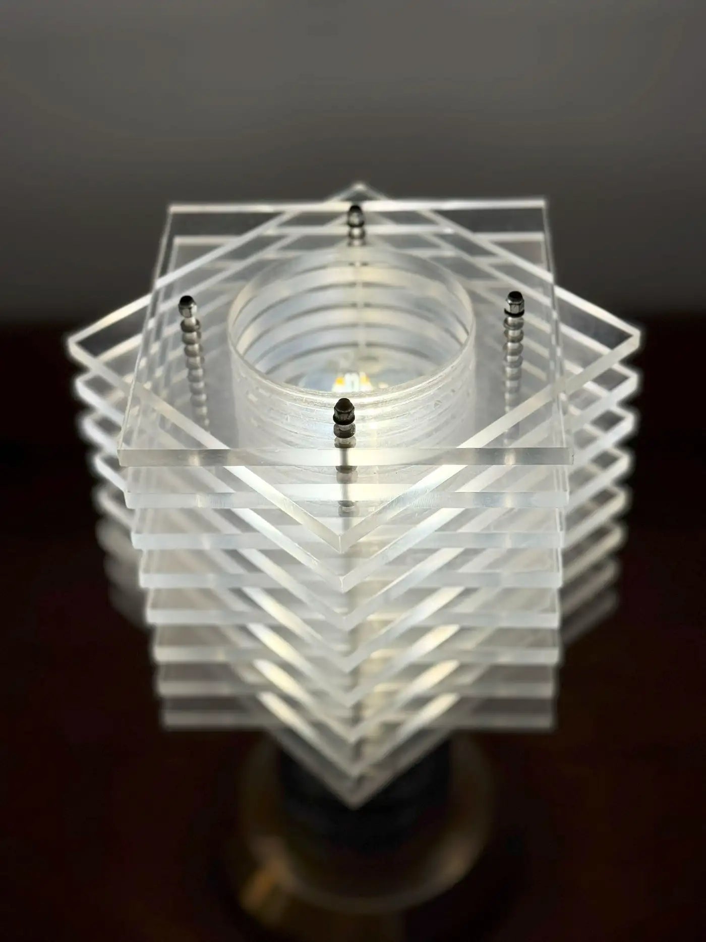 L'abat-jour architectural est composé de lames de Lucite horizontales empilées, créant un effet de persiennes distinctif qui diffuse la lumière dans une lueur ambiante et chaleureuse.