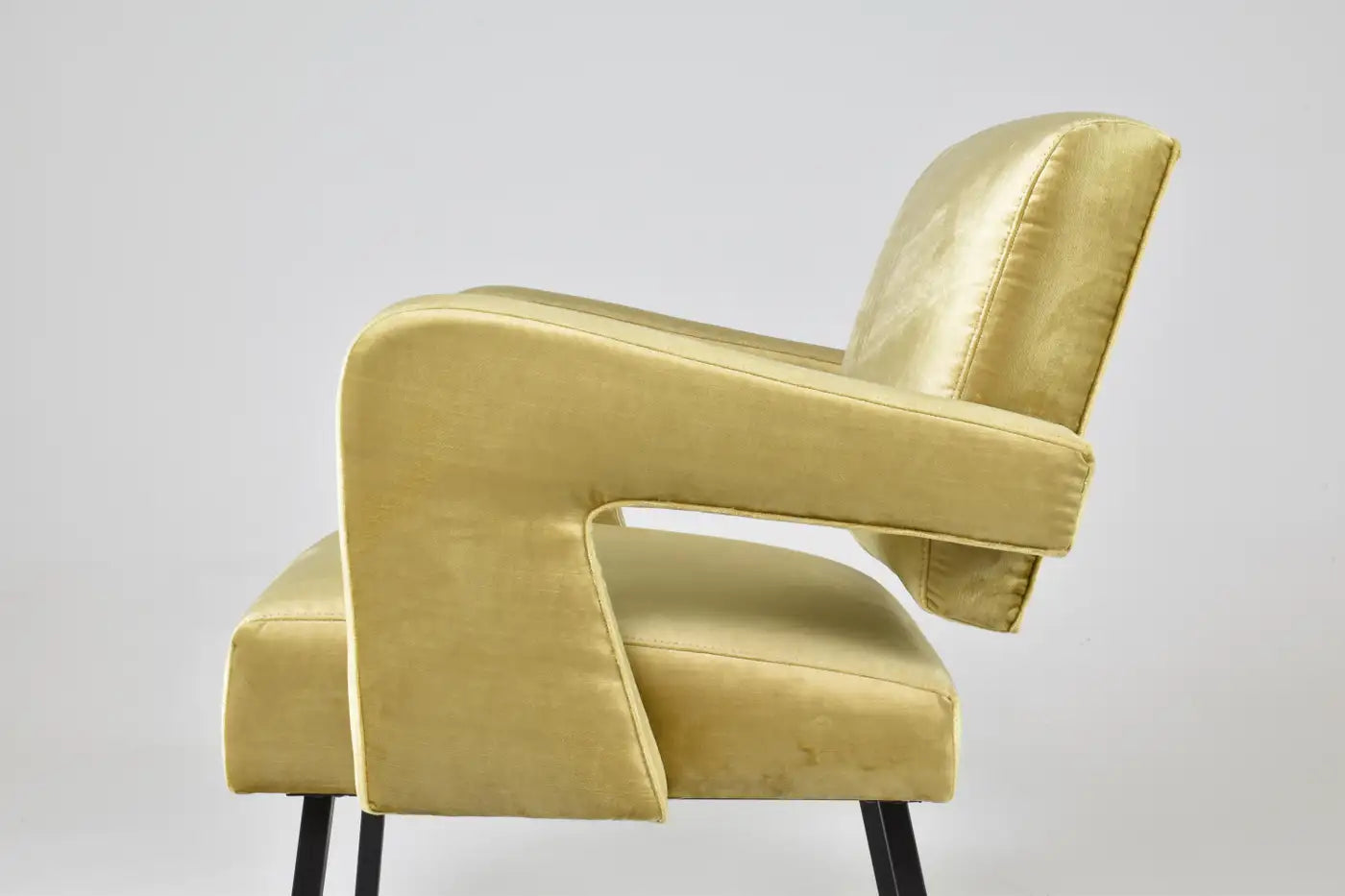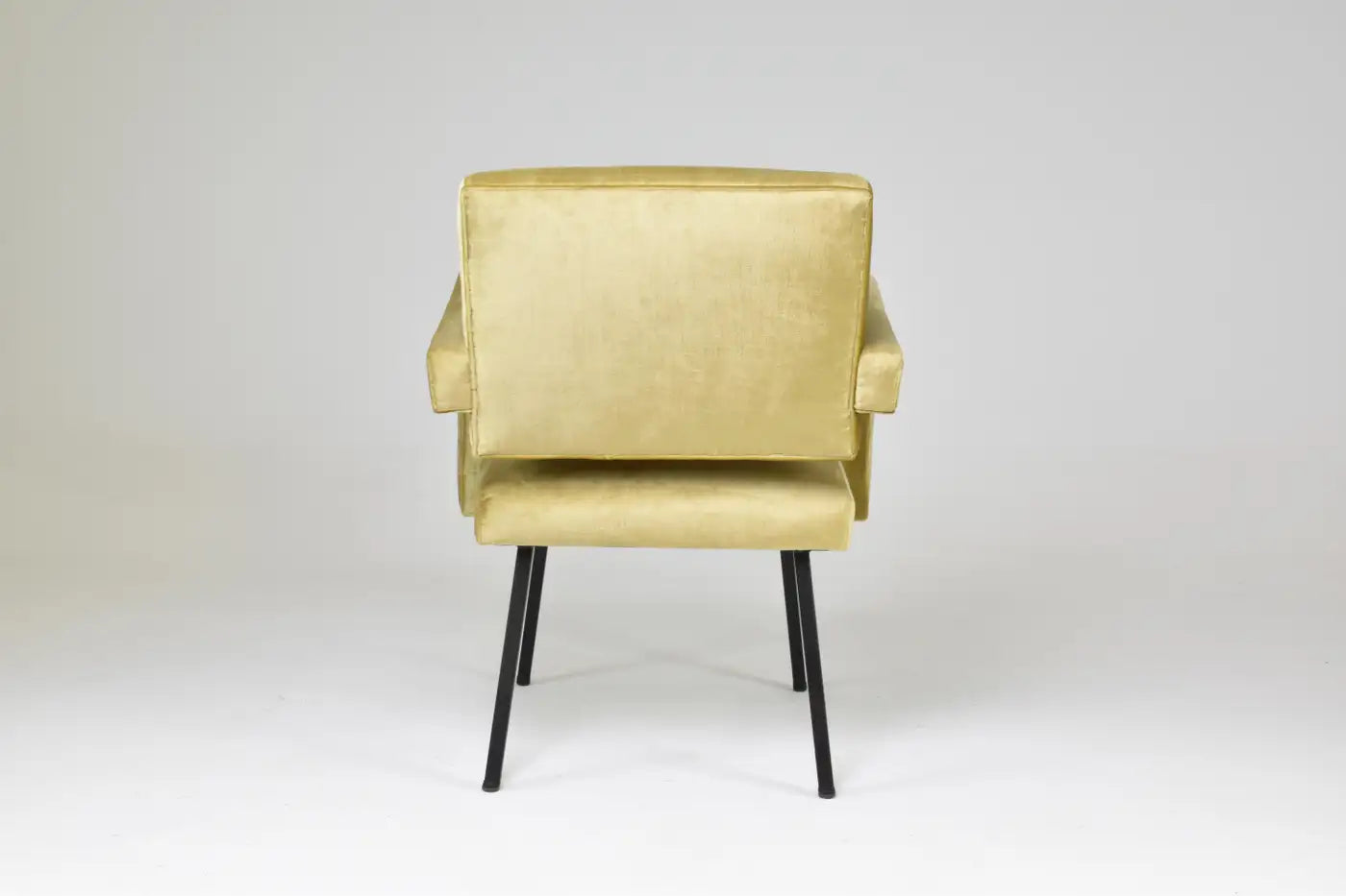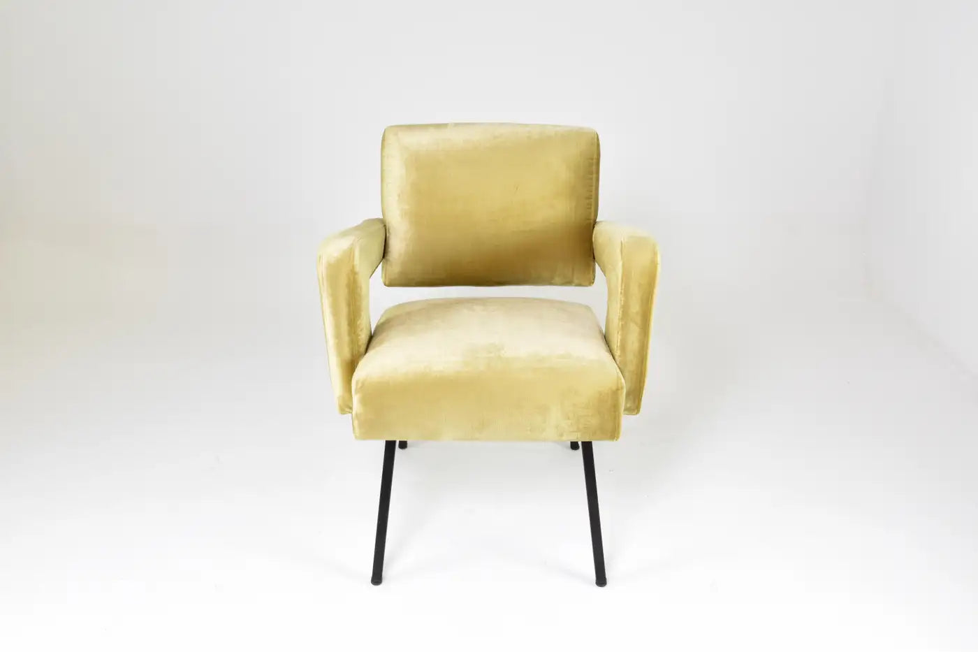 Ce fauteuil sculptural des années 1950 de Jacques Adnet illustre son mélange unique de géométrie moderniste et de savoir-faire français raffiné. Récemment restauré dans un doux velours jaune doré, il est doté d'accoudoirs en porte-à-faux dynamiques et de pieds en métal émaillé noir.