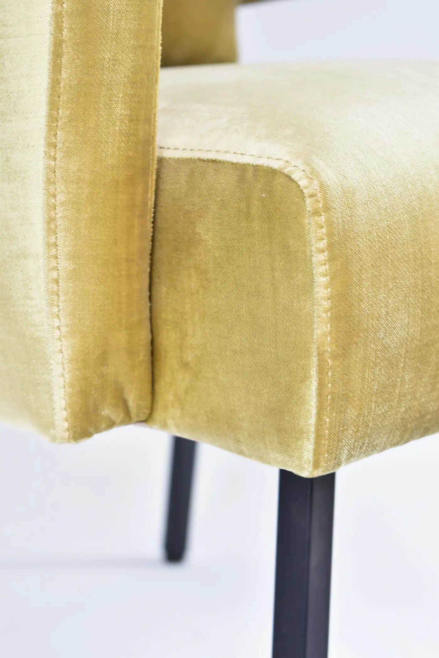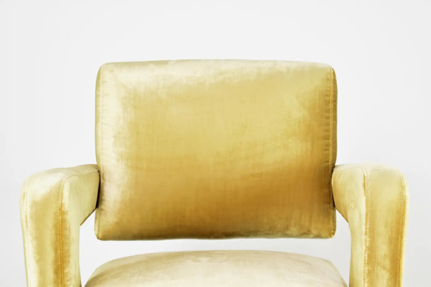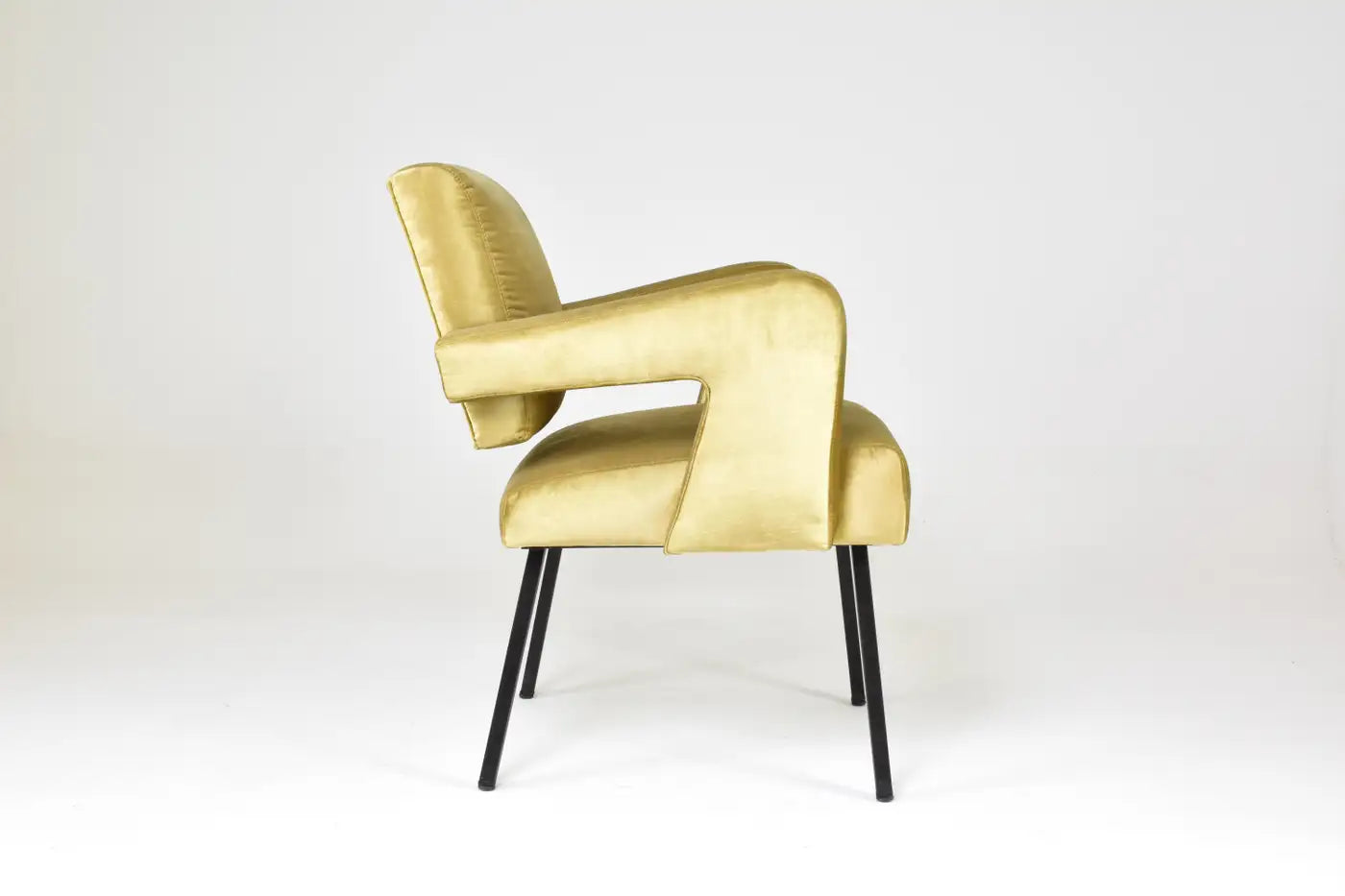 Ce fauteuil sculptural des années 1950 de Jacques Adnet illustre son mélange unique de géométrie moderniste et de savoir-faire français raffiné. Récemment restauré dans un doux velours jaune doré, il est doté d'accoudoirs en porte-à-faux dynamiques et de pieds en métal émaillé noir.