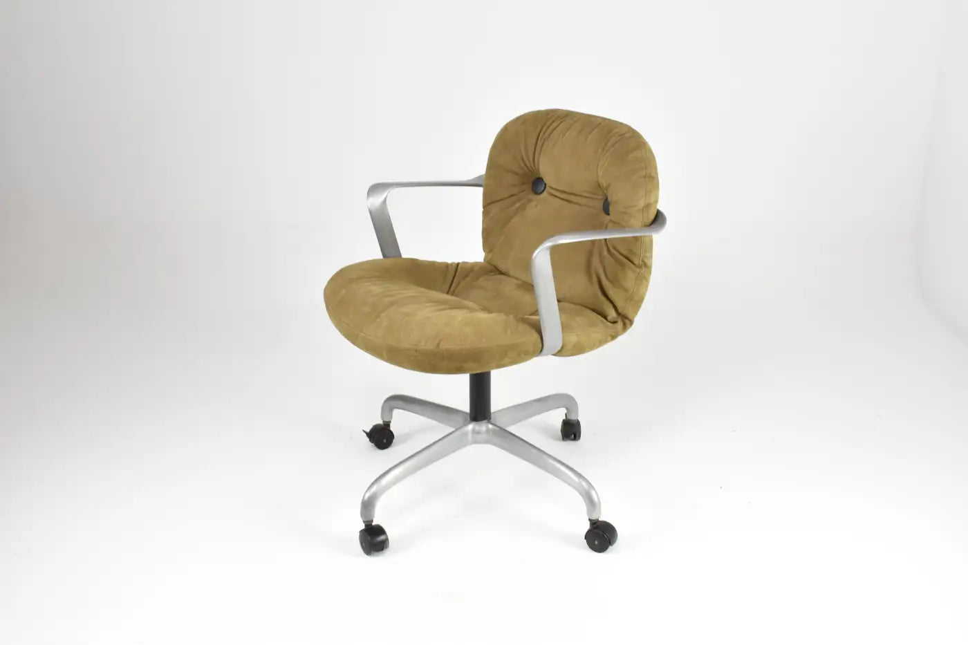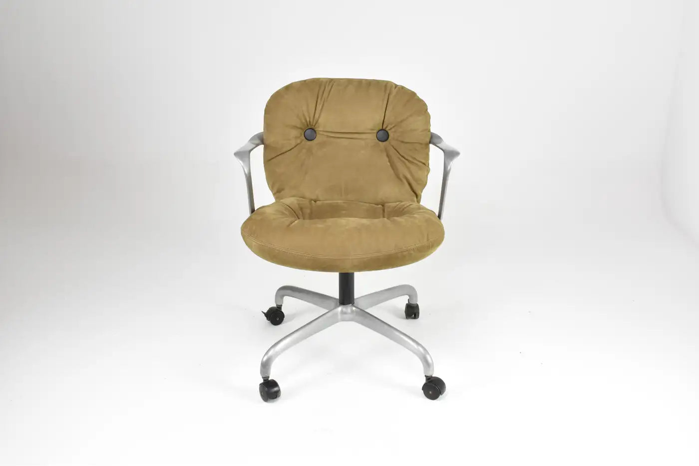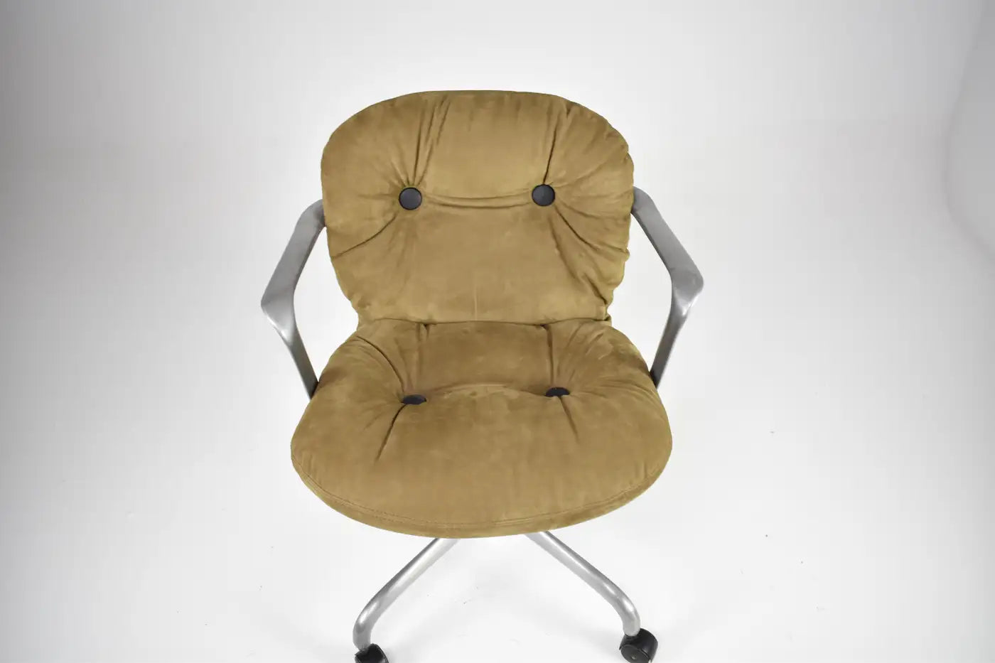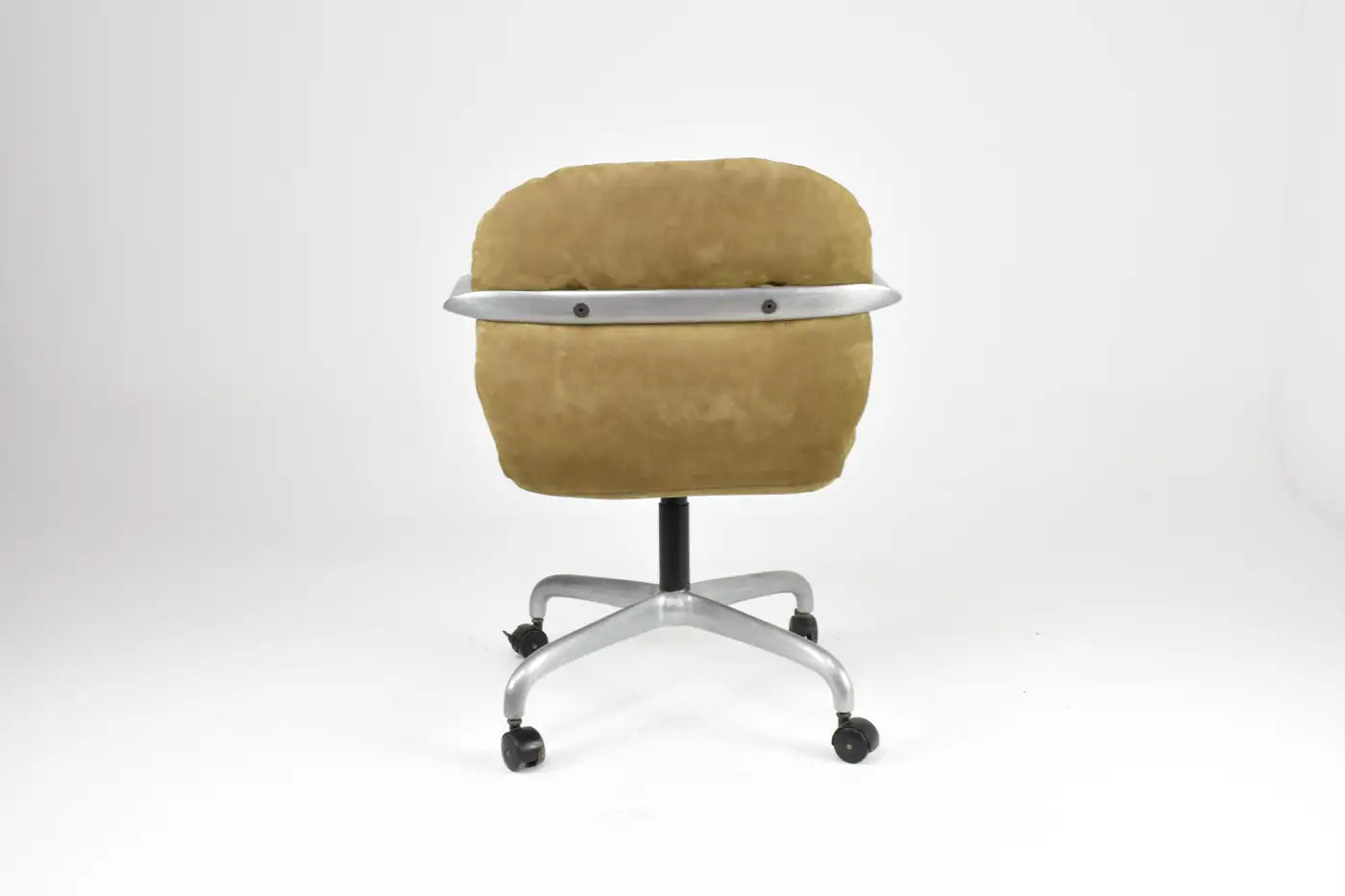 Superbe chaise de bureau dessinée aux USA par Bruce Hannah et Andrew Morrison pour Knoll dans les années 1950-1960 composée d'une structure en aluminium soigneusement polie avec base pivotante sur roulettes et retapissé d'un velours moutarde.