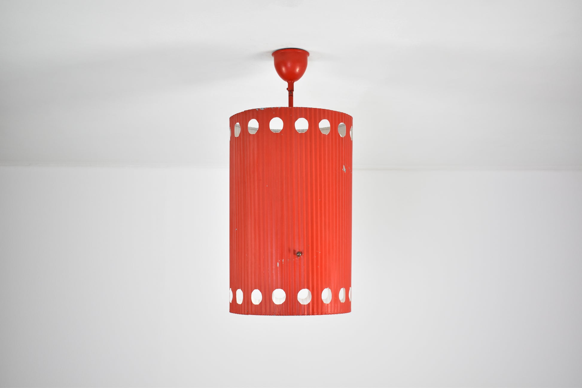 Cette pièce de design saisissante, la suspension « Java » de Mathieu Matégot en rouge, témoigne avec brio de la maîtrise de la forme et de la matière du créateur. Fabriquée dans les années 1950, cette pièce arbore sa finition rouge d'origine, mettant en valeur la technique du métal perforé, signature de Matégot. L'abat-jour cylindrique est orné de découpes circulaires régulièrement espacées et de subtiles nervures verticales, créant un magnifique jeu d'ombre et de lumière lorsqu'il est illuminé.