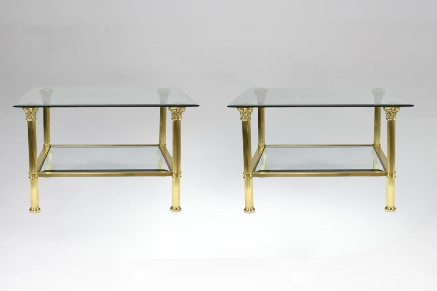 Une paire de tables basses conçues dans le style Hollywood Regency français, attribuées à Maison Jansen dans les années 1980. Chaque table est dotée d'étagères en verre à deux niveaux, ornées de détails sculptés rappelant les colonnes classiques. Fabriquées en laiton, ces tables se distinguent comme de fantastiques objets de collection pour les passionnés et les décorateurs.