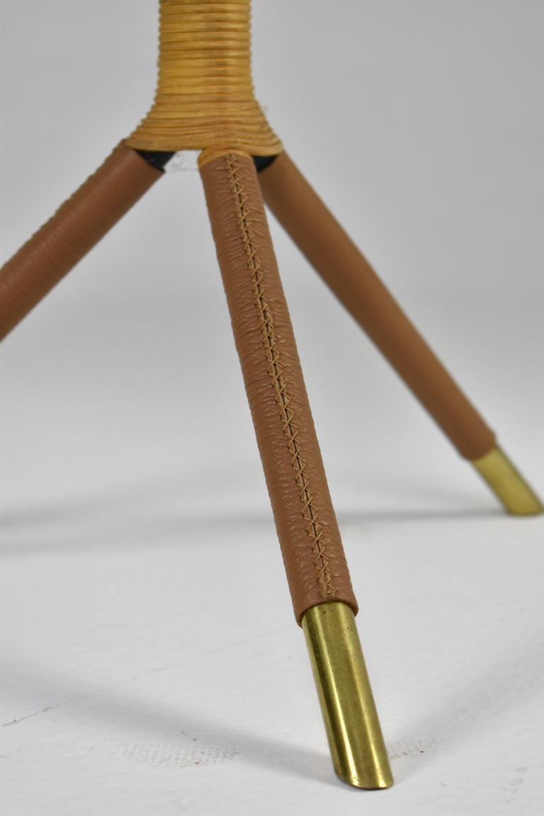 The tripod steel frame is sheathed in hand-stitched leather, using traditional saddle-stitch techniques commonly found in fine leather goods. This level of leather craftsmanship is a hallmark of our studio. The legs are finished with solid brass sabots, adding weight and contrast.