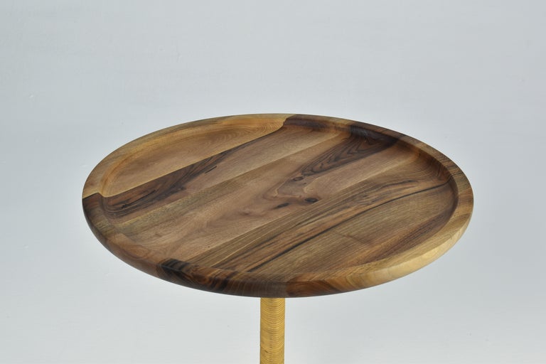 The tabletop is carved from solid teak wood, subtly hollowed to form a soft tray profile. The central stem is wrapped in sustainably sourced natural rattan core, coiled by hand to create a surface movement.