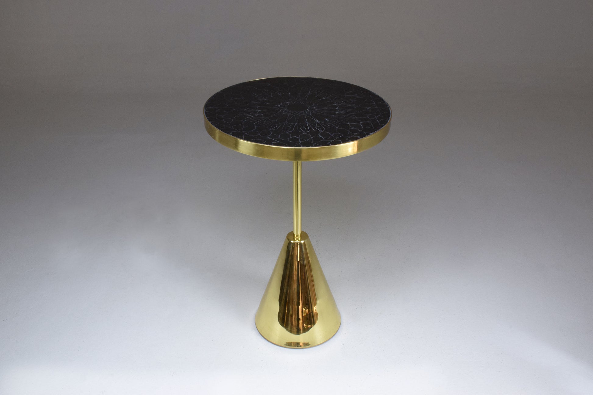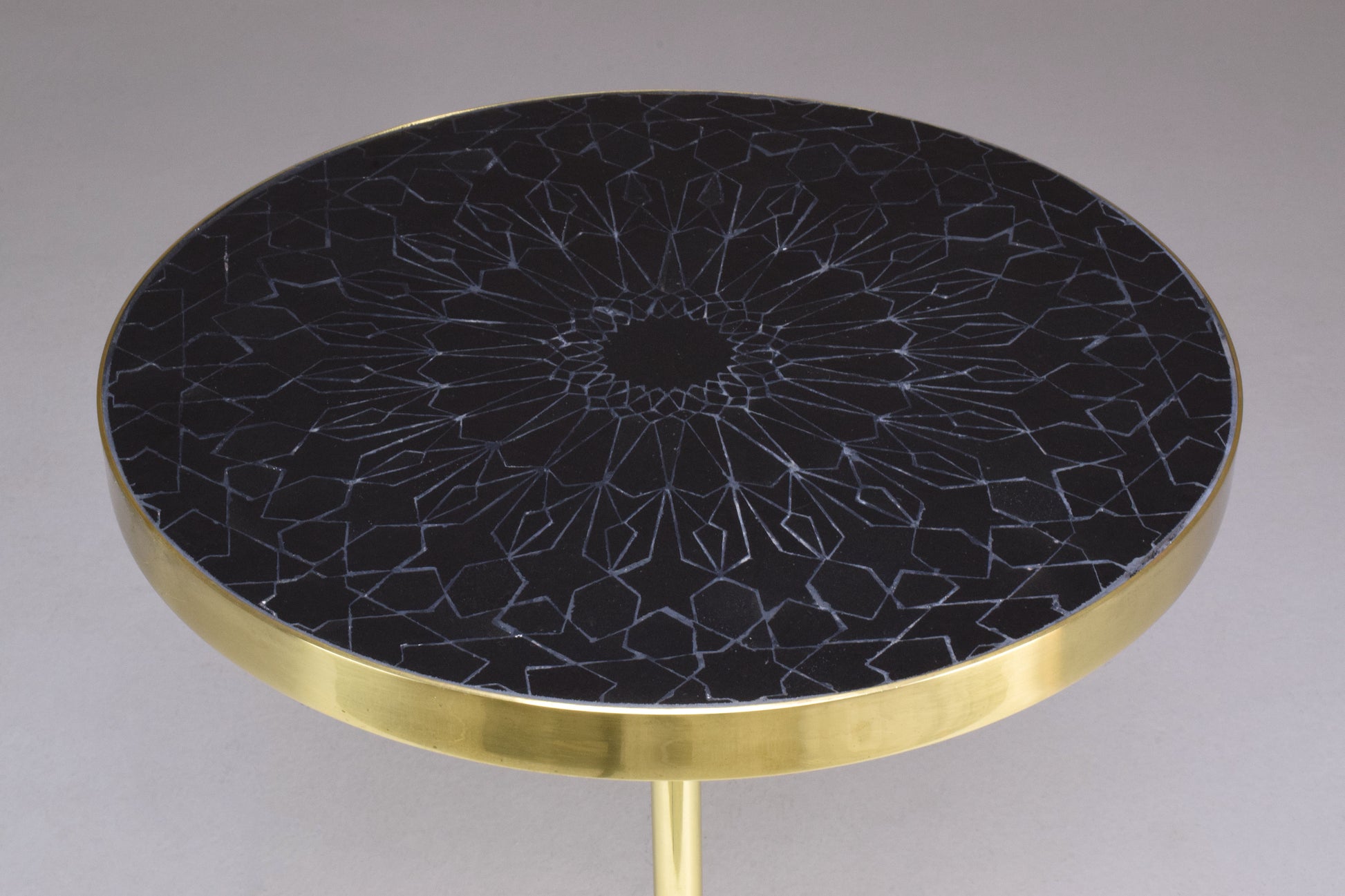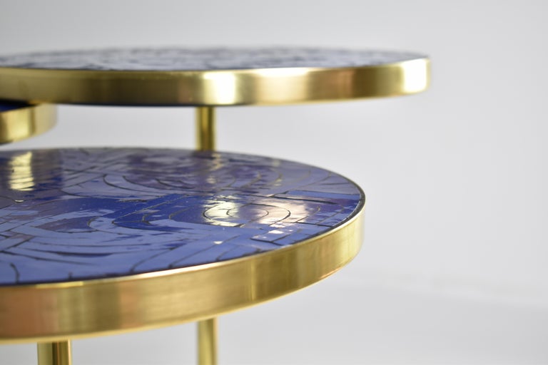 Un guéridon personnalisable composé d'une structure en laiton massif et conçu avec un plateau en mosaïque de zellige complexe fabriqué à la main avec un travail minutieux par des artisans marocains. Différentes hauteurs et dimensions permettent diverses possibilités d'agencement.