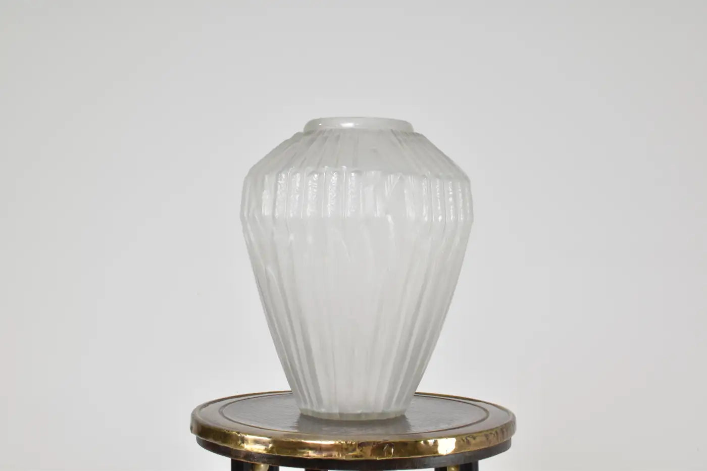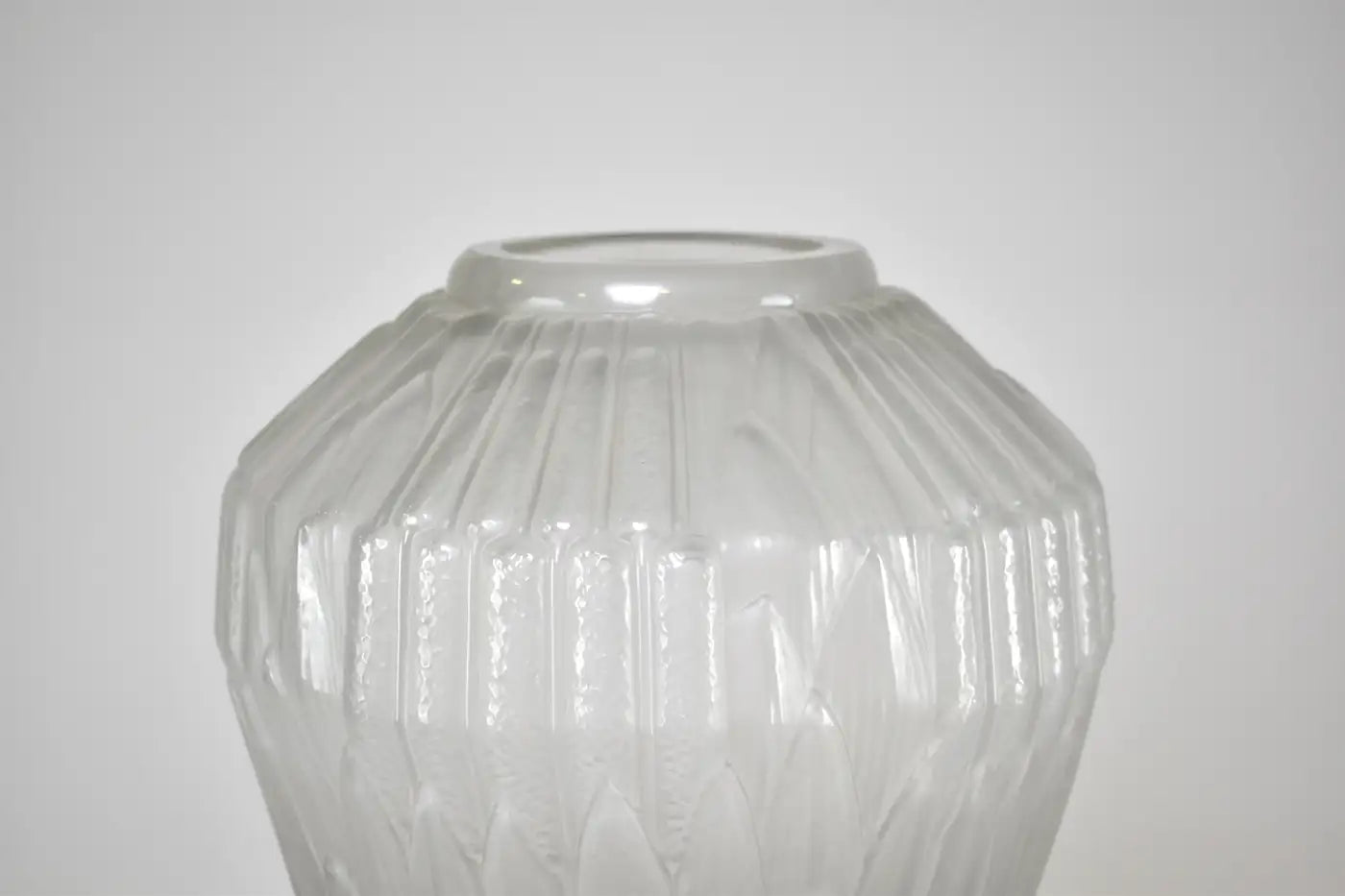 Frosted glass vase titled “Roseaux”, designed by André Hunebelle in France, circa 1930. Its stylized relief pattern reflects the sculptural precision and light play that defined Hunebelle’s work in the interwar period. A timeless collector’s piece with strong decorative presence.