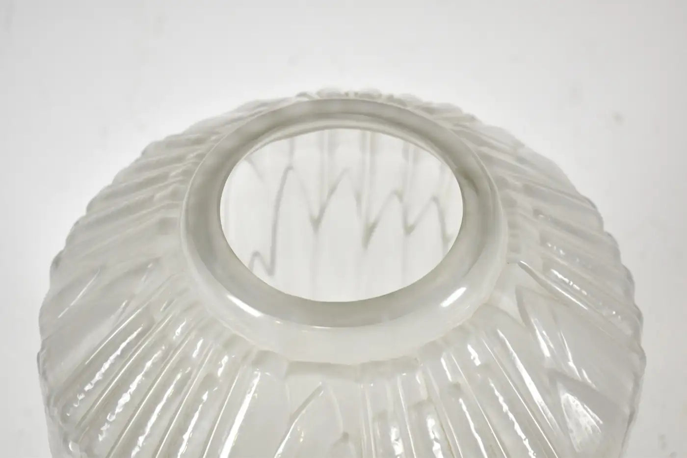 This 1930s frosted glass vase by André Hunebelle captures the refined geometry and lyrical minimalism of French Art Deco at its best. The “Roseaux” (“Reeds”) pattern evokes gentle movement in nature while remaining sharply architectural—a hallmark of Hunebelle’s design language.