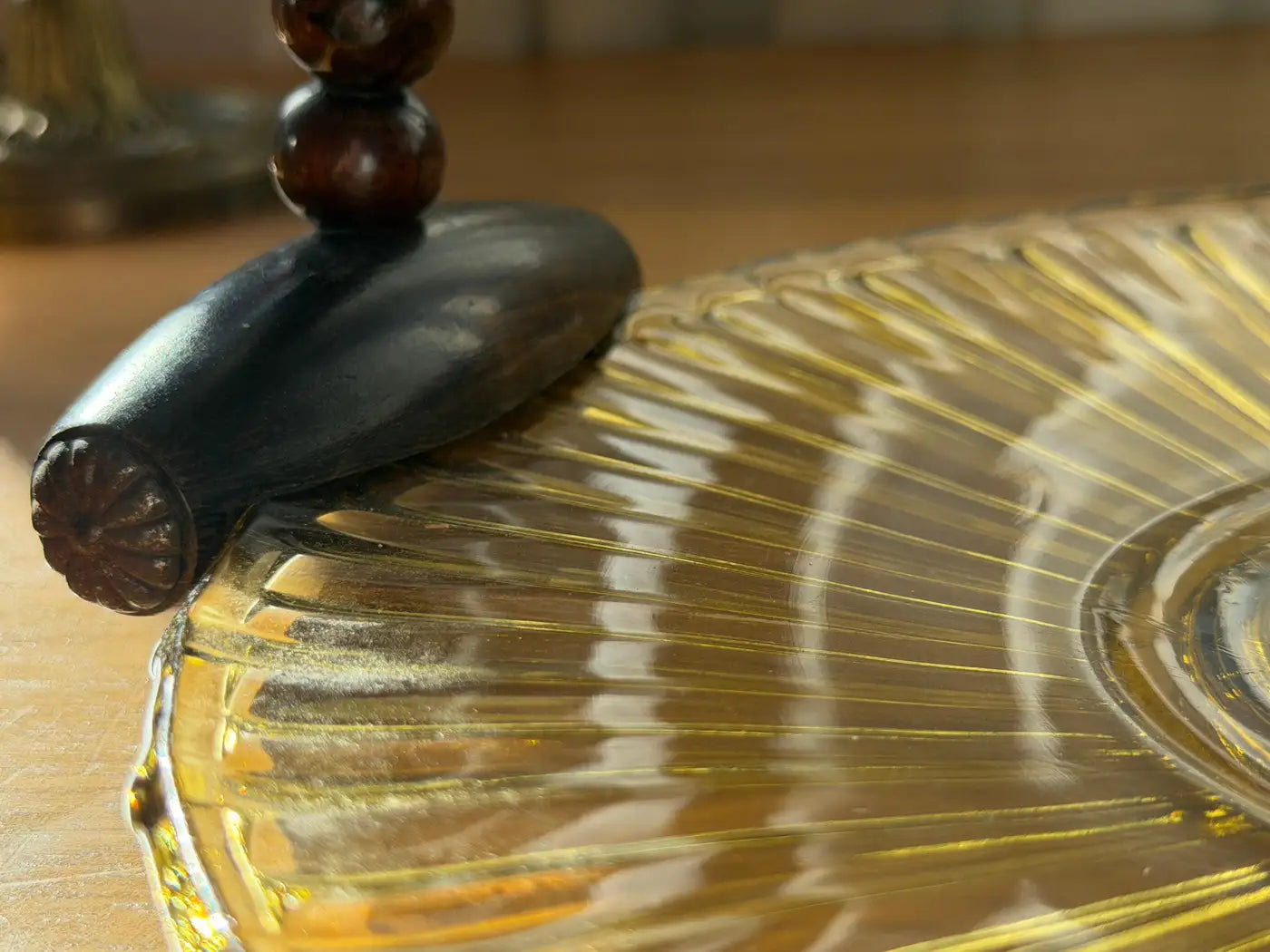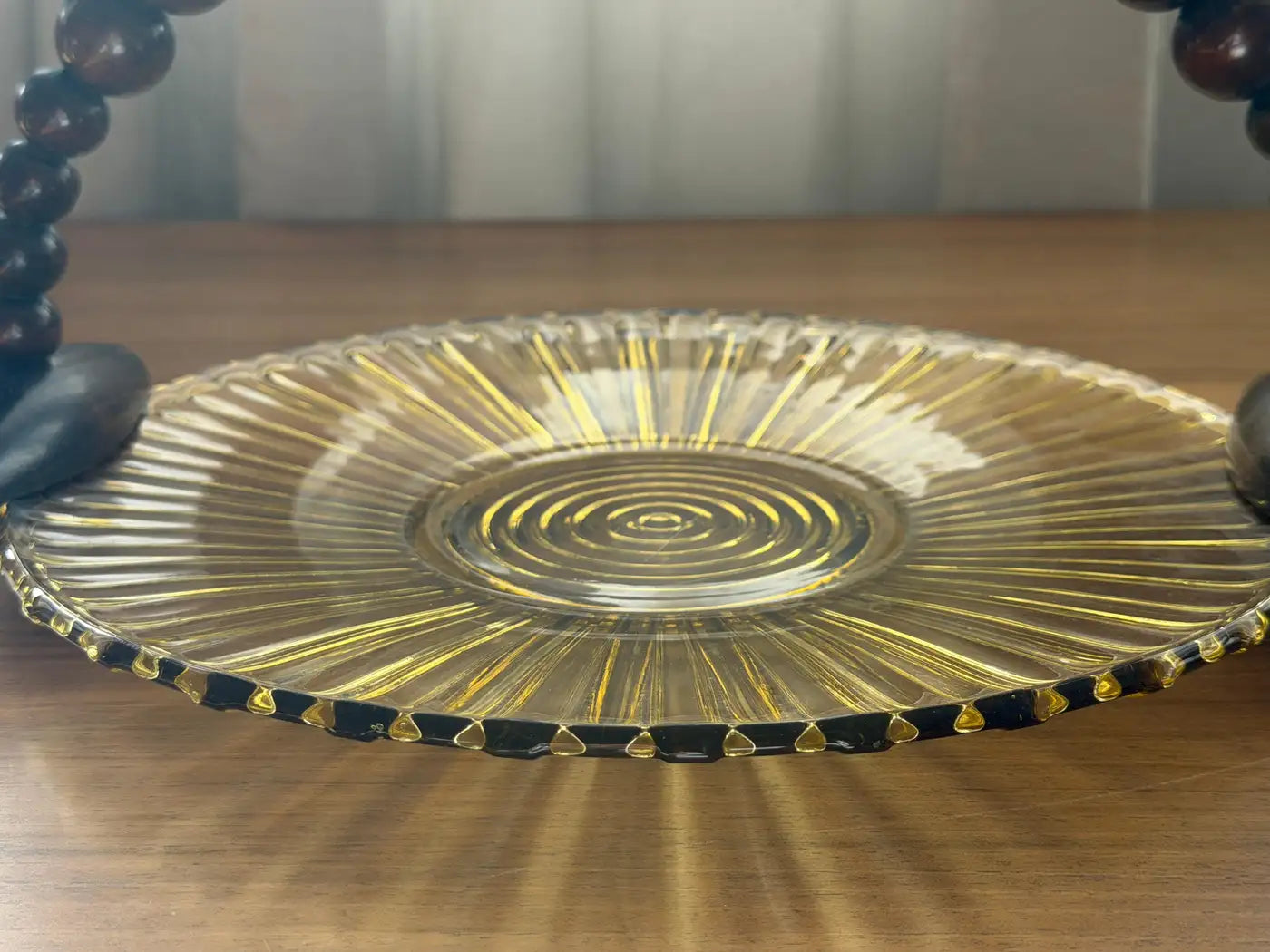 Sunburst ribbed amber glass with hand-gilded rings, finished with a beaded wooden swing handle on carved terminals. Beautiful for petits fours, fruit, or as a sculptural decorative piece - the handle folds flat when not in use.