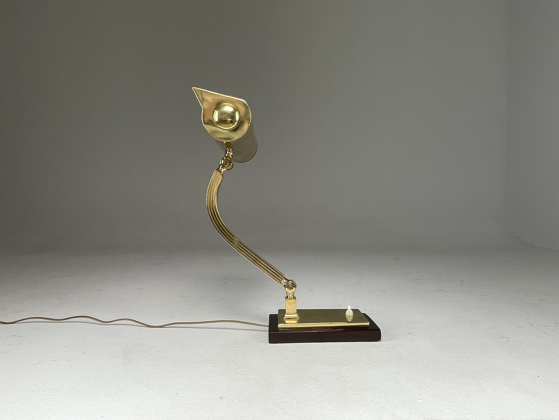 Twentieth-century vintage table or office lamp crafted with quality solid brass structure and a wooden base. The stylish design is highlighted by an adjustable arm and shade. Italy, the 1930s.