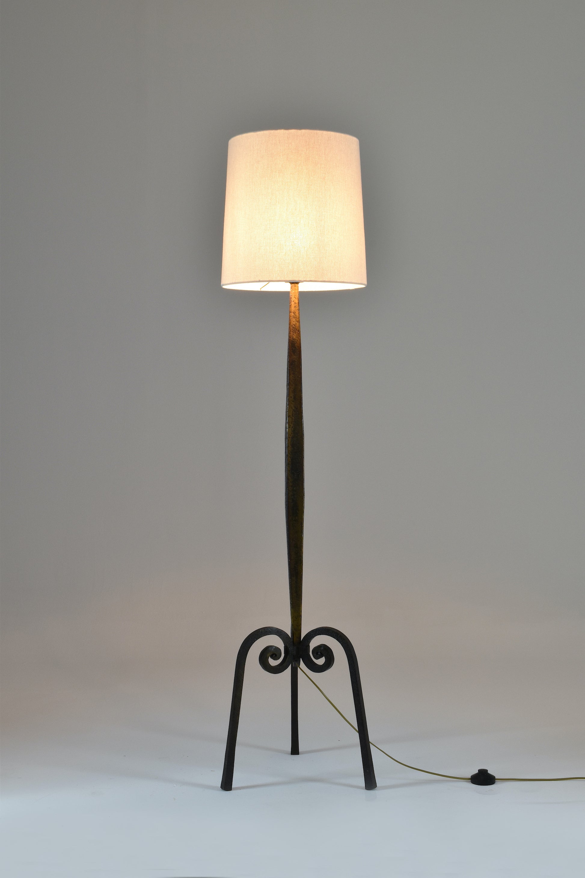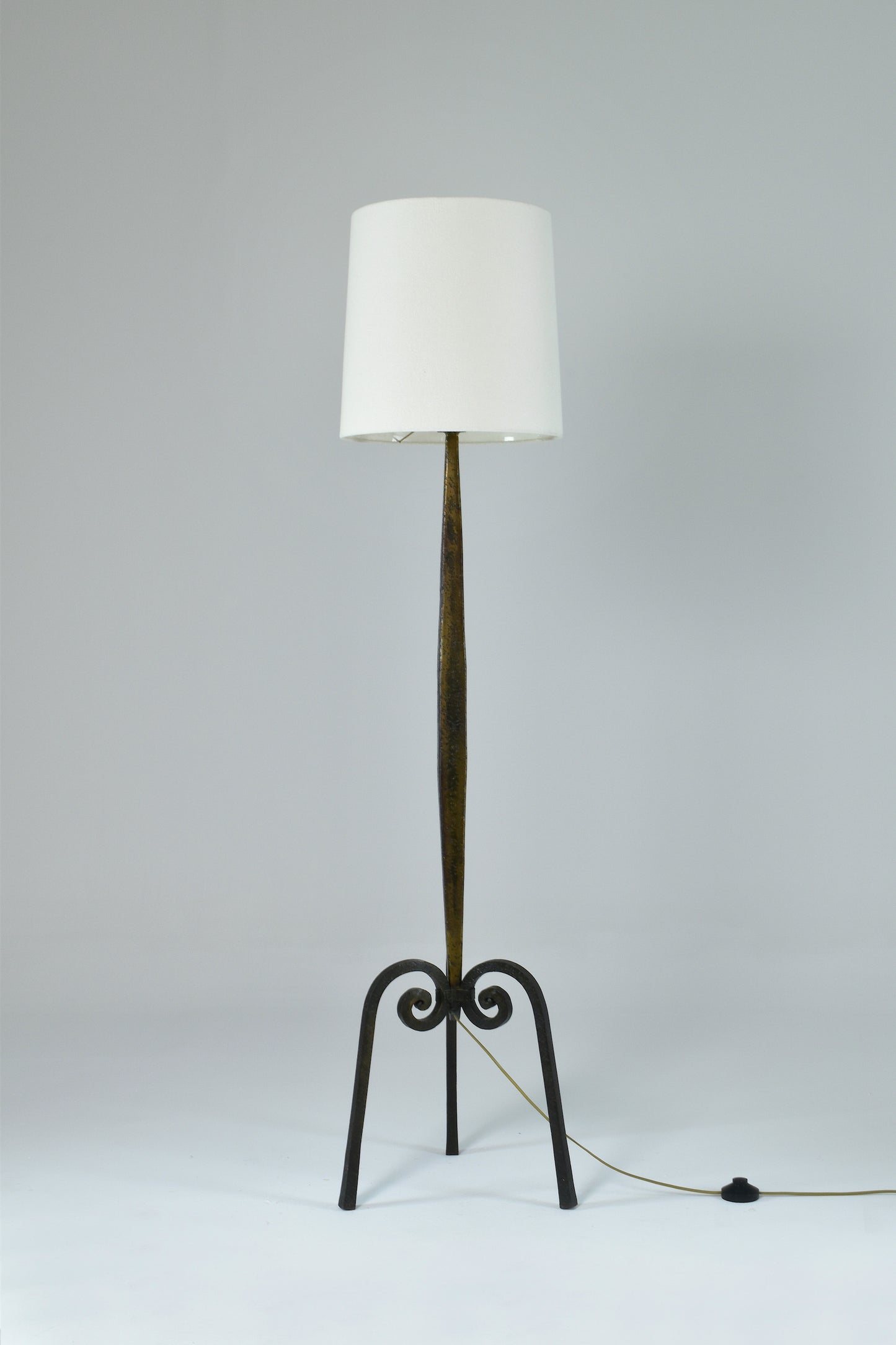 A beautiful early 20th-century floor lamp standing on a tripod base with curved details. The structure is in bronze-colored wrought iron highlighted by a hammered finish. This piece has been newly electrified with a push-type button. It is also restored with a made-to-measure cylinder fabric shade.