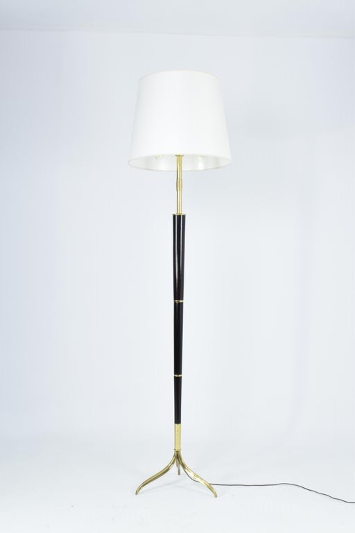A very tall and elegant 1940s Italian vintage floor lamp designed by Giuseppe Ostuni and exceptionally handcrafted out of wood and brass. The piece stands on a sleek tripod base. The brass details combined with the warm veneer wood create an interplay of textures and a balance of noble elements.