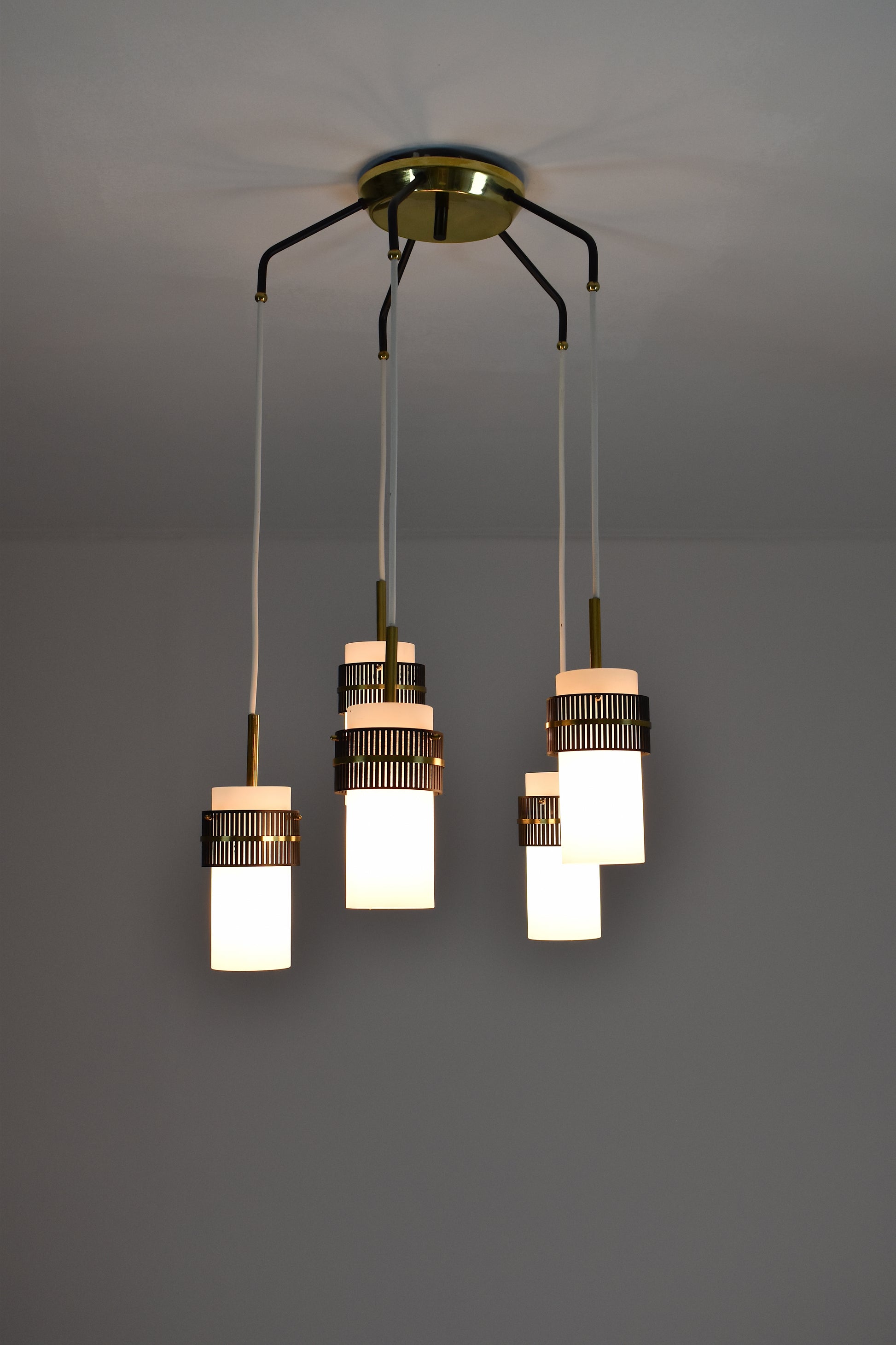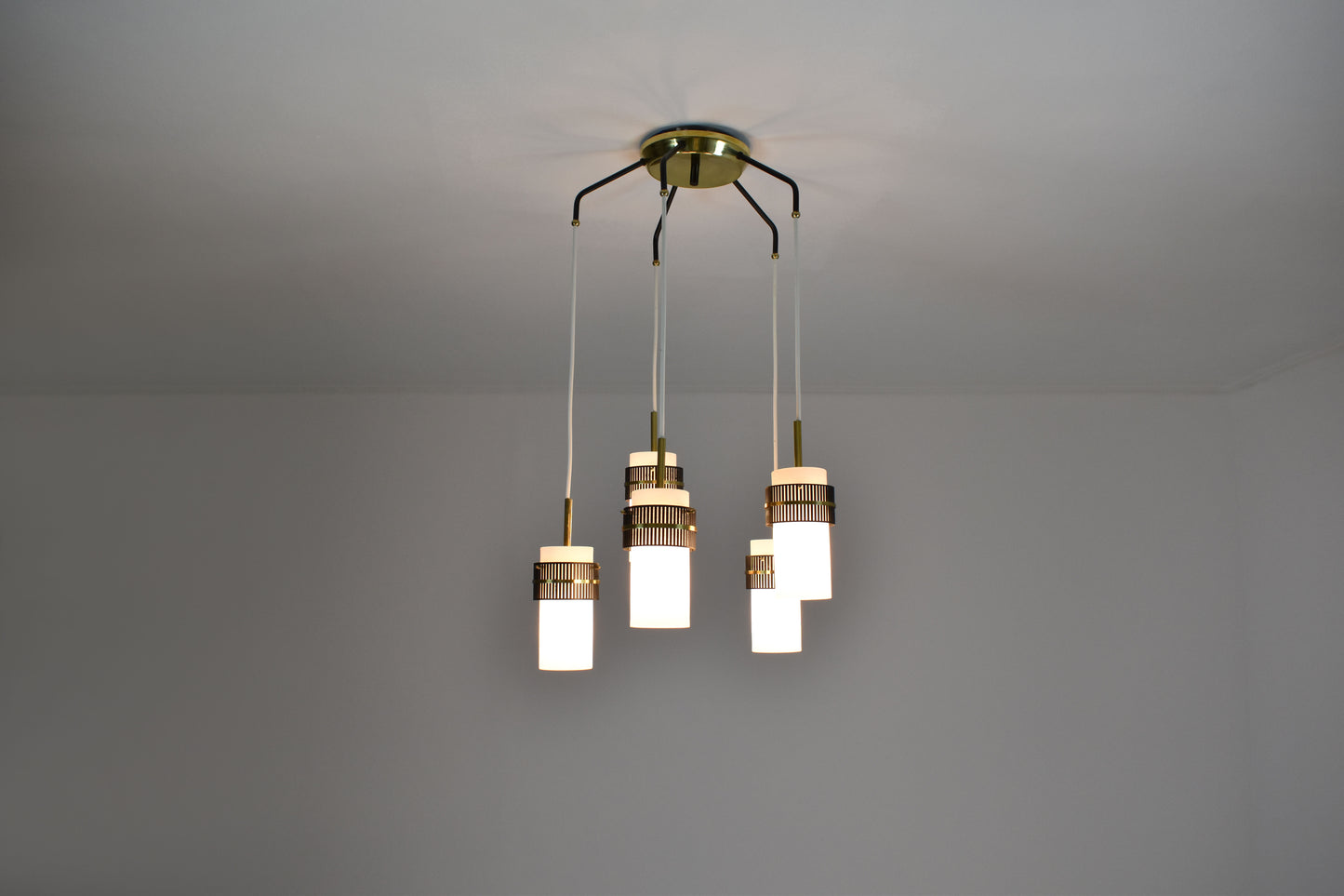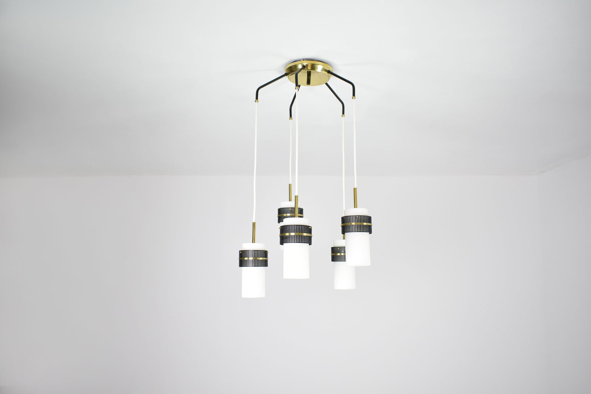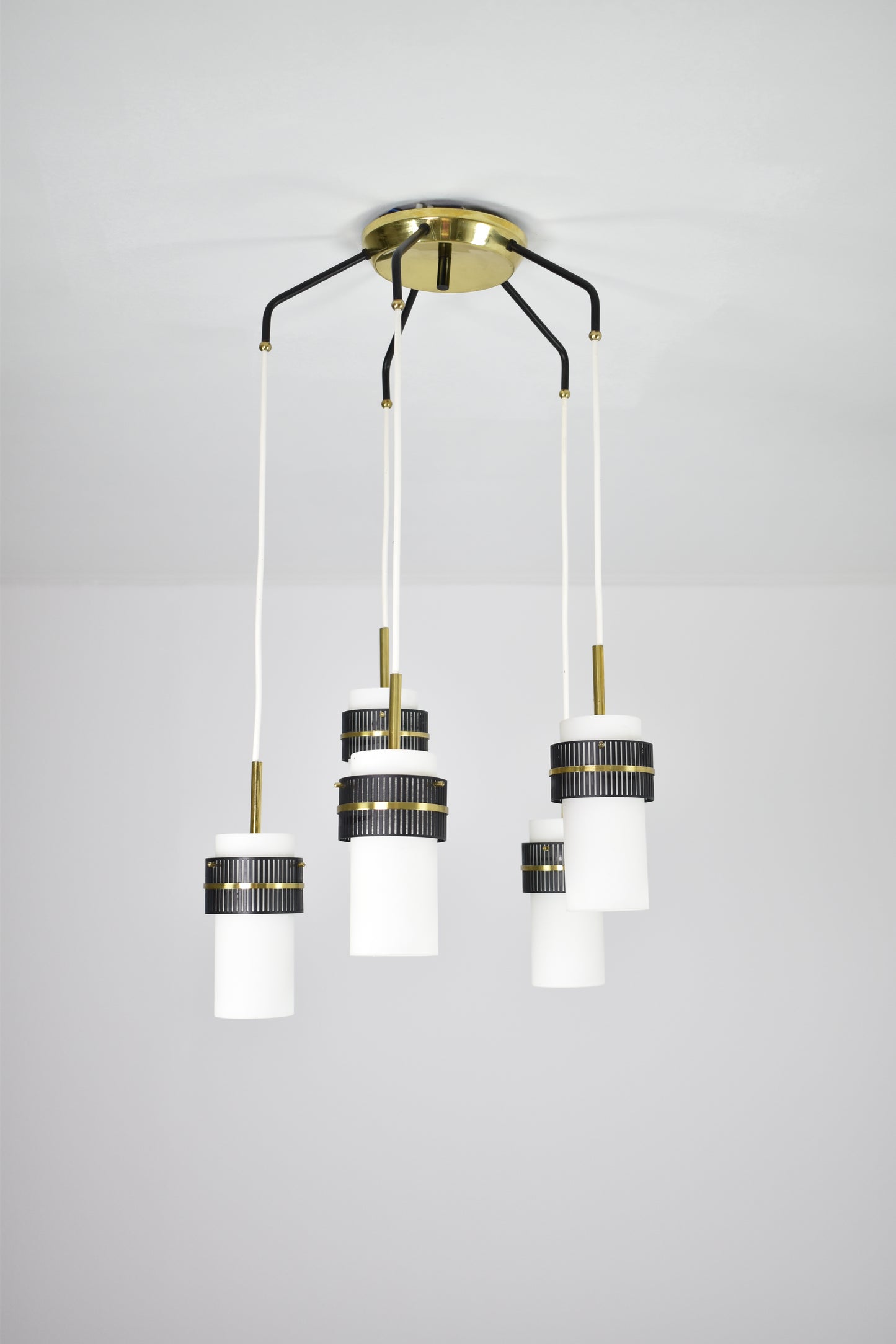 An elegant 20th-century vintage chandelier or pendant from the 1950s in the style of Stilnovo. This statement piece is composed of 5 lights designed with opaline glass shades complimented by stunning brass and metal black perforated details that hold the shades to the strings. It's a beautiful mid-century modern addition to any living space.