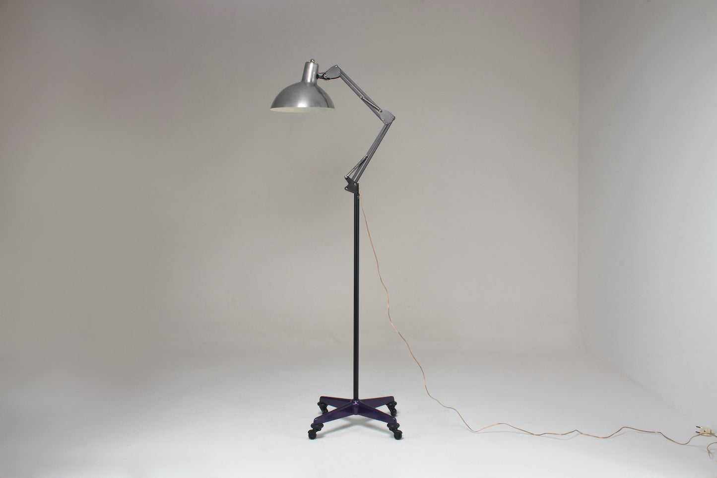 A super stylish 20th mid-century industrial French doctor's floor lamp of robust design. It is composed of a steel structure re-lacquered in purple and standing on rollers. The top of the stem articulates and the shade is made out of aluminum.